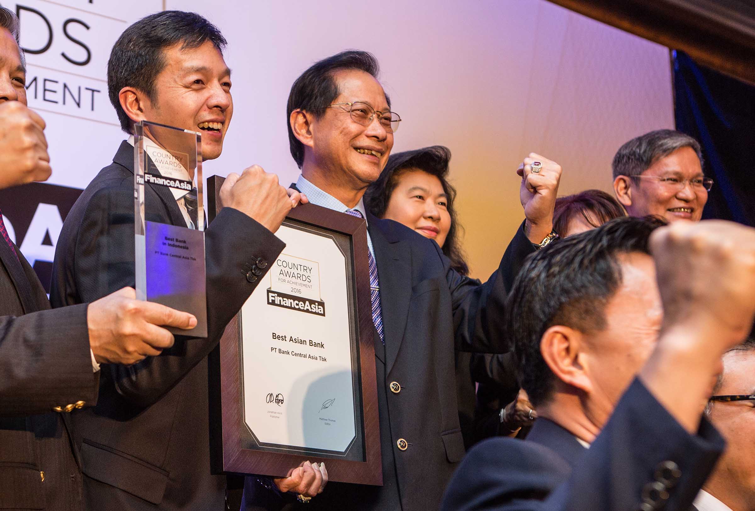Presiden Direktur PT Bank Cantral Asia Tbk (BCA),Jahja Setiaatmadja(kiri) seusai menerima penghargaan Best Asian Bank dalam FinanceAsia Country Awards for Achievement 2016 di Singapura, Kamis (1/9).Selain predikat tersebut, BCA juga berhasil meraih penghargaan sebagai Best Bank in Indonesia.Penghargaan ini diberikan kepada perusahaan di bidang perbankan yang berhasil mencapai kinerja perusahaan terbaik di dalam negeri maupun tingkat Asia.Pemenang pada penghargaan ini dinilai berdasarkan pencapaian kinerja perusahaan yang berhasil menjawab tantangan dari kondisi perekonomian perbankan saat ini.