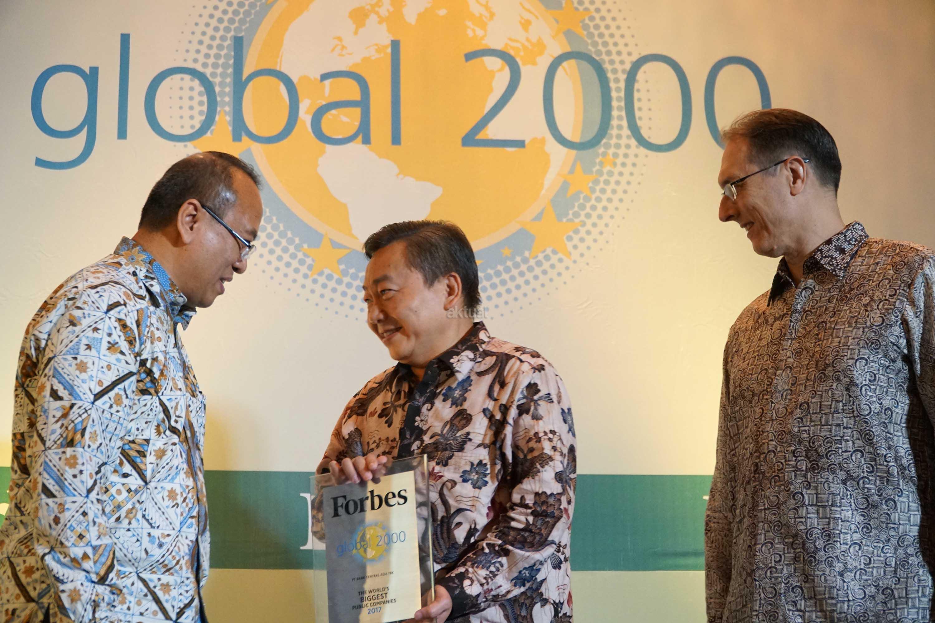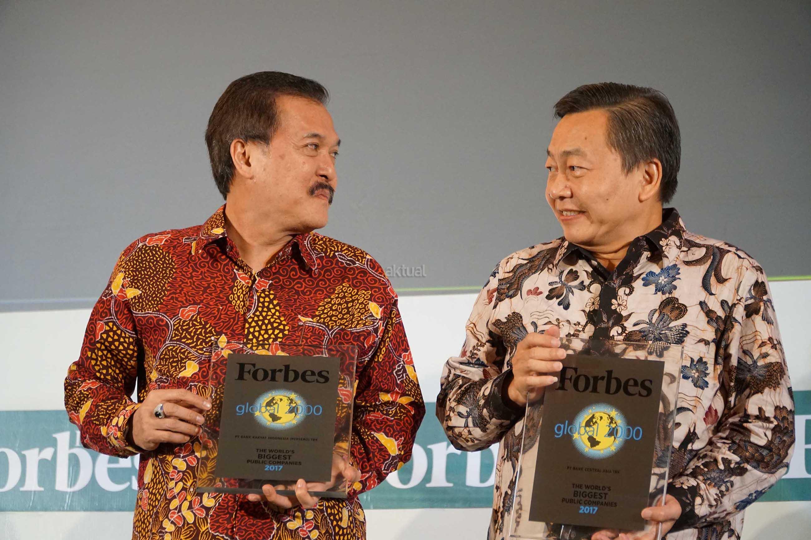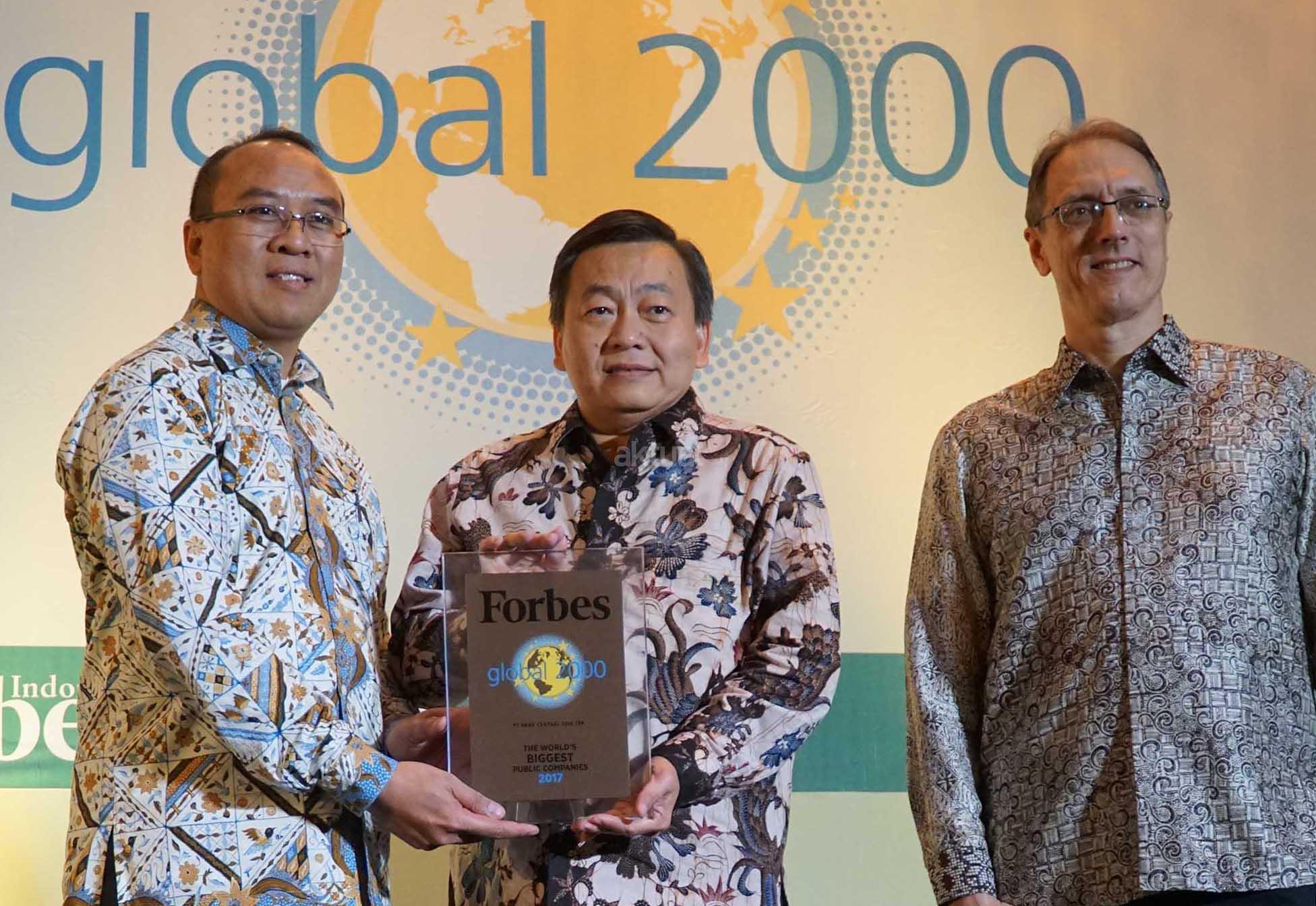 Direktur PT Bank Central Asia Tbk, Santoso (tengah) menerima penghargaan The World's Biggest Public Companies 2017 yang diserahkan oleh Chief Editorial Advisor Forbes Indonesia,Justin Doebele (kanan) dan Direktur MasterCard Indonesia, Tommy Singgih (kiri) dalam ajang Forbes Global 2000 Awards 2017 di Hotel Le Meredien, Jakarta, Kamis (27/7) malam. Masuk jajaran 2000 Perusahaan terbesar Dunia, BCA menduduki peringkat 564 di tahun 2017 dari sebelumnya peringkat 620 di tahun 2016. AKTUAL/Eko S Hilman
