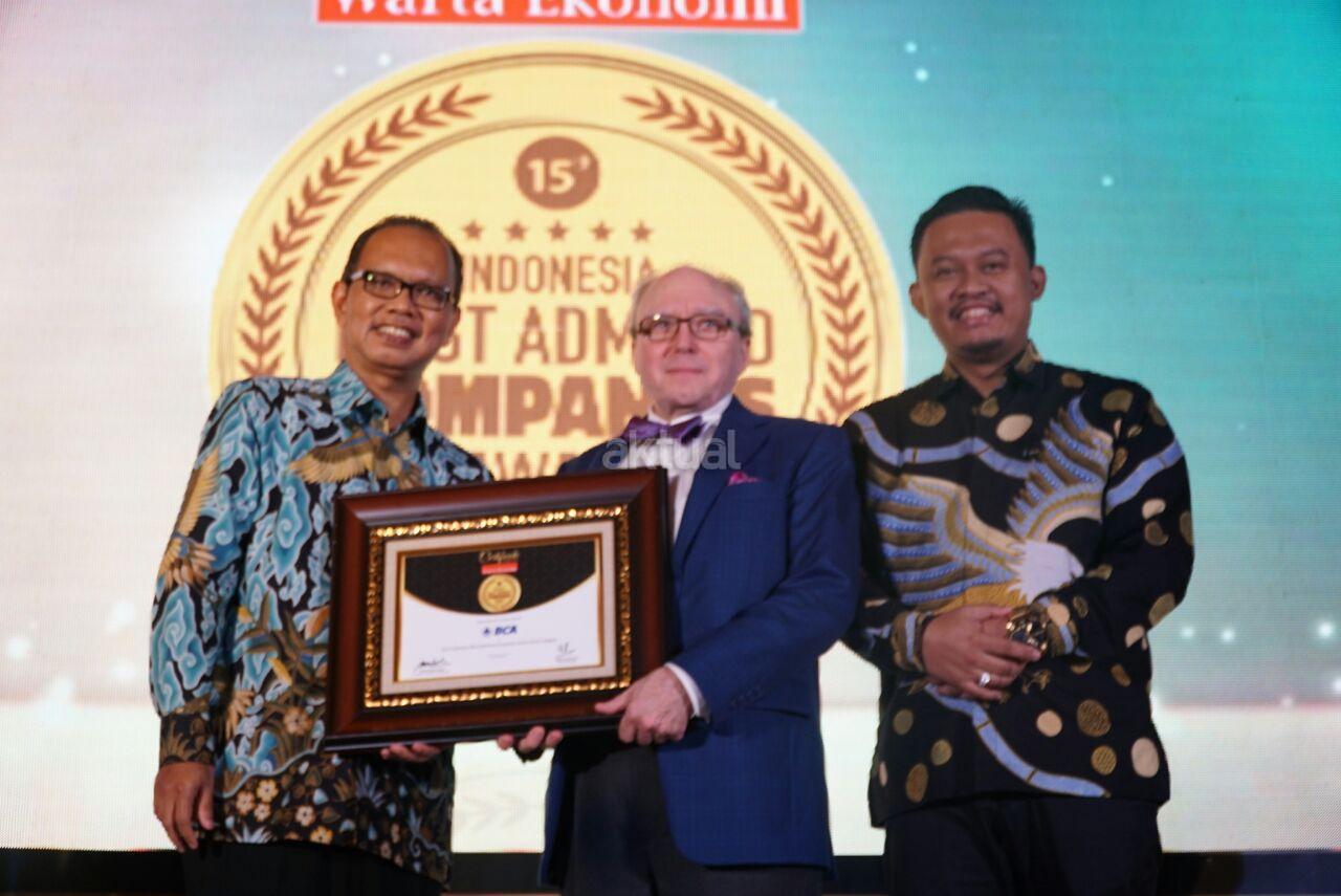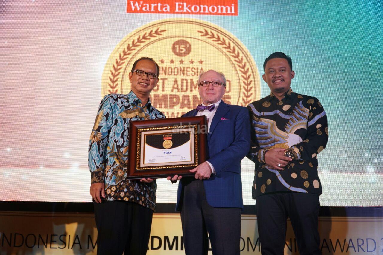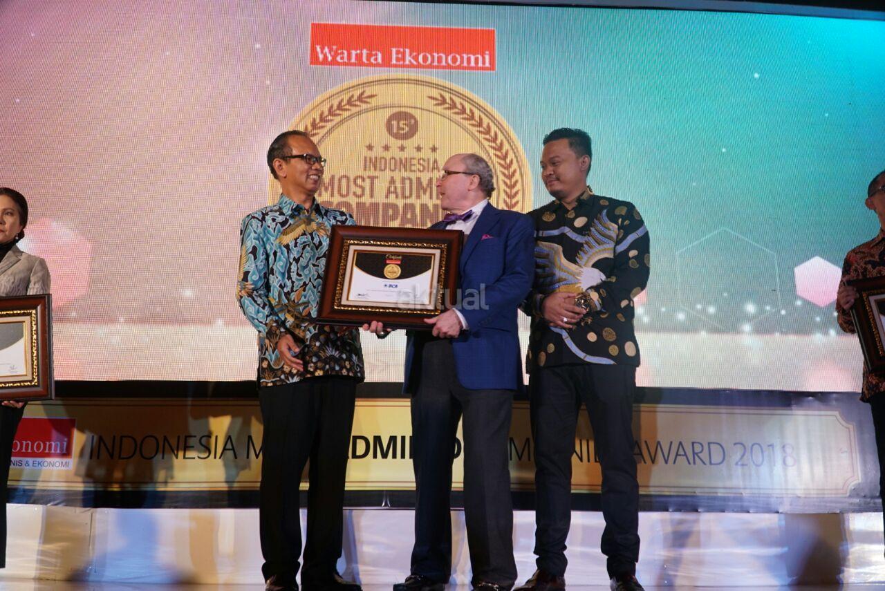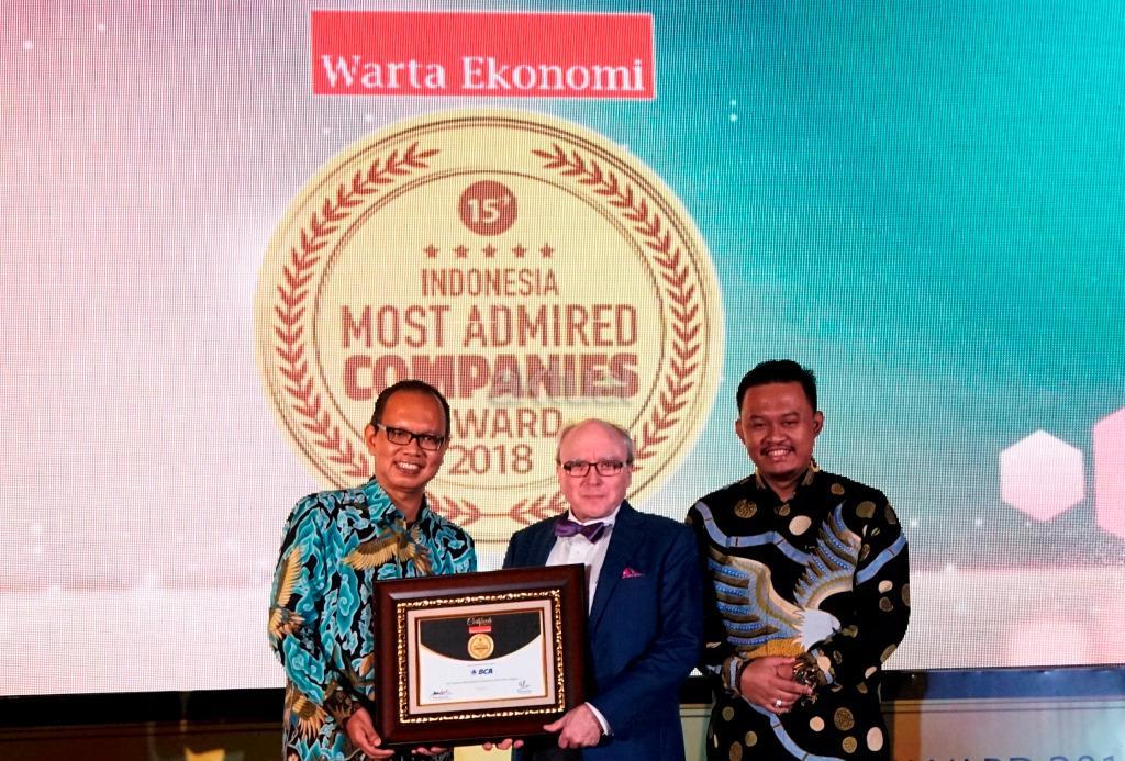 Wakil Presiden Direktur PT Bank Central Asia Tbk (BCA) Eugene K. Galbraith (tengah) menerima penghargaan Indonesia Most Admired Company Award 2018 yang diserahkan oleh Pemimpin Redaksi Warta Ekonomi Muhammad Ihsan (kiri) dan Pemimpin Perusahaan Warta Ekonomi Bram S. Putro (kanan) dalam ajang Indonesia Most Admired Companies Award 2018 di Hotel Mulia, Jakarta, Rabu (9/5/18). Penghargaan ini diberikan sebagai apresiasi kepada perusahaan yang berhasil menanamkan citra yang sangat baik dan kinerja yang memuaskan di sektor perbankan dan di masyarakat luas. AKTUAL/Eko S Hilman