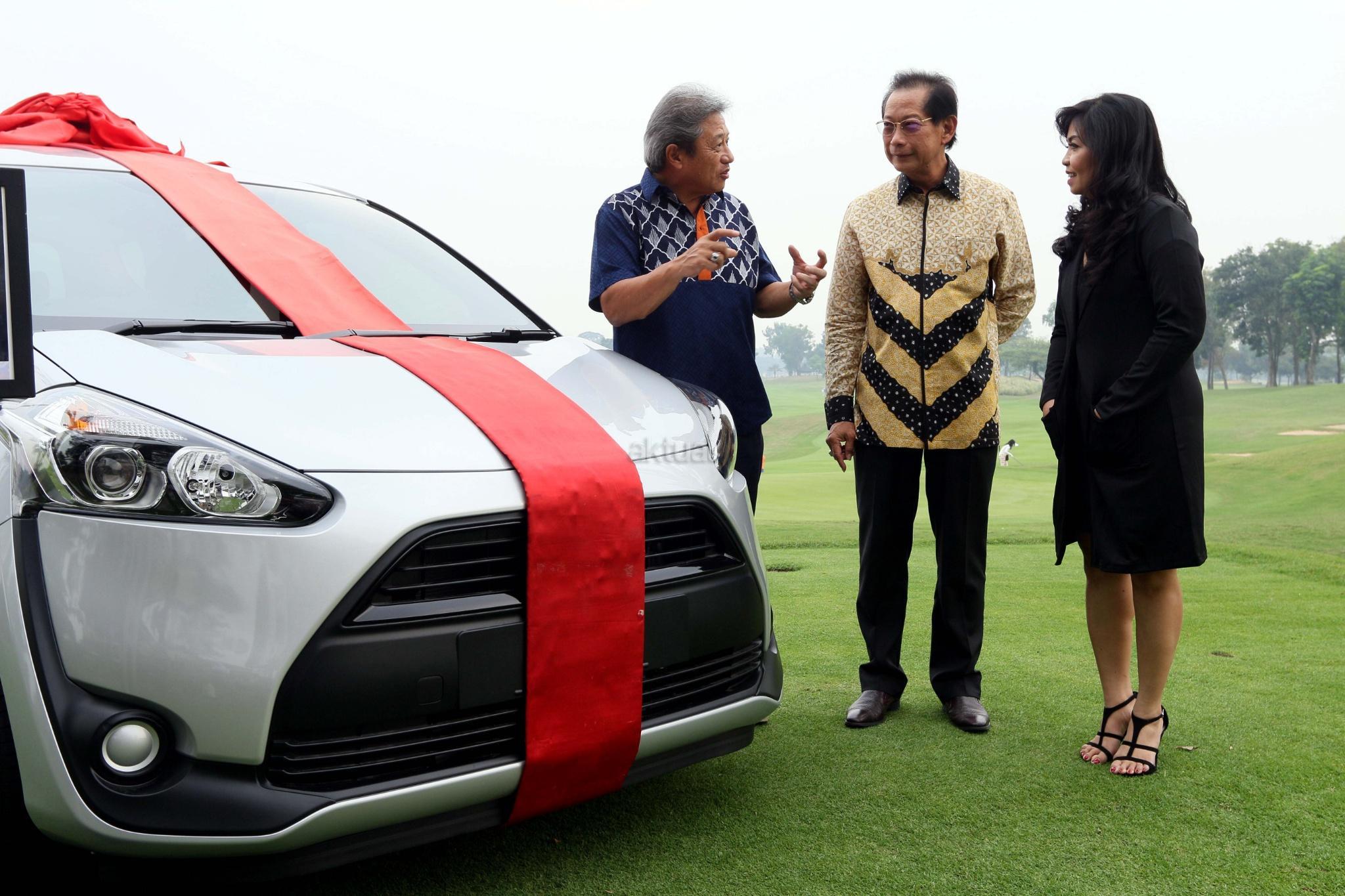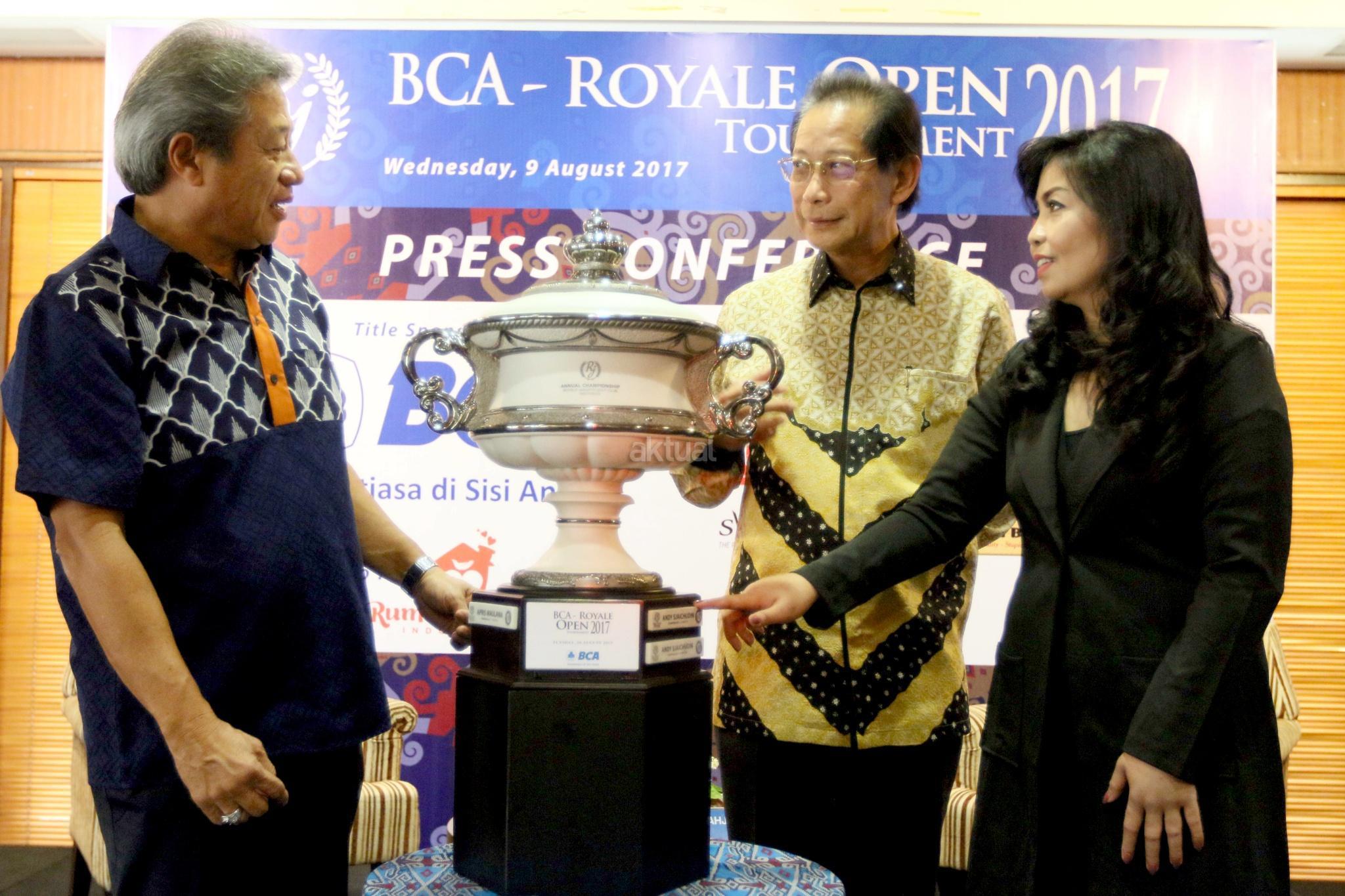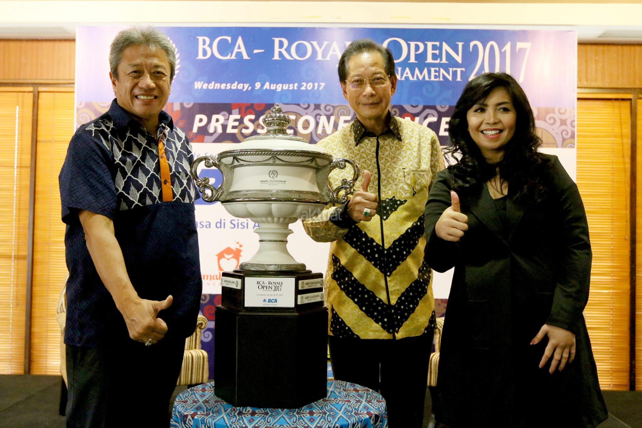 Presiden Direktur PT Bank Central Asia Tbk (BCA) Jahja Setiaatmadja(tengah) bersama CEO Royale Jakarta Golf Club George Chandra (kiri) dan Founder Rumah Yayasan Rumah Harapan Indonesia , Valencia Mieke (kanan) berpose di depan tropi turnamen usai jumpa pers BCA Royal Open Tournament 2017 di Jakarta , Rabu (9/8).BCA memberikan dukungan penuh dalam gelaran turnamen golf guna perkembangan olahraga ditanah air.dalam turnamen ini para peserta turnamen berkesempatan memberikan donasi kepada anak anak dari yayasan Rumah Harapan Indonesia yang saat ini tengah menjalani pengobatan. AKTUAL/Eko S Hilman