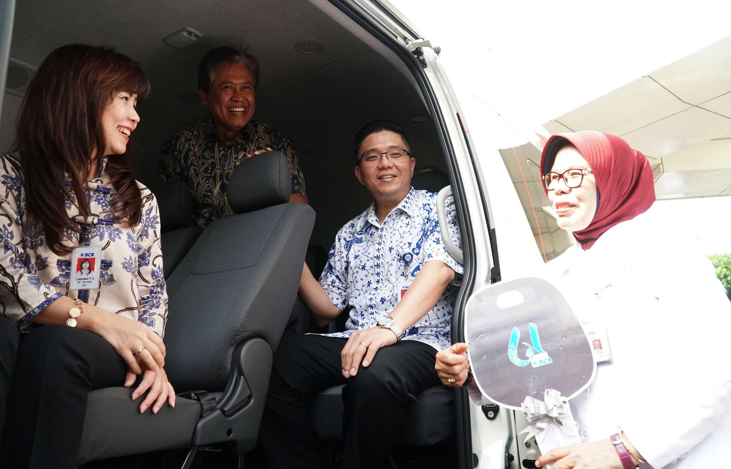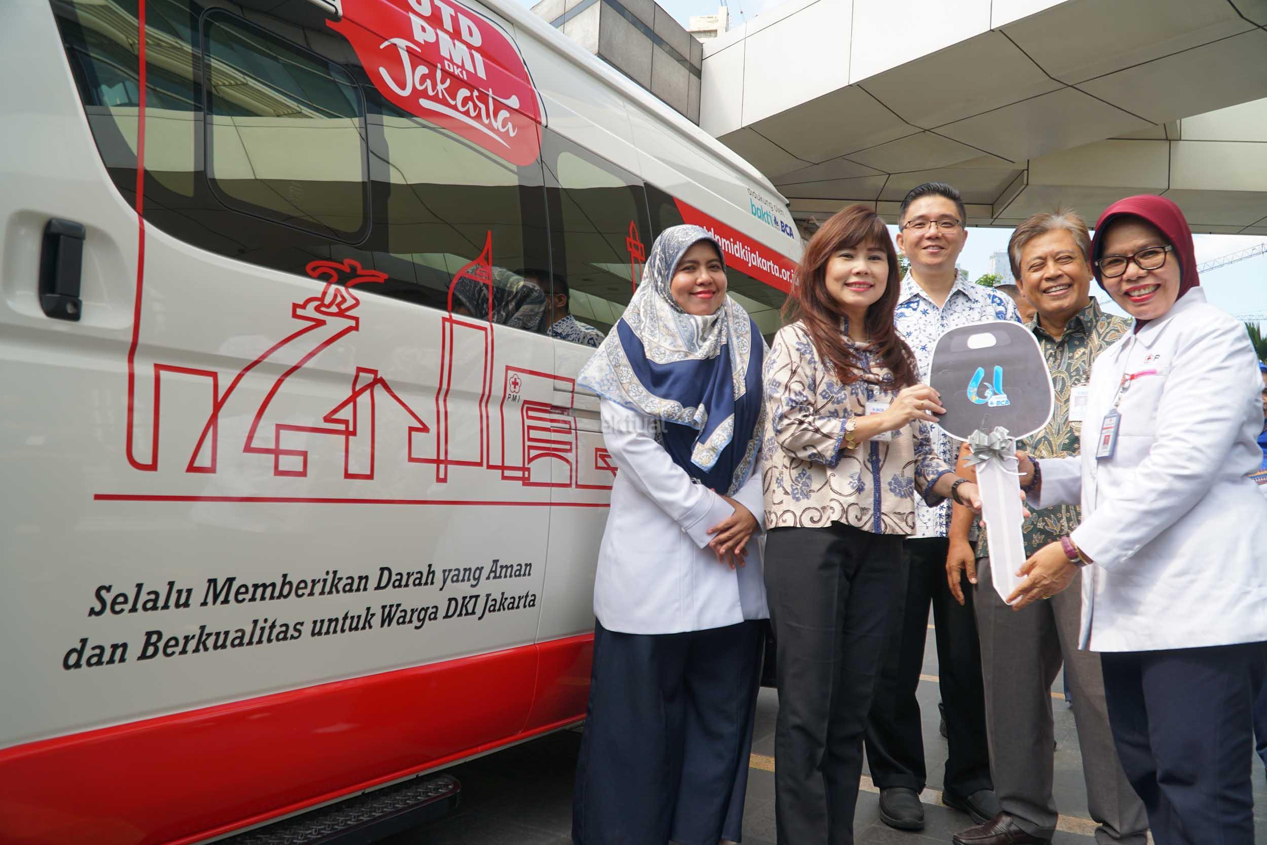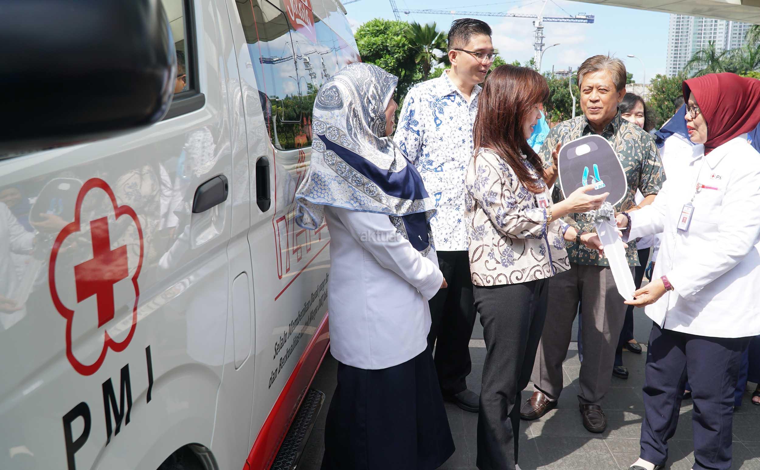 Direktur BCA Lianawati Suwono (kedua dari kiri) menyerahkan kunci secara simbolis kepada Kepala UTD PMI DKI Jakarta dr. Salimar Salim, MARS (kanan) disaksikan oleh Sekretaris Perusahaan BCA Jan Hendra (kedua kiri), Senior Vice President Corporate Social Responsibility (CSR) BCA Sapto Rachmadi (kedua kanan) di Jakarta (21/02). BCA menyerahkan 1 unit mobil operasional untuk PMI tepat di Hari Ulang Tahun yang ke-61 hari ini untuk memfasilitasi kegiatan donor darah setiap 3 bulan sekali.. AKTUAL/Eko S Hilman