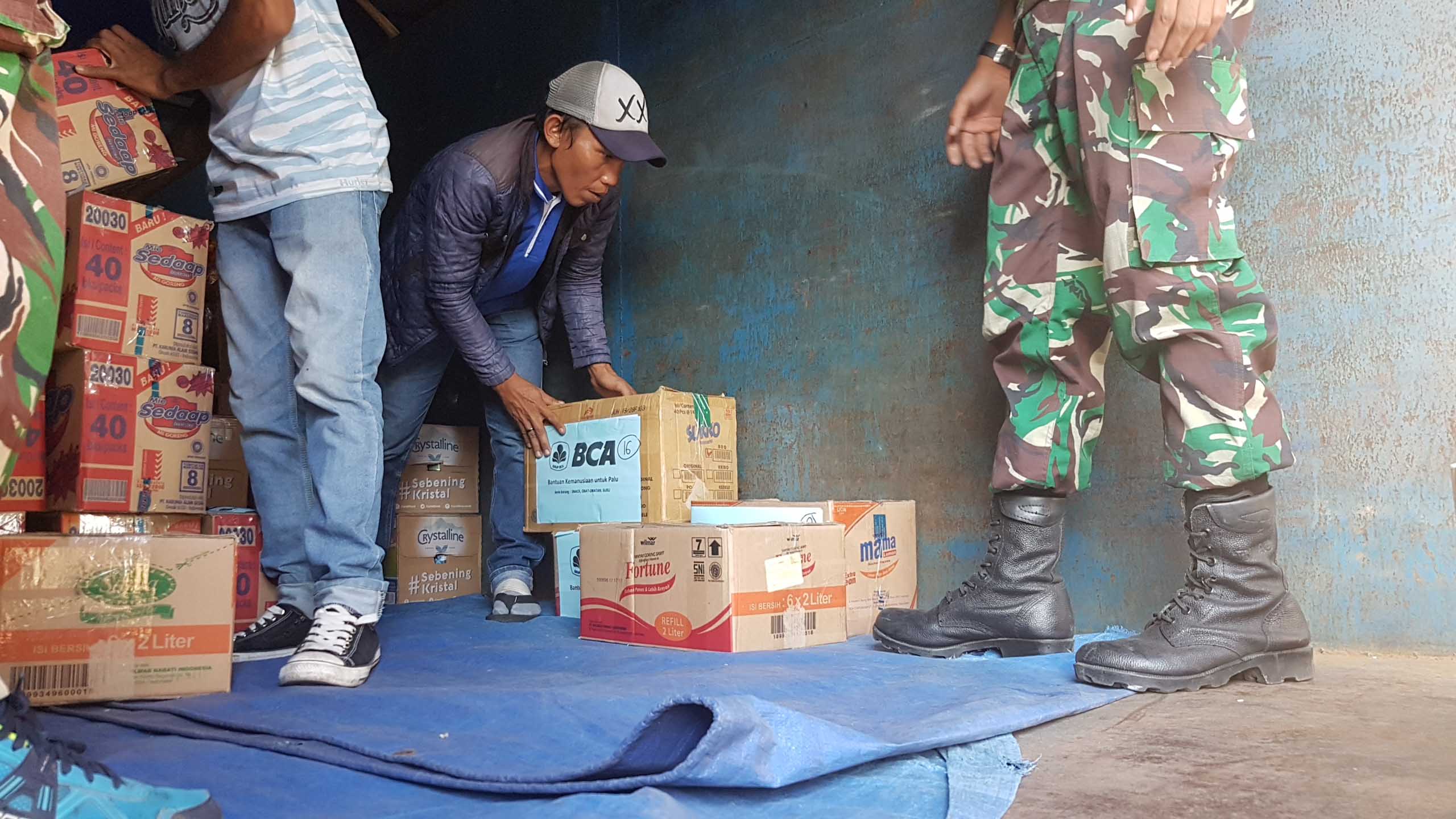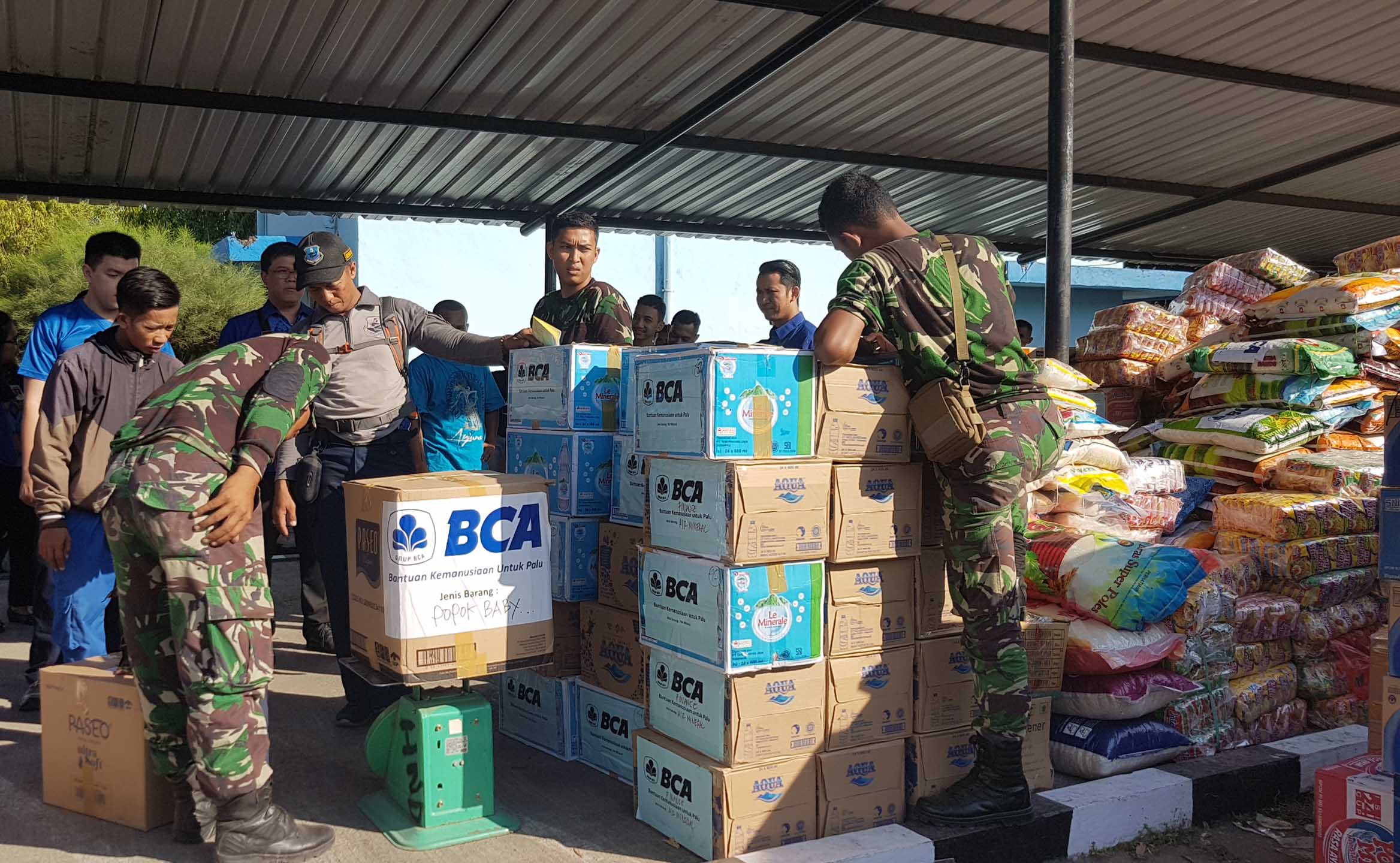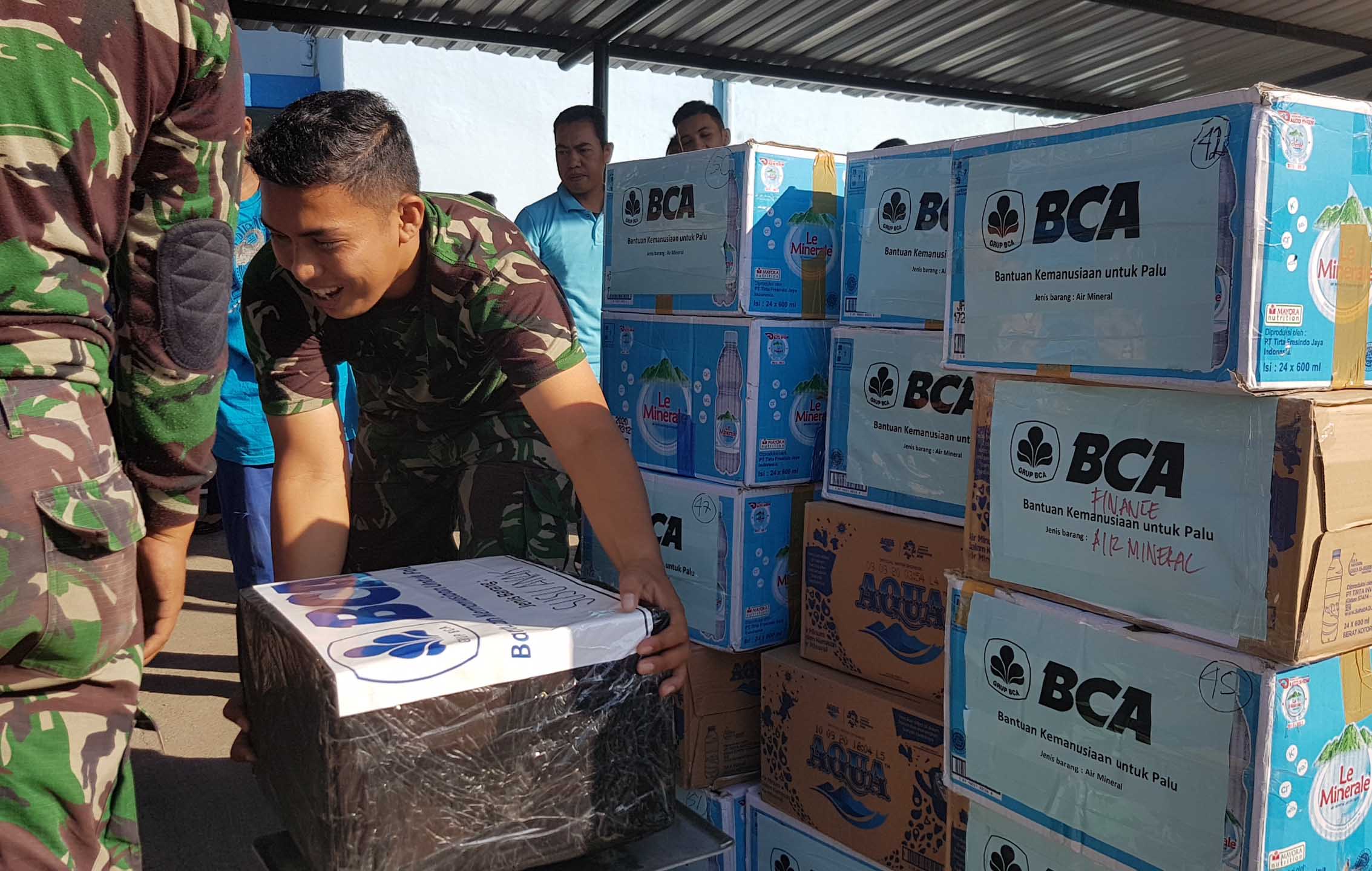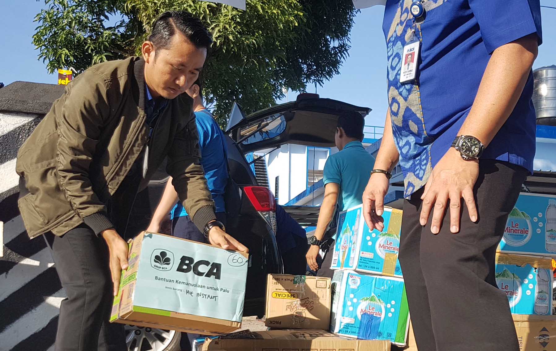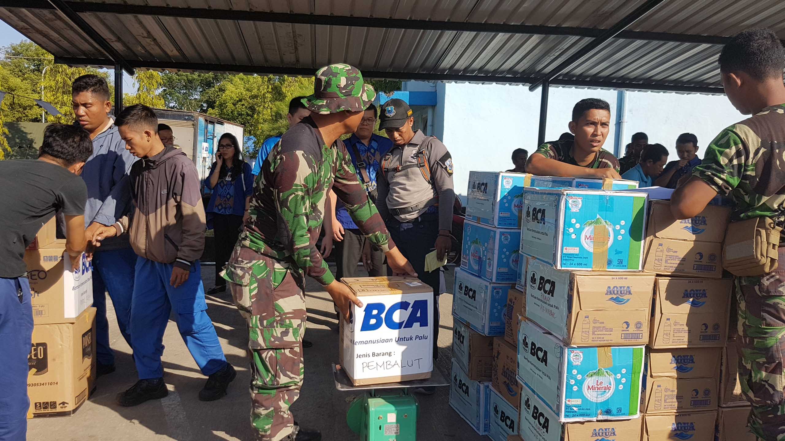 BCA dan BCA Syariah menyerahkan donasi berupa kebutuhan pokok berupa air mineral, obat-obat, selimut, terpal serta tenda senilai Rp195juta sebagai wujud kepedulian kepada warga yang terkena dampak tsunami dan gempa bumi di Palu dan Donggala, Sulawesi Tengah. AKTUAL/Dok BCA