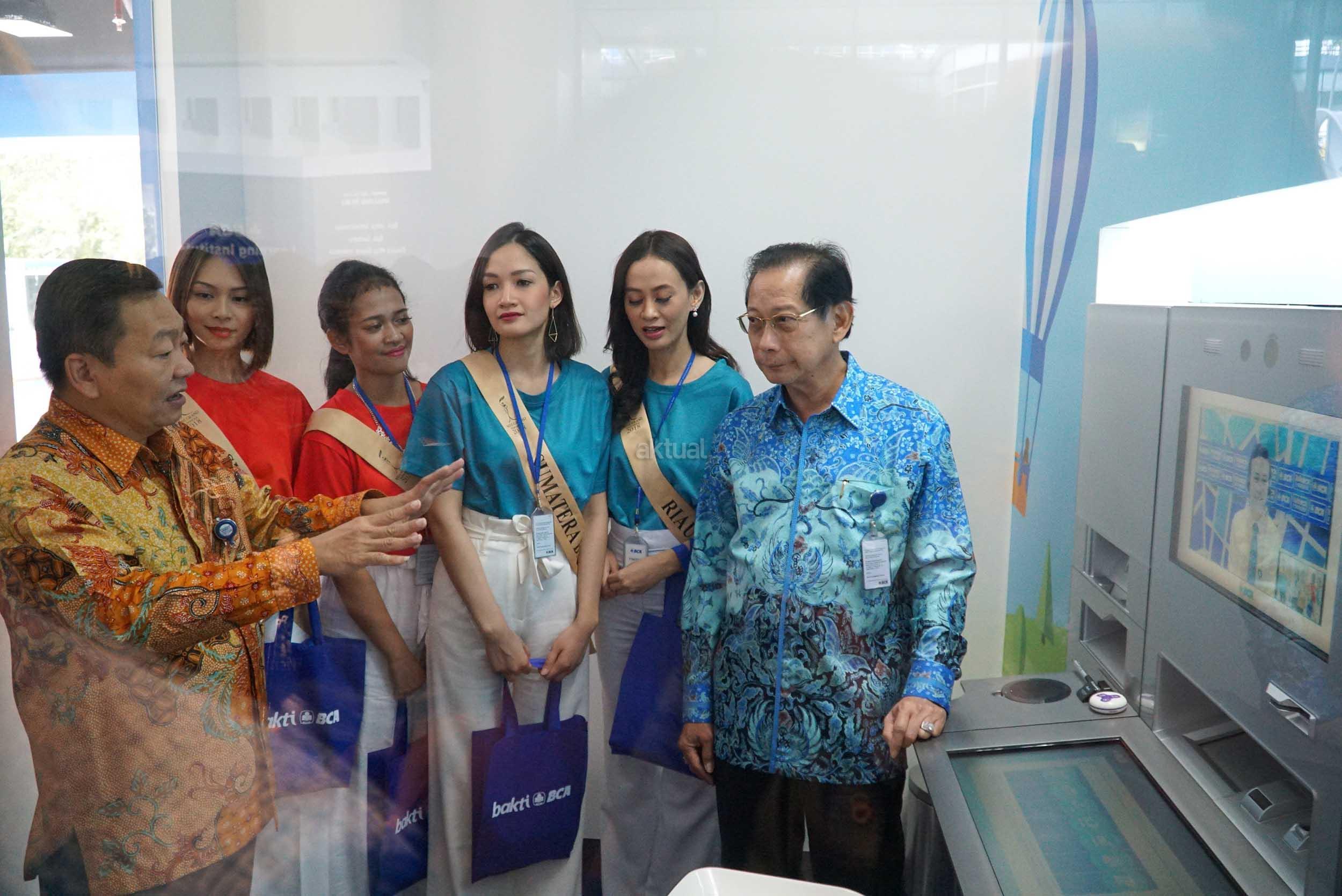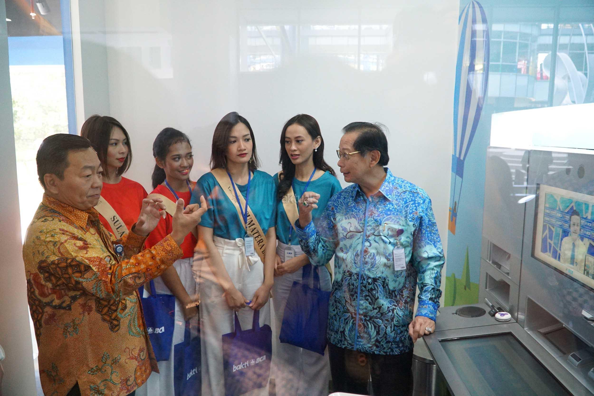 Presiden Direktur PT Bank Central Asia Tbk (BCA) Jahja Setiaatmadja (kanan) didampingi oleh Direktur BCA Santoso (kiri) bersama para finalis Miss Grand Indonesia 2018 melakukan experience di Video Banking BCA di sela acara Kunjungan Finalis Miss Grand Indonesia ke BCA Learning Institute (BLI) di Bogor, Senin (16/07). Dalam kunjungan ini, ke-30 finalis Miss Grand Indonesia diajak lebih dalam mengenal dunia perbankan melalui sejarah BCA dan teknologi yang dikembangkan. AKTUAL/Eko S Hilman