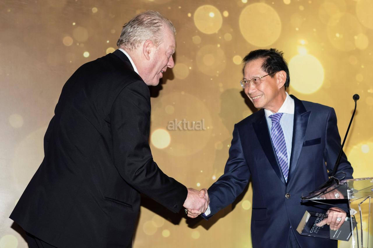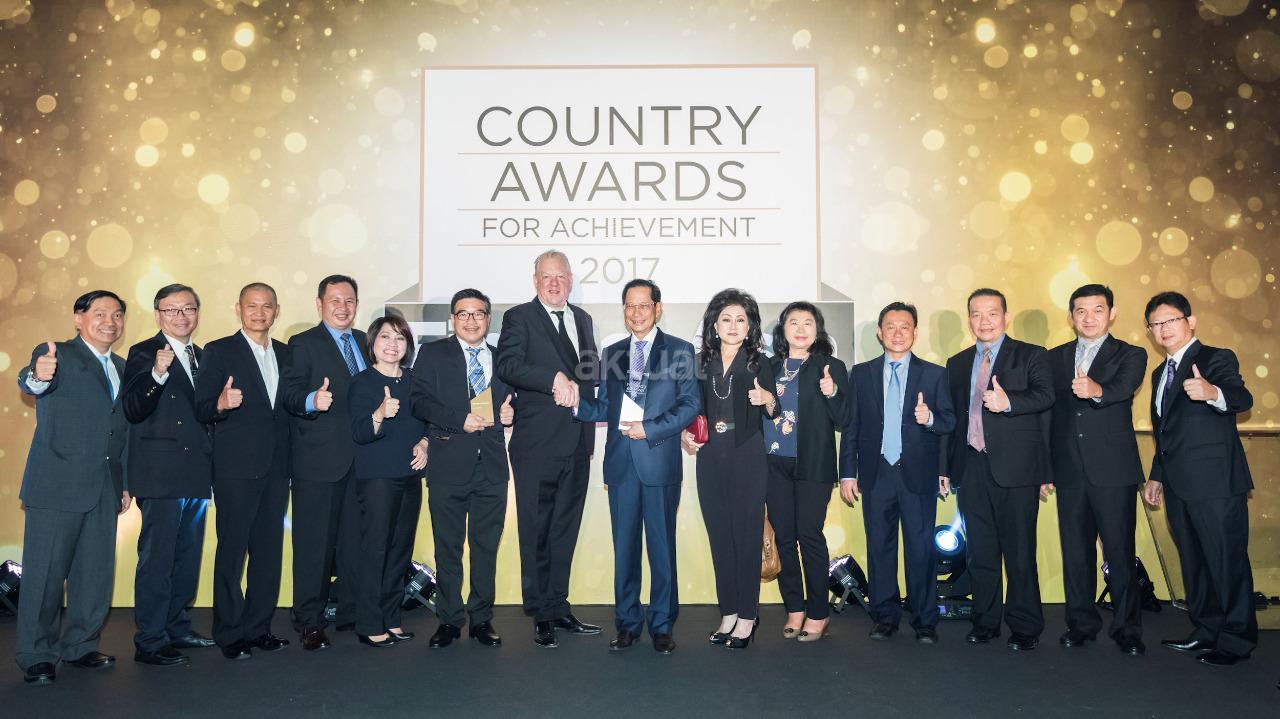 Presiden Direktur PT Bank Central Asia Tbk Jahja Setiaatmadja dan Publisher Haymarket Financial Media Jonathan Hirst foto bersama saat ajang FinanceAsia Country Awards for Achievement 2017 di Four Seasons, Hong Kong, Kamis (29/6). Dalam ajang tersebut, BCA untuk kedua kalinya dianugerahi dua penghargaan sekaligus yakni Best Bank in Indonesia dan Best Asian Bank berkat kinerja perseroan yang cemerlang di dalam negeri dan di tingkat Asia. BCA dinilai mampu mempertahankan pertumbuhan laba yang solid dan pendanaan yang rendah di tengah persaingan sektor perbankan yang semakin kompetitif. AKTUAL/Istimewa