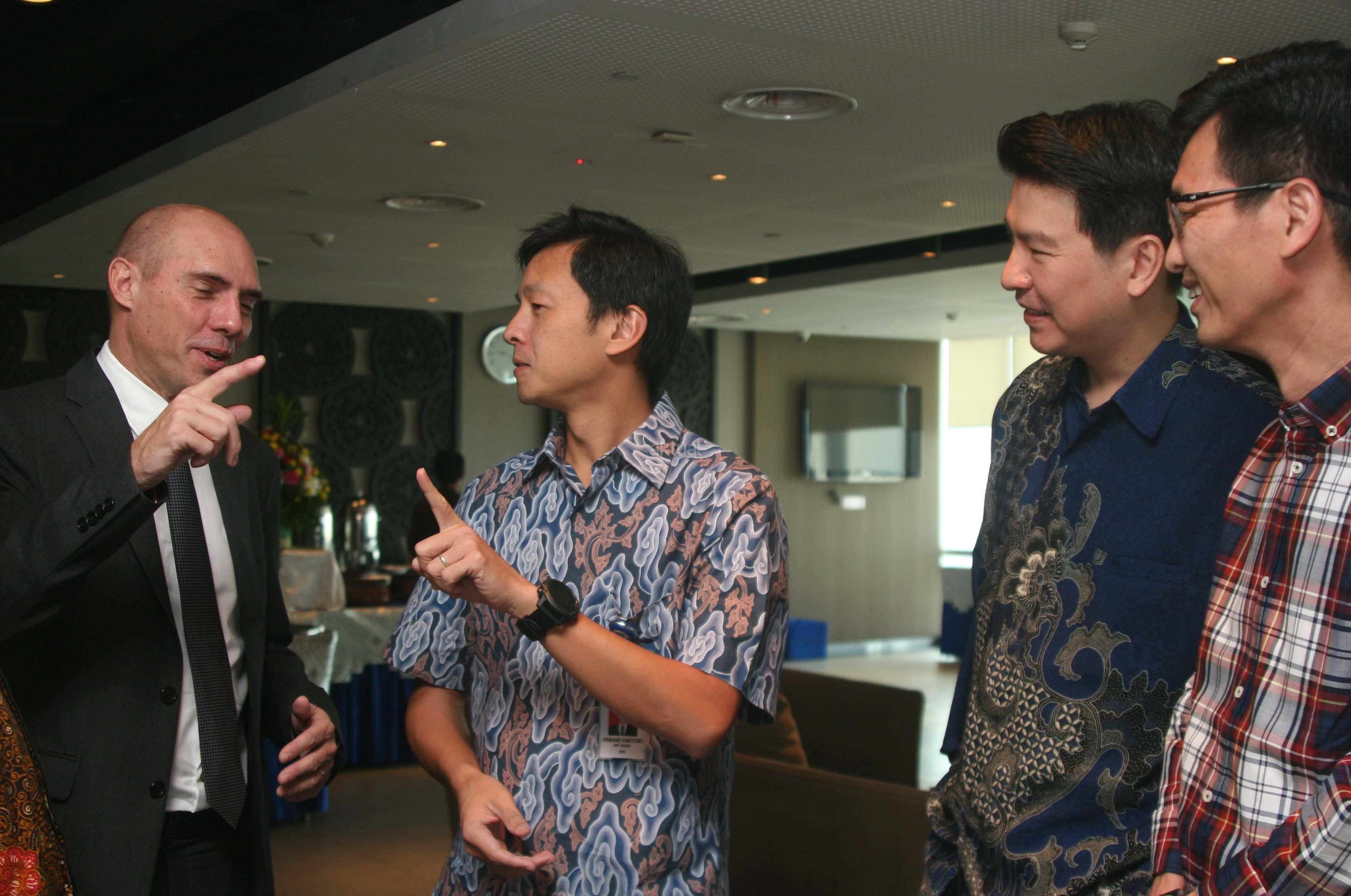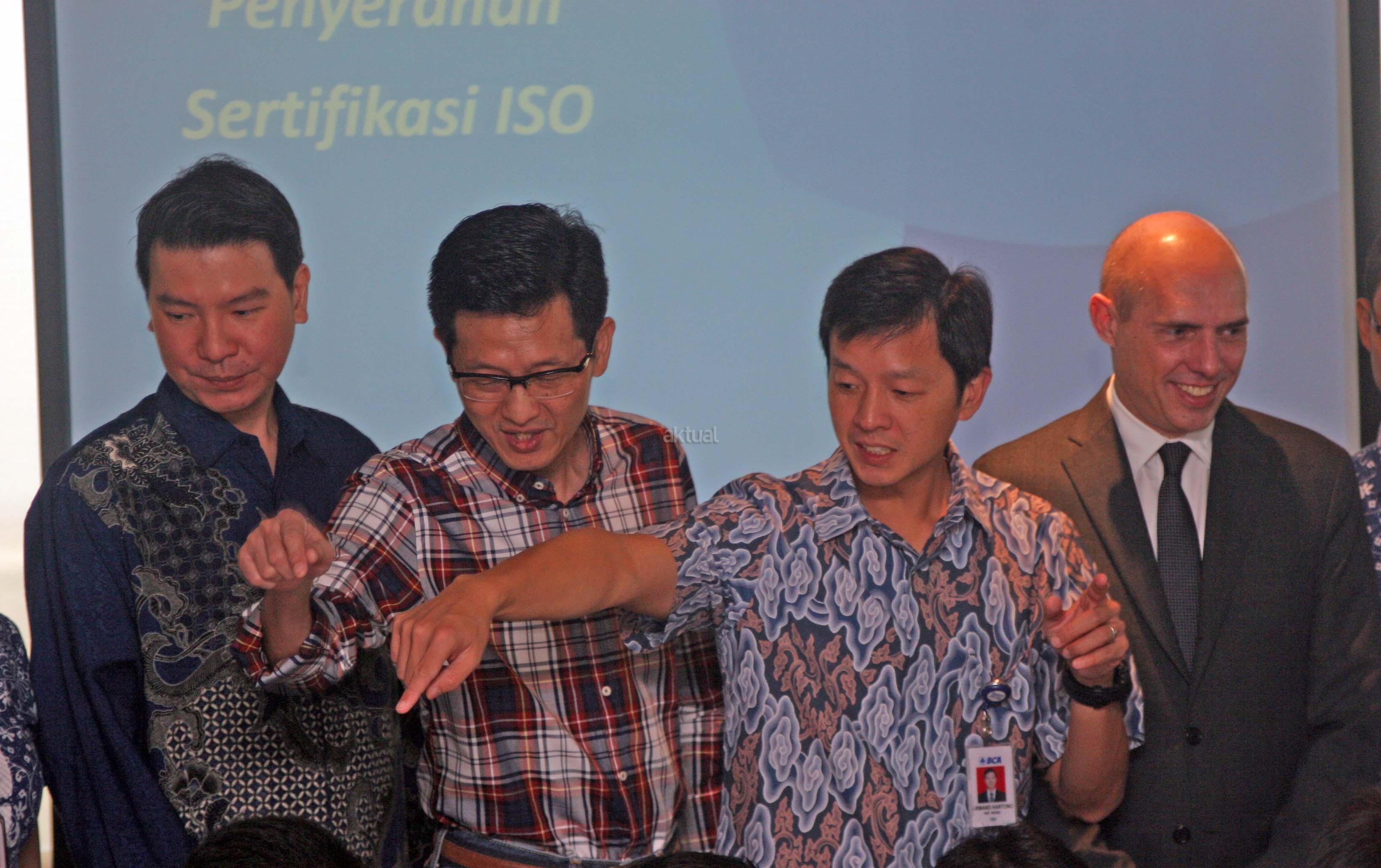 Wakil Presiden Direktur PT Bank Central Asia Tbk (BCA) Armand W. Hartono (kiri 2) didampingi EVP IT BCA Hermawan Thendean (kanan) berbincang bersama usai menerima sertifikat ISO dari Direktur SAI Global David Ngalusi (kanan2) dan Managing Director SGS Indonesia Guy Francois (kiri) di Jakarta, Rabu (9/12). Network Data Center BCA raih 3 sertifikat ISO untuk layanan teknologi Informasi. Sertifikat ISO yang diterima BCA telah memenuhi standar internasional guna peningkatan layanan transaksi keuangan dan kebutuhan usaha bagi nasabah. AKTUAL/Eko S Hilman