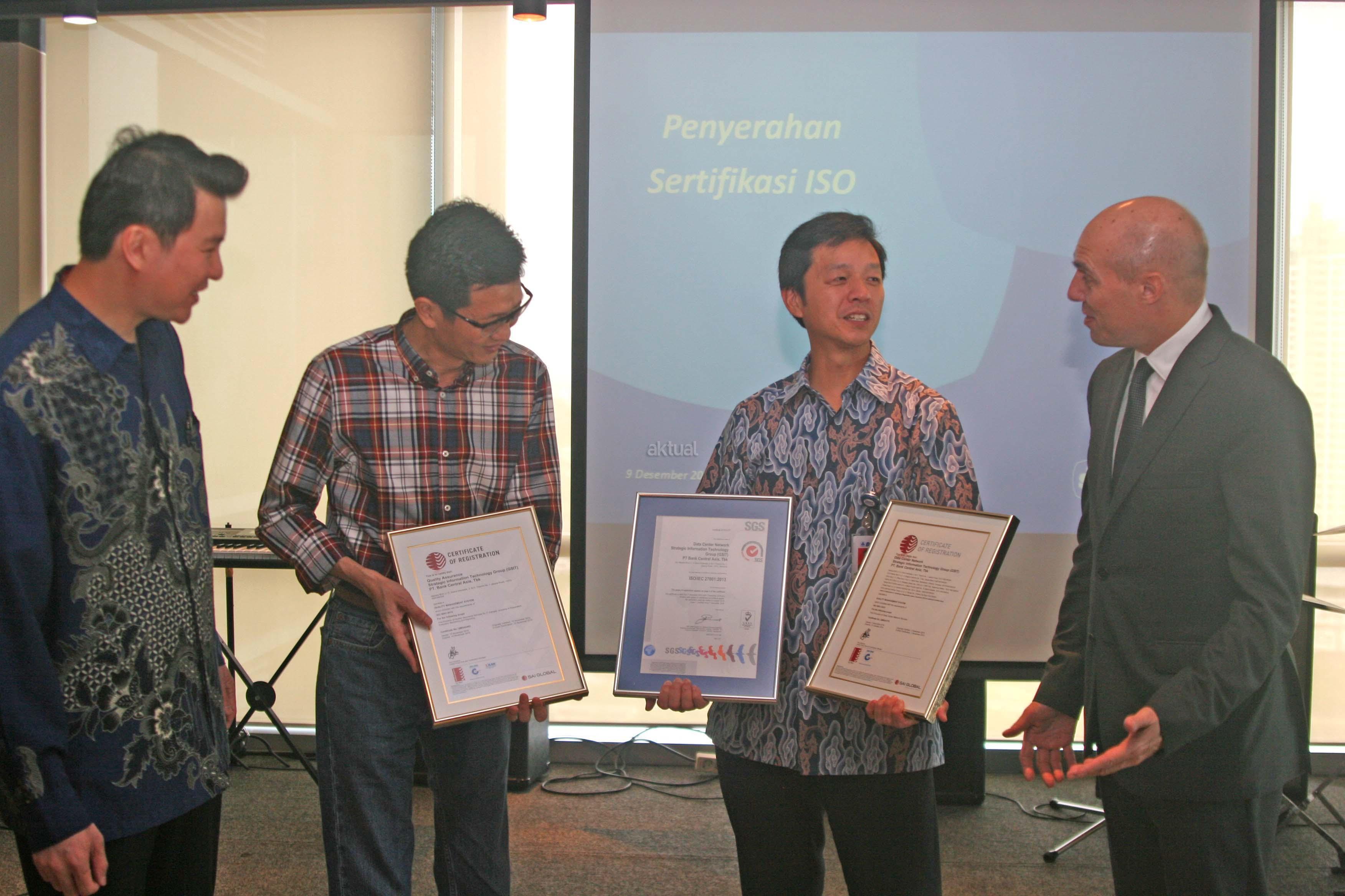 Wakil Presiden Direktur PT Bank Central Asia Tbk (BCA) Armand W. Hartono (kanan 2) didampingi EVP IT BCA Hermawan Thendean (kiri ) berbincang bersama usai menerima sertifikat ISO dari Direktur SAI Global David Ngalusi (kiri 2) dan Managing Director SGS Indonesia Guy Francois (kanan) di Jakarta, Rabu (9/12). Network Data Center BCA raih 3 sertifikat ISO untuk layanan teknologi Informasi. Sertifikat ISO yang diterima BCA telah memenuhi standar internasional guna peningkatan layanan transaksi keuangan dan kebutuhan usaha bagi nasabah. AKTUAL/Eko S Hilman