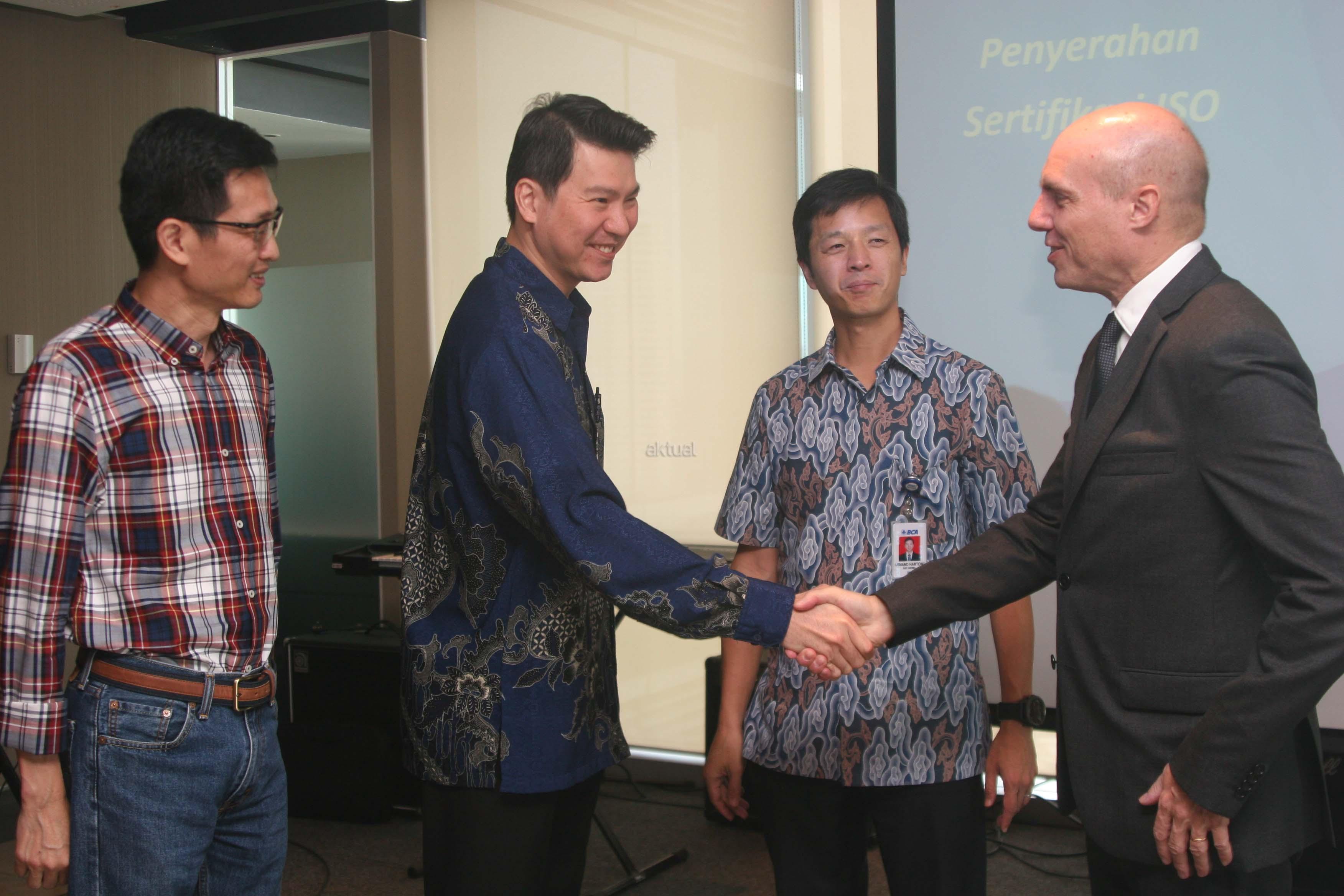 Wakil Presiden Direktur PT Bank Central Asia Tbk (BCA) Armand W. Hartono (kanan 2) didampingi EVP IT BCA Hermawan Thendean (kiri 2) berbincang bersama usai menerima sertifikat ISO dari Direktur SAI Global David Ngalusi (kiri) dan Managing Director SGS Indonesia Guy Francois (kanan) di Jakarta, Rabu (9/12). Network Data Center BCA raih 3 sertifikat ISO untuk layanan teknologi Informasi. Sertifikat ISO yang diterima BCA telah memenuhi standar internasional guna peningkatan layanan transaksi keuangan dan kebutuhan usaha bagi nasabah. AKTUAL/Eko S Hilman