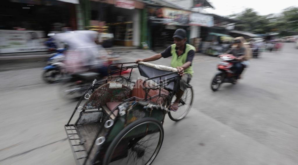 Penarik becak melintas di kawasan Warakas, Jakarta Utara, Rabu (17/1/2018). Gubernur DKI Jakarta, Anies Baswedan menghidupkan kembali transportasi becak yang sebelumnya telah dilarang sejak 2007. Becak akan diberi rute khusus seperti di perkampungan dan kawasan pasar. Penarik becak biasanya mulai mengais rezeki sejak pagi hingga sore dengan tarif berkisar Rp 10 ribu-Rp15 ribu. AKTUAL/Tino Oktaviano