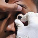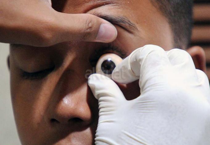 Okularis memasang mata palsu kepada seorang anak yang kehilangan mata kirinya di Jalan Kompleks DPR 2, Kebon Jeruk Raya, Jakarta Barat, Selasa (17/10). Setiap bulannya pembuat mata palsu (okularis) di bilangan Kebon Jeruk ini mampu menghasilkan sekitar 15 mata palsu yang berfungsi sebagai estetis bagi seseorang yang kehilangan mata dengan harga Rp 2 juta/mata. AKTUAL/Tino Oktaviano