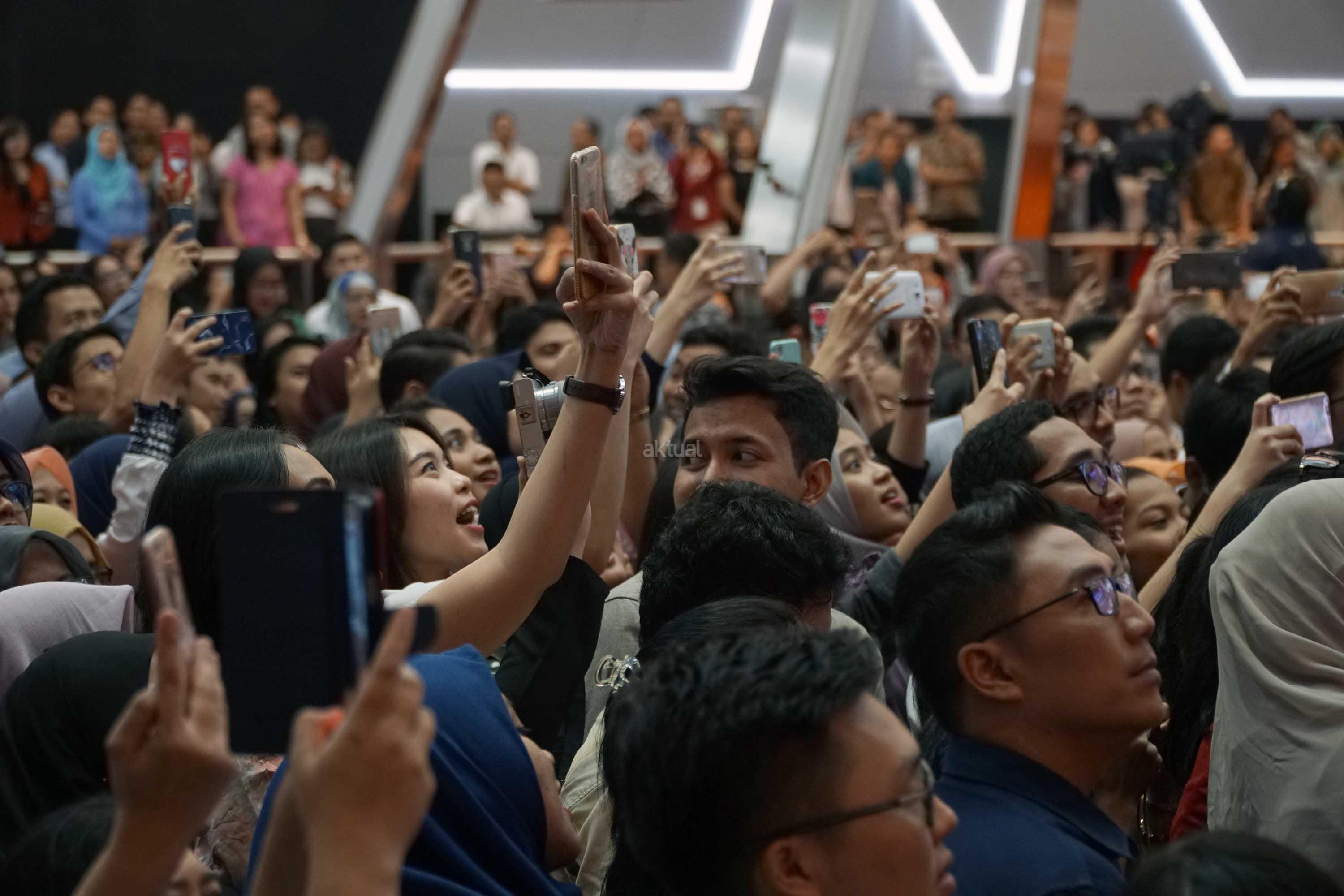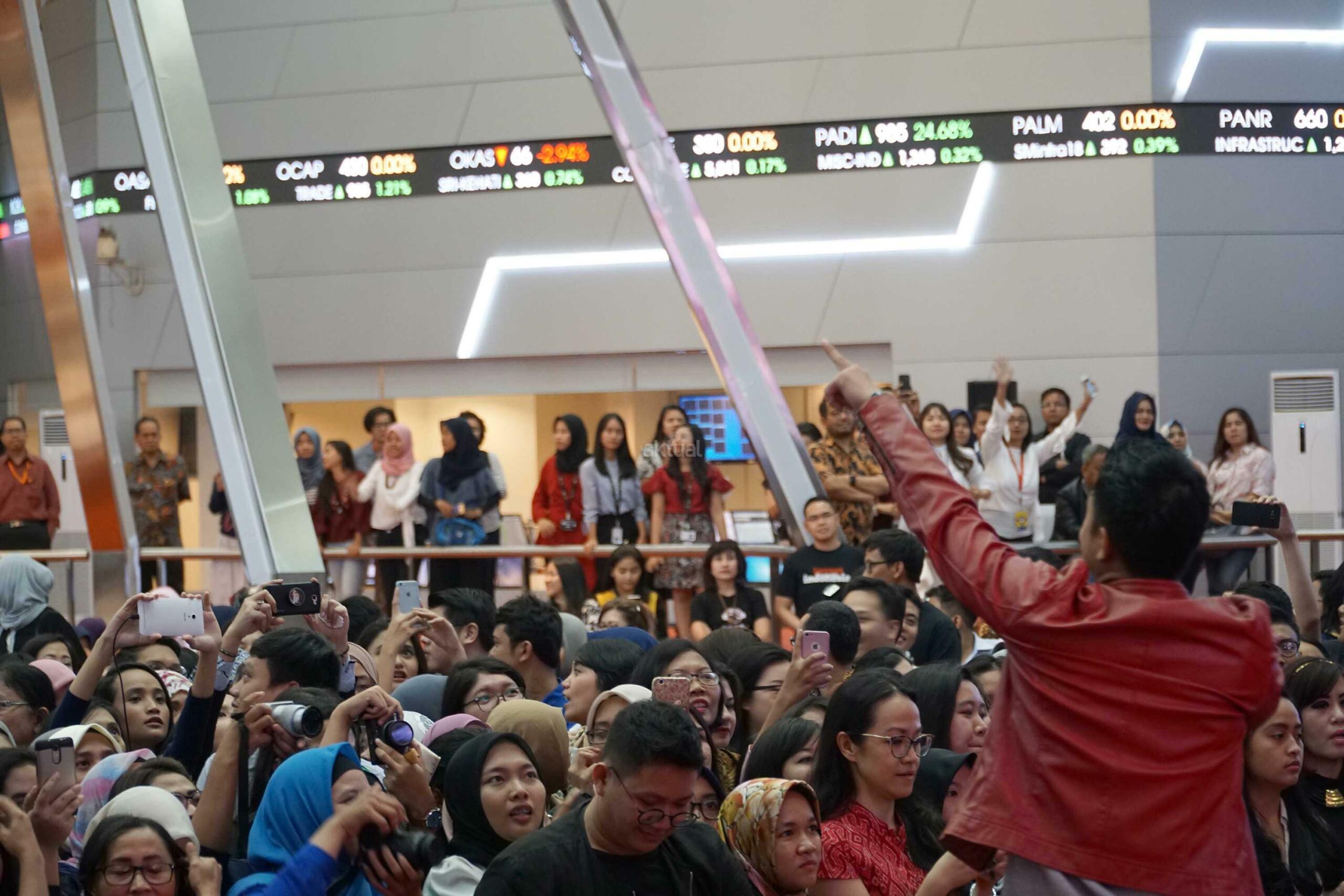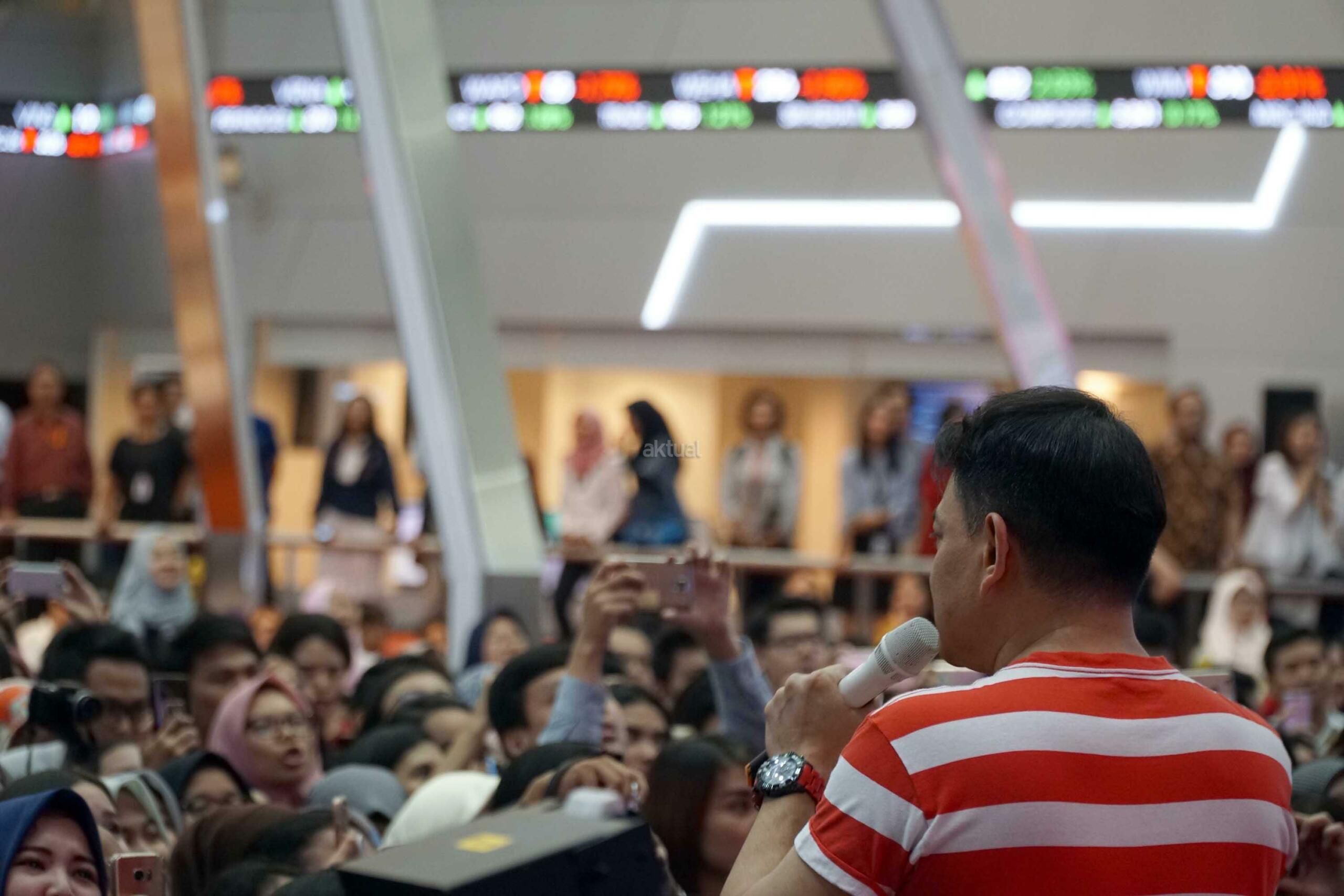 Pengunjung bersama karyawan di lingkungan Bursa Efek Indonesia (BEI) serta pengemar group band Kahitna berbaur dan bernyanyi saat acara IDX Stock Sound usai penutupan perdagangan perdagangan saham di Main Hall, BEI, Jakarta, (31/7). Indeks Harga Saham Gabungan (IHSG) melesat ke 5.840 setelah sempat bergerak bak roller coaster sepanjang hari ini. IHSG naik 9,912 poin (0,17%) ke 5.840,939. Indeks LQ45 berkurang 0,052 poin (0,01%) ke 974,007. Posisi tertinggi IHSG sempat terjadi di level 5.847,939 dan terendah di 5.816,53. Transaksi sore ini cenderung moderat. Hingga sore ini, telah terjadi 325.344 kali transaksi sebanyak 6,9 miliar lembar saham senilai Rp 7,1 triliun. AKTUAL/Eko S Hilman