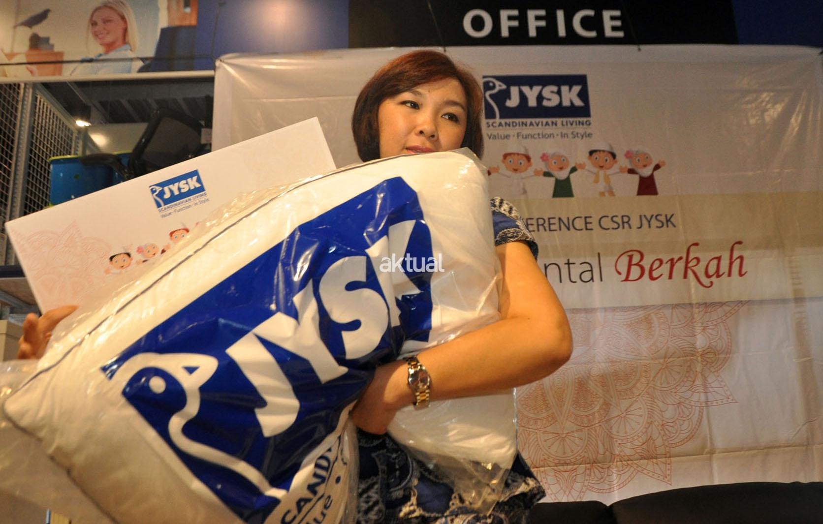 Head of Corporate and Marketing Communications OT Yuna Eka Kristina (kiri) menyerahkan simbolisasi peluncuran JYSK "sedekah bantal berkah" kepada Direktur Sahabat Anak Alles Saragi di Store JYSK, AEON Mall Serpong, Tangerang Selatan, Banten, Kamis (18/6/2015). JYSK sebagai ritel furnitur Skandinavia pertama di Indonesia mengajak konsumen untuk berbagi dengan membeli bantal JYSK berharga khusus Rp 59 ribu, secara otomatis konsumen sudah menyumbangkan Rp 10 ribu untuk menciptakan Rumah Belajar yang nyaman untuk anak-anak di Sahabat Anak. AKTUAL/JUNAIDI MAHBUB