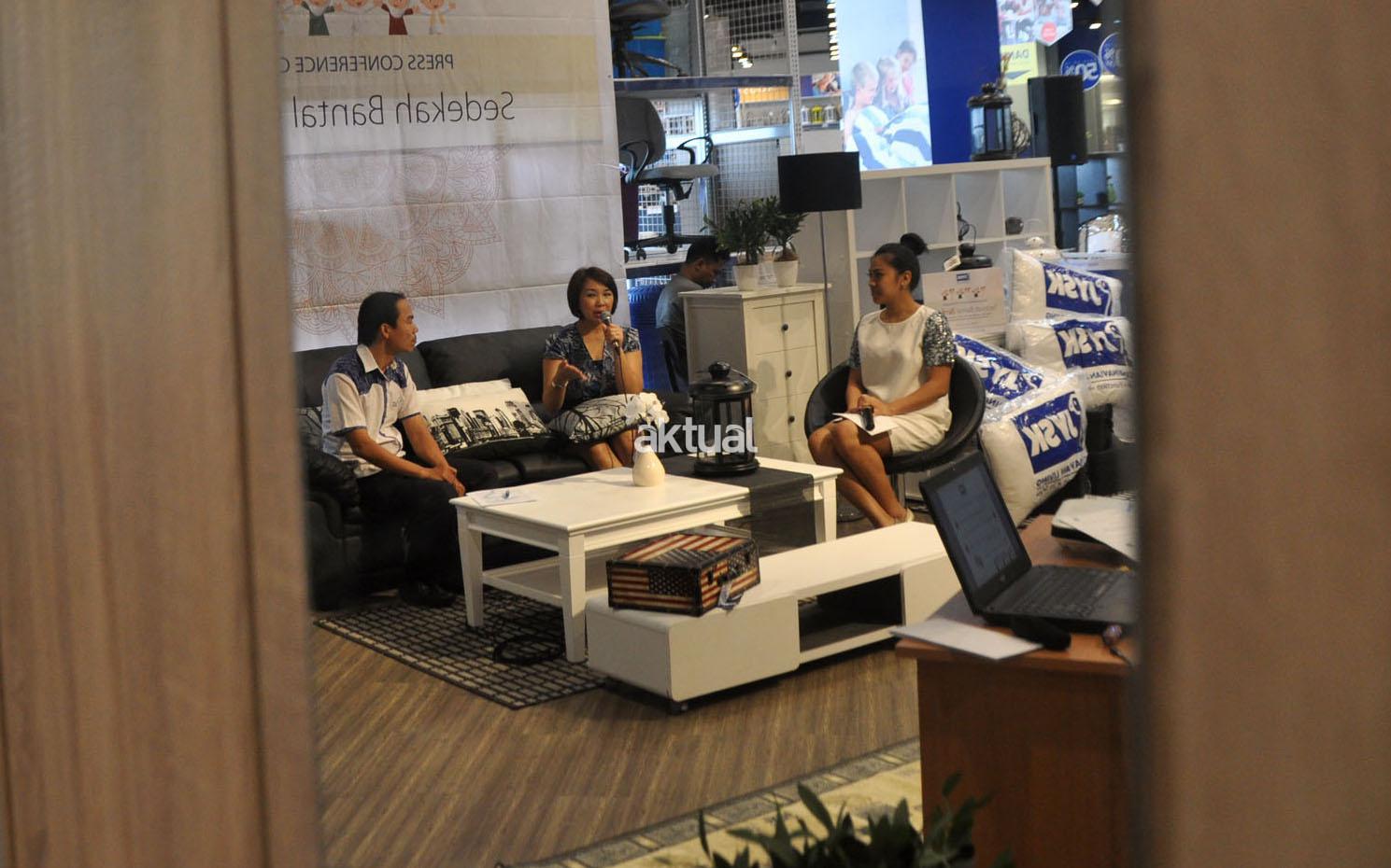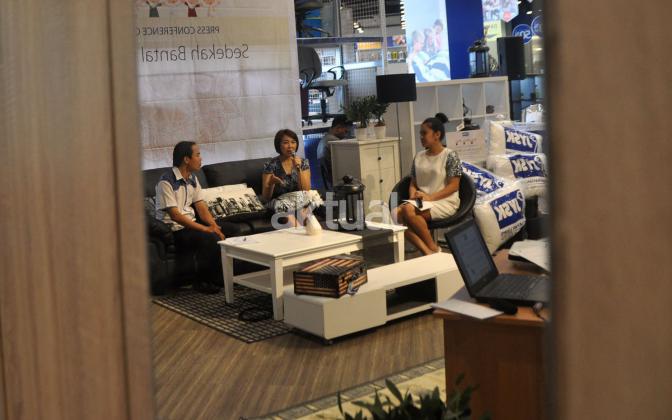 Head of Corporate and Marketing Communications OT Yuna Eka Kristina (tengah) saat diskusi dengan Direktur Sahabat Anak Alles Saragi di Store JYSK, AEON Mall Serpong, Tangerang Selatan, Banten, Kamis (18/6/2015). JYSK sebagai ritel furnitur Skandinavia pertama di Indonesia mengajak konsumen untuk berbagi dengan membeli bantal JYSK berharga khusus Rp 59 ribu, secara otomatis konsumen sudah menyumbangkan Rp 10 ribu untuk menciptakan Rumah Belajar yang nyaman untuk anak-anak di Sahabat Anak. AKTUAL/JUNAIDI MAHBUB