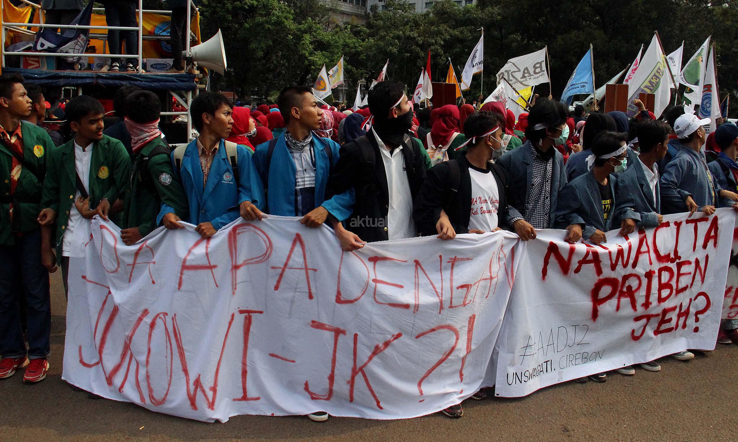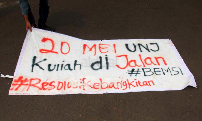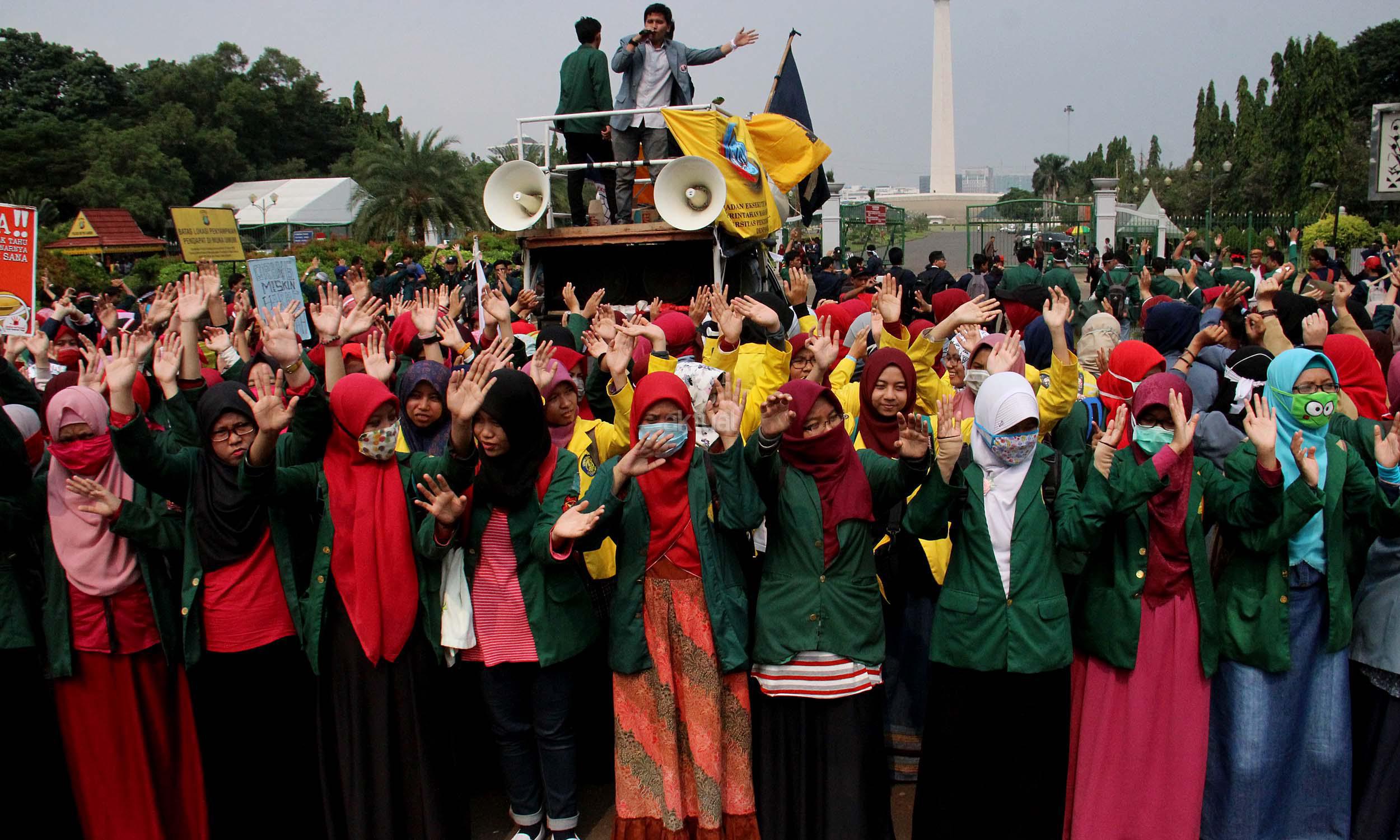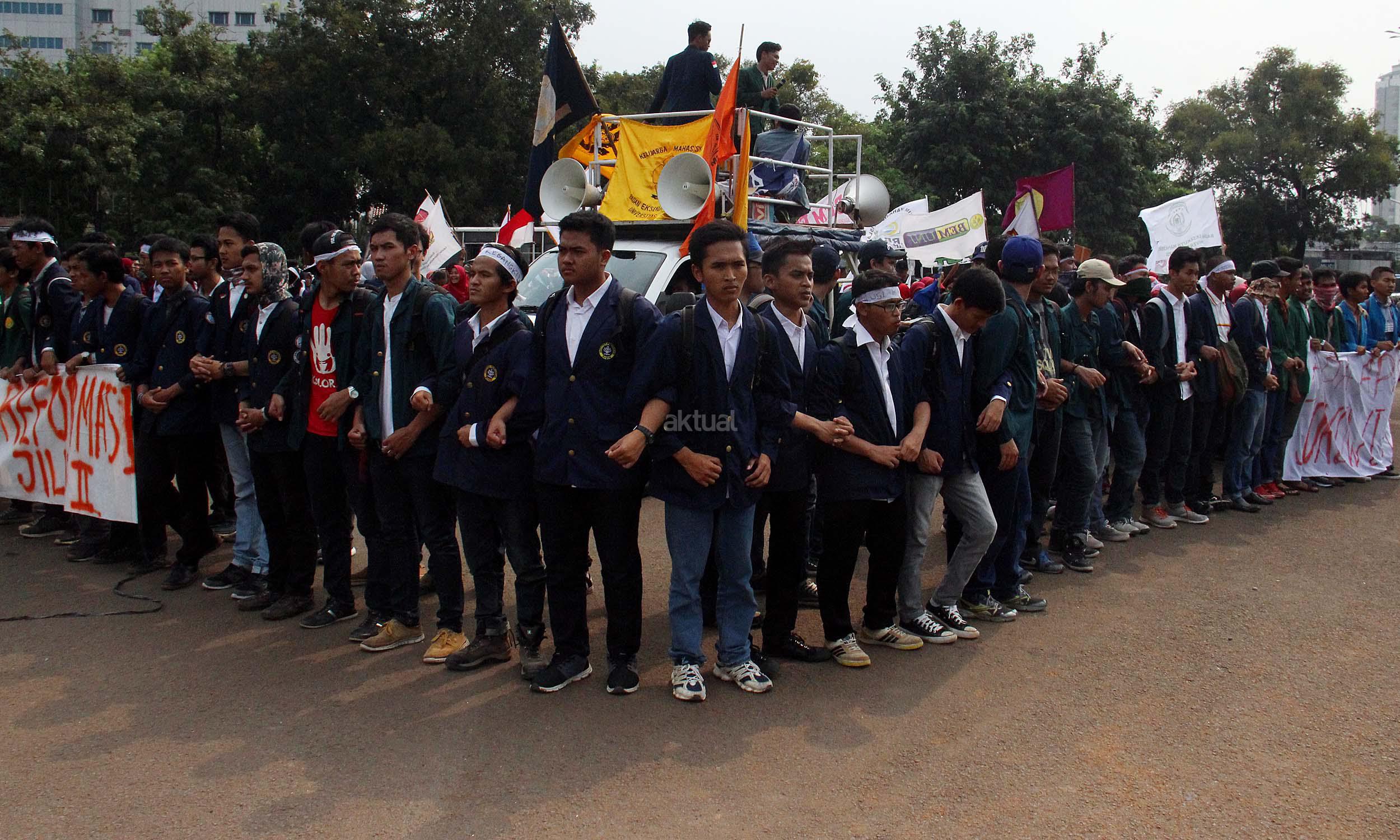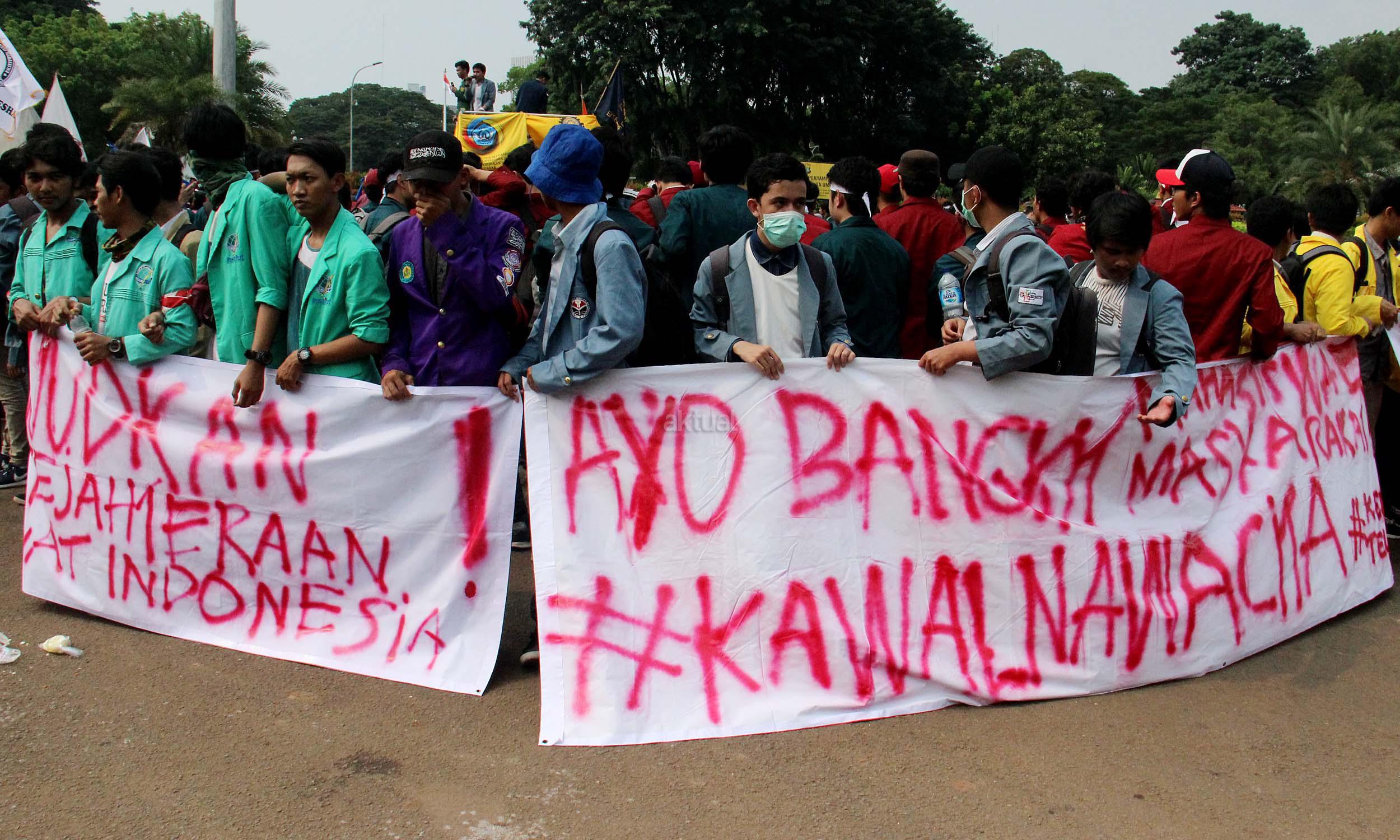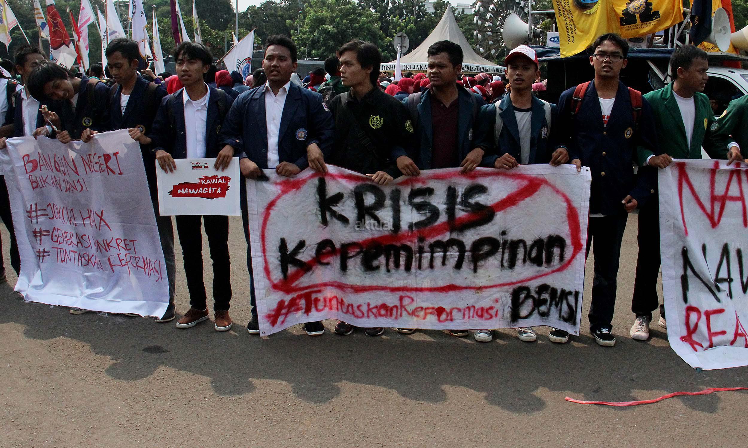 Ratusan mahasiswa yag tergabung BEM SI melakukan aksi unjuk rasa di depan Istana Negara, Jakarta, Jumat (20/5/2016). Aksi ini dilakukan dalam rangka peringatan hari Kebangkitan Nasional, BEM SI mengajak rezim Jokowi/ JK dan masyarakat Indonesia untuk melakukan Resolusi Kebangkitan .