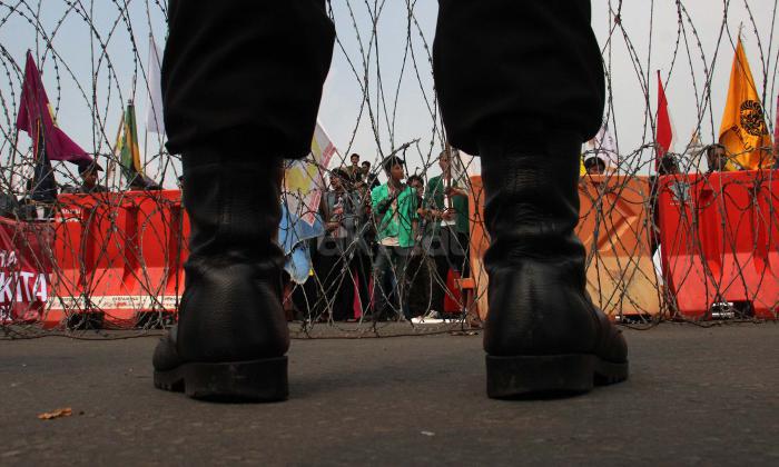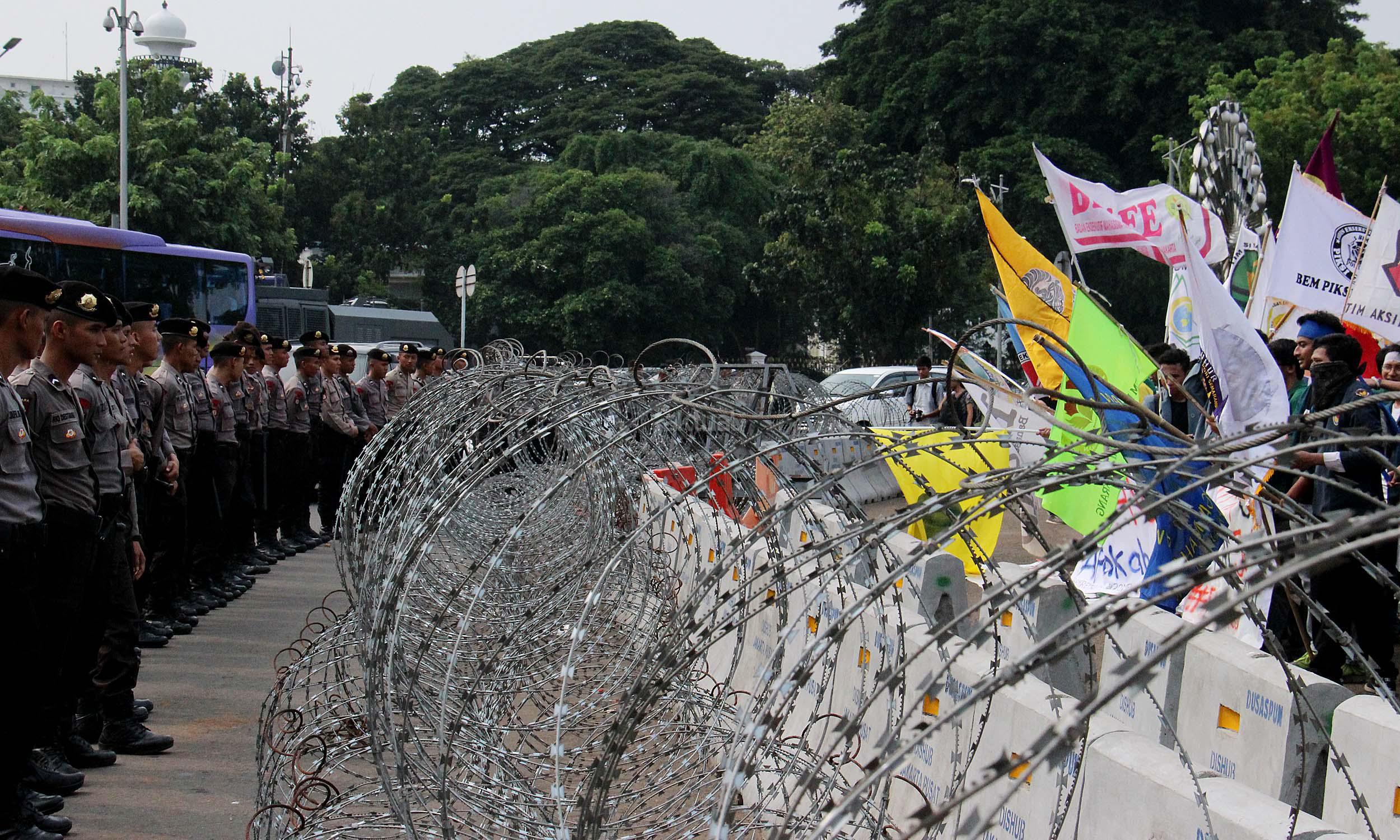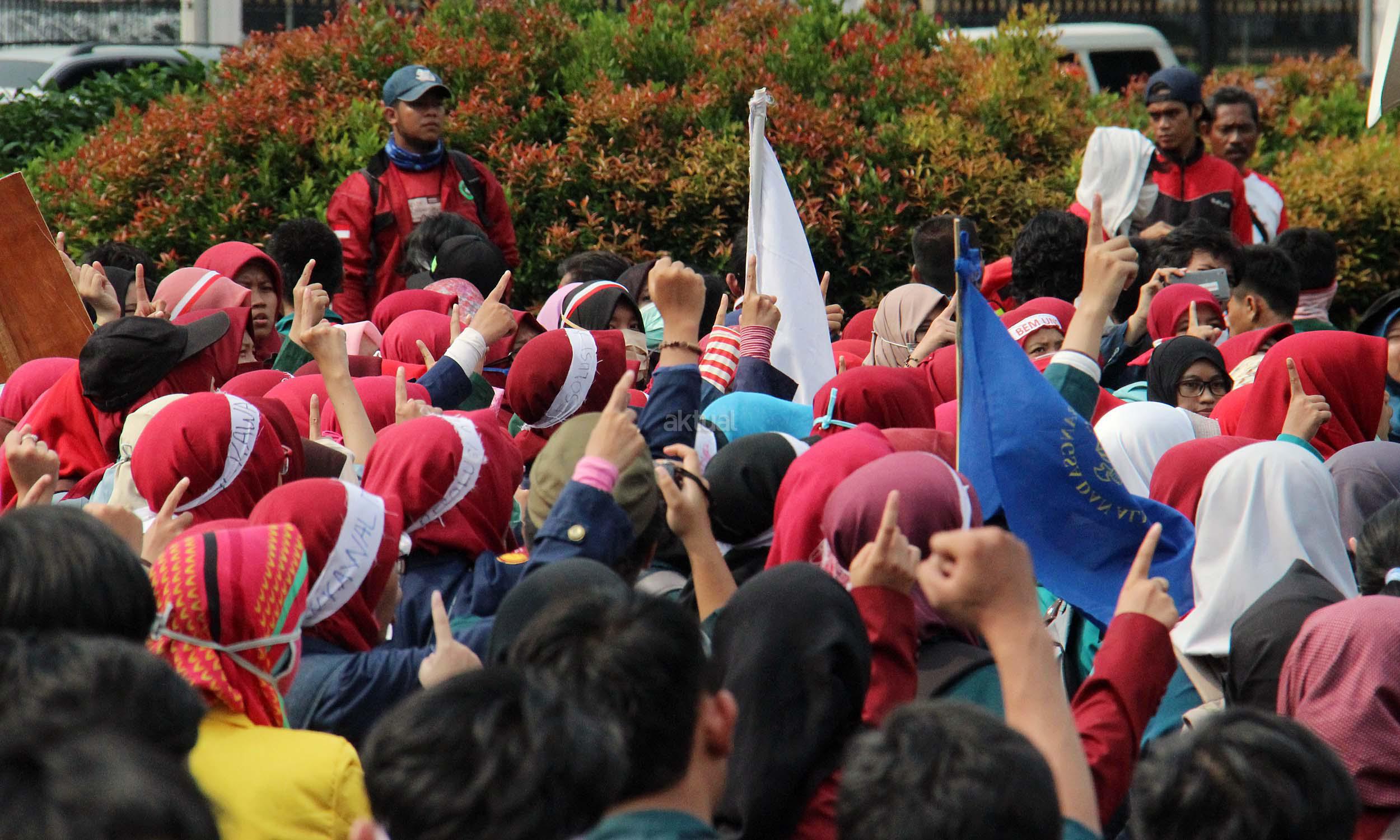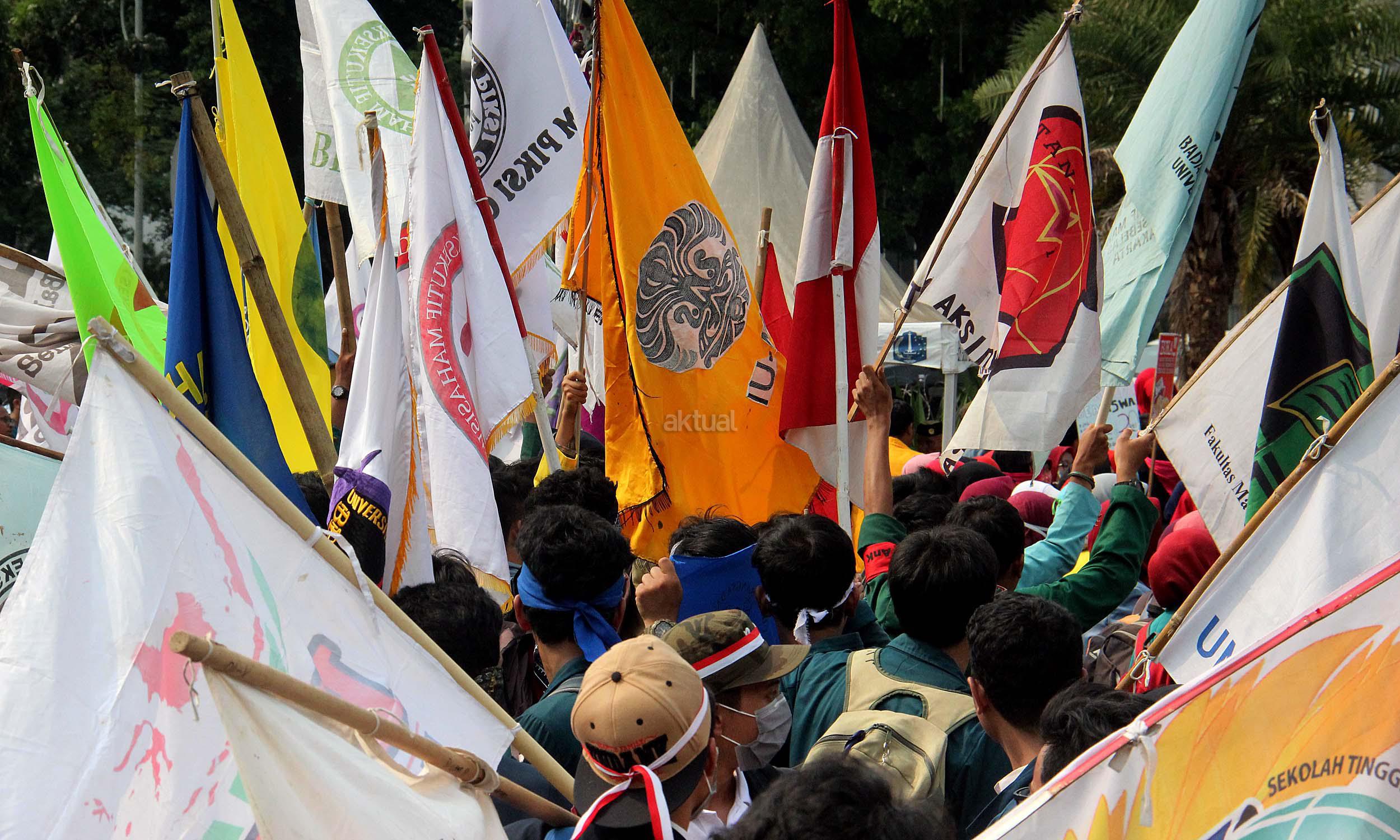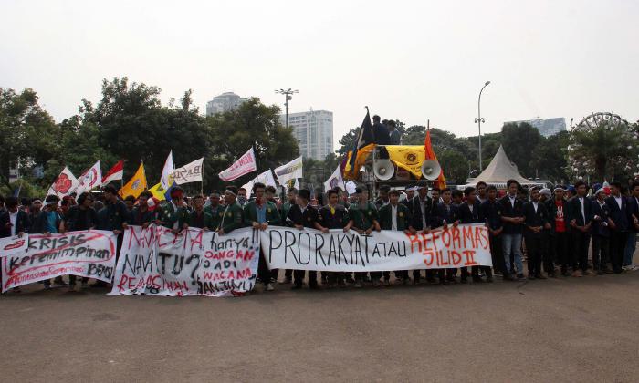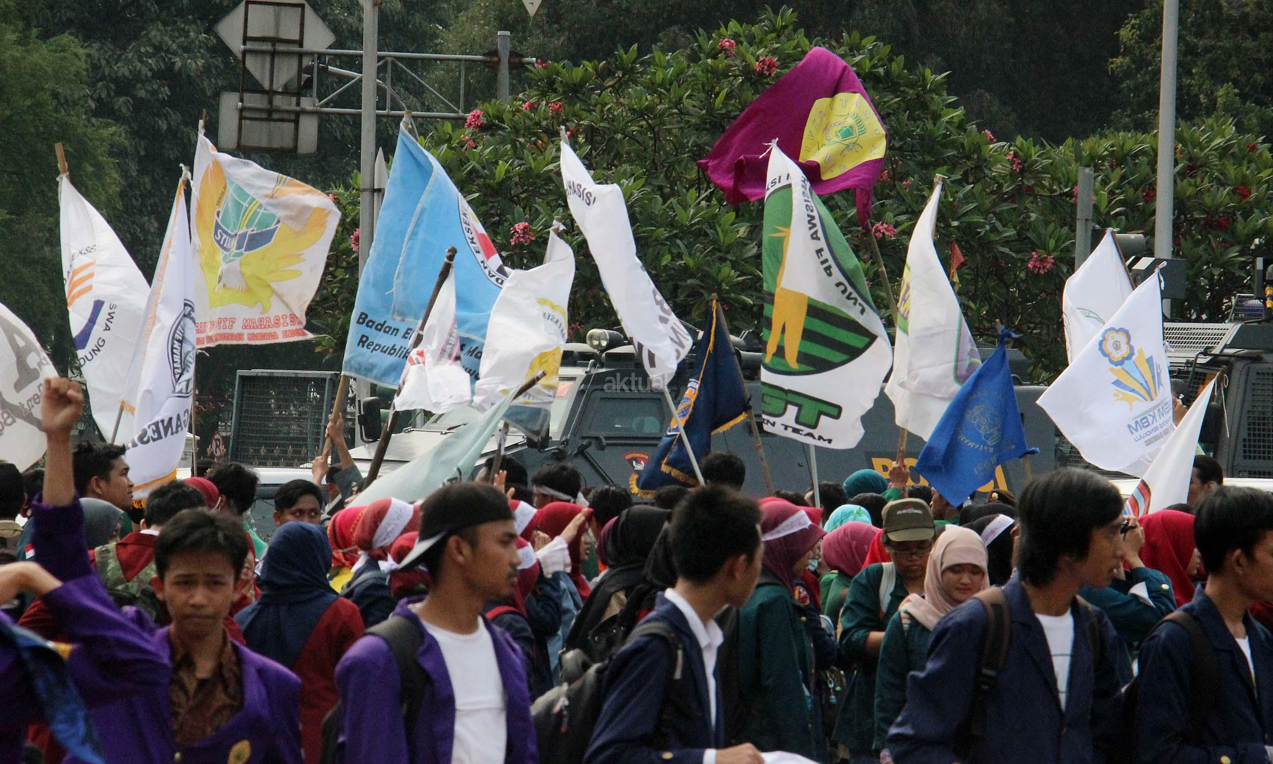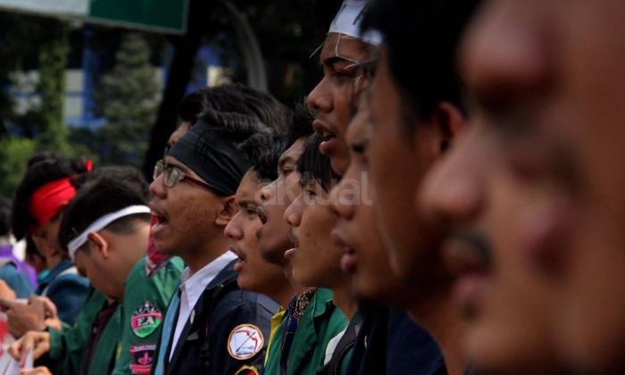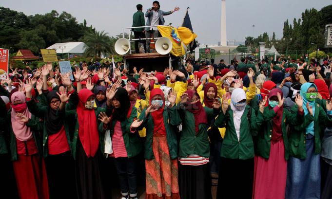 Ratusan mahasiswa yag tergabung BEM SI melakukan aksi unjuk rasa di depan Istana Negara, Jakarta, Jumat (20/5/2016). Aksi ini dilakukan dalam rangka peringatan hari Kebangkitan Nasional, BEM SI mengajak rezim Jokowi/ JK dan masyarakat Indonesia untuk melakukan Resolusi Kebangkitan .