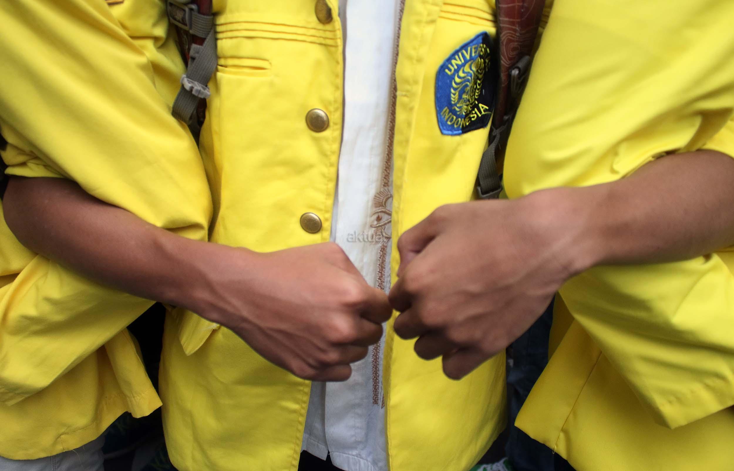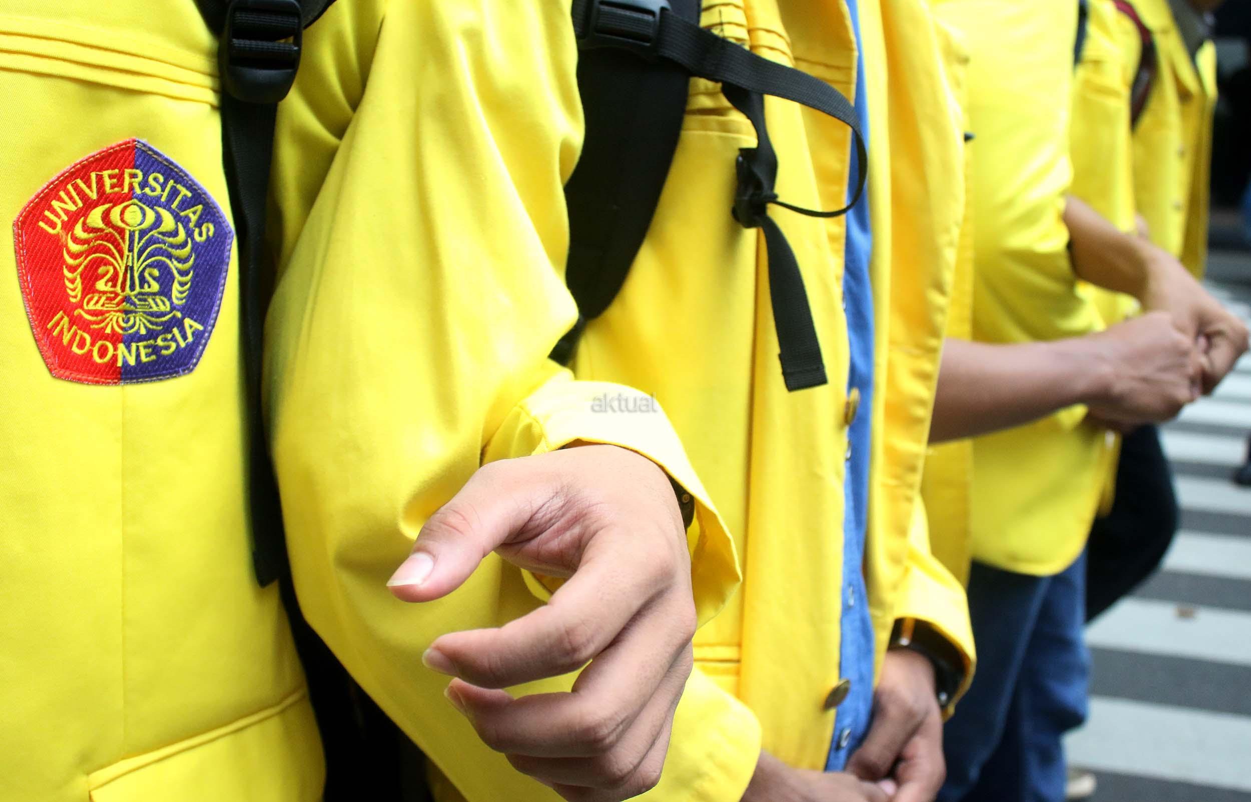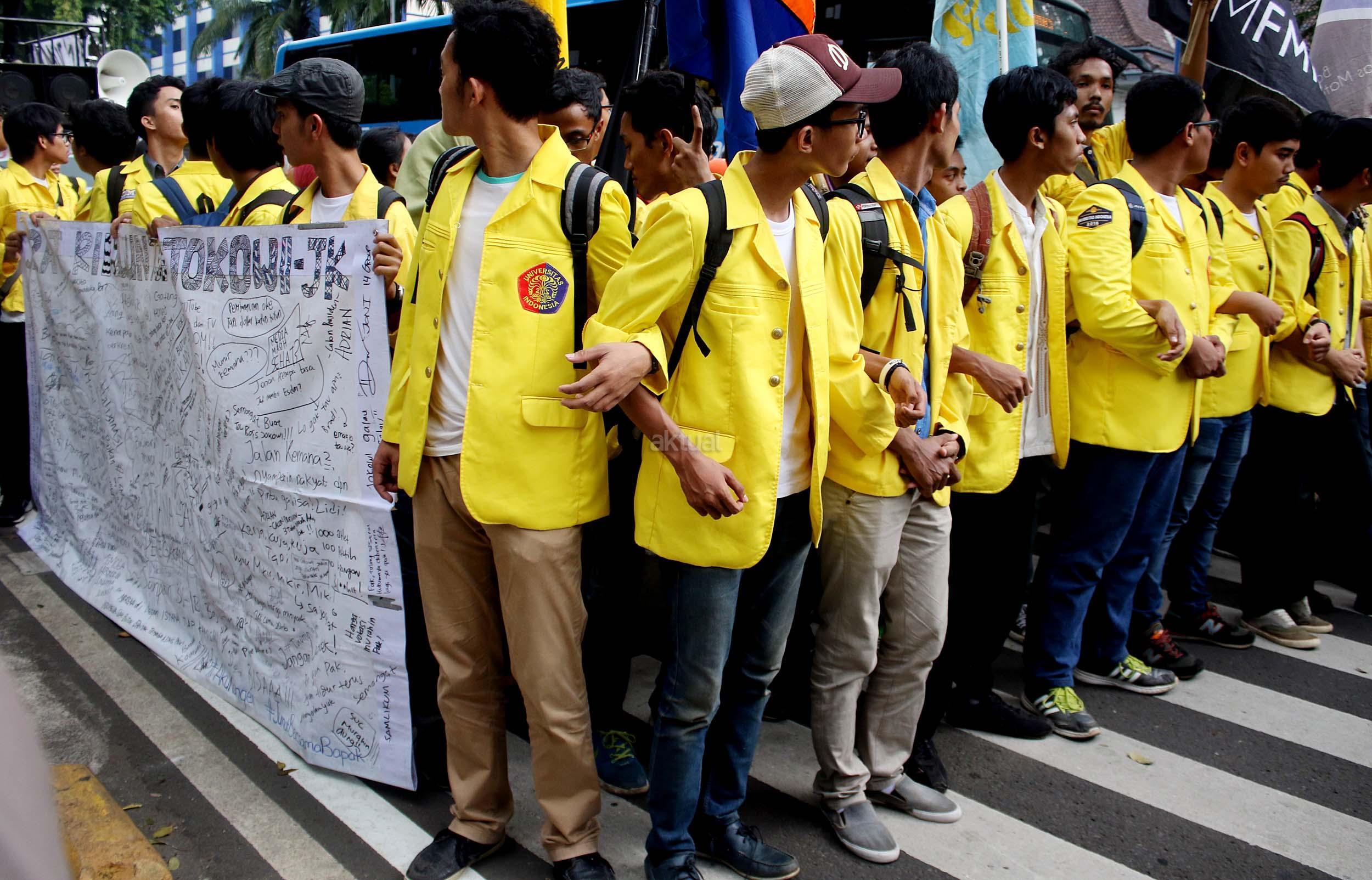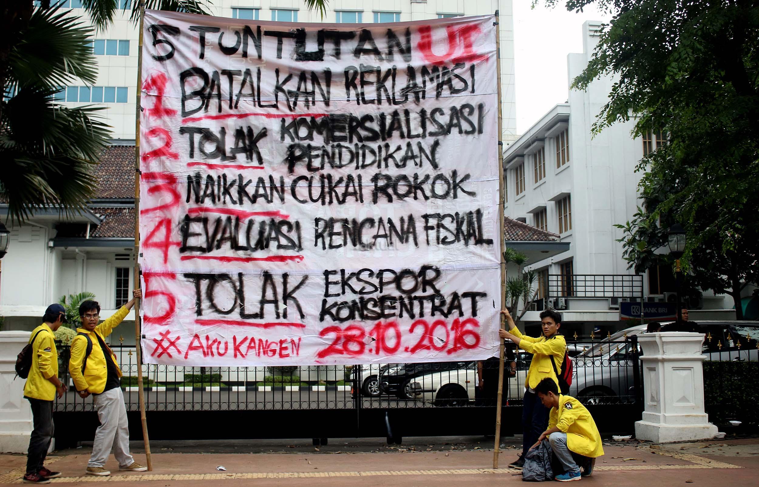 Ratusan mahasiswa Universitas Indonesia (UI) yang tergabung dalam BEM UI melakukan aksi unjuk rasa di Jalan. Merdeka Selatan, Jakarta, Jumat (28/10/2016). Dalam aksinya BEM UI memperingati Hari Sumpah Pemuda ke-88 dan mengkritisi dua tahun kinerja pemerintahan Jokowi-JK.