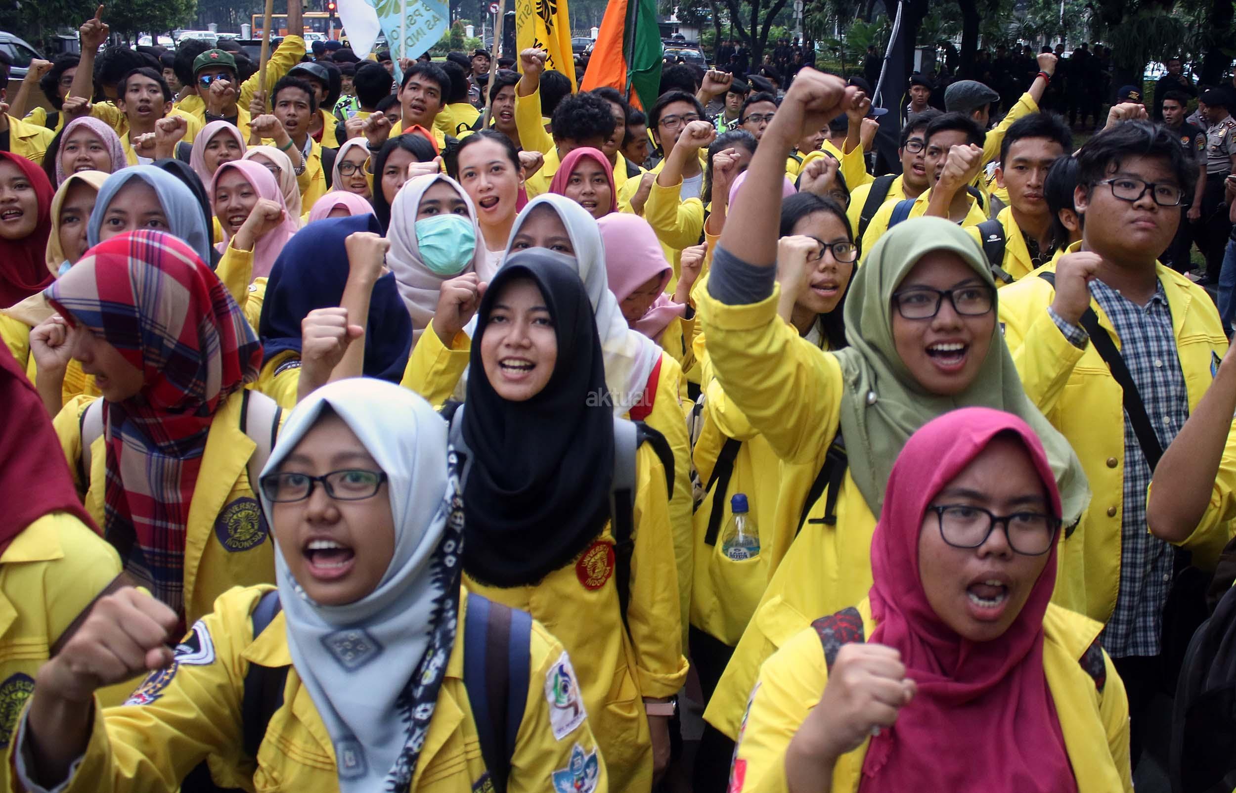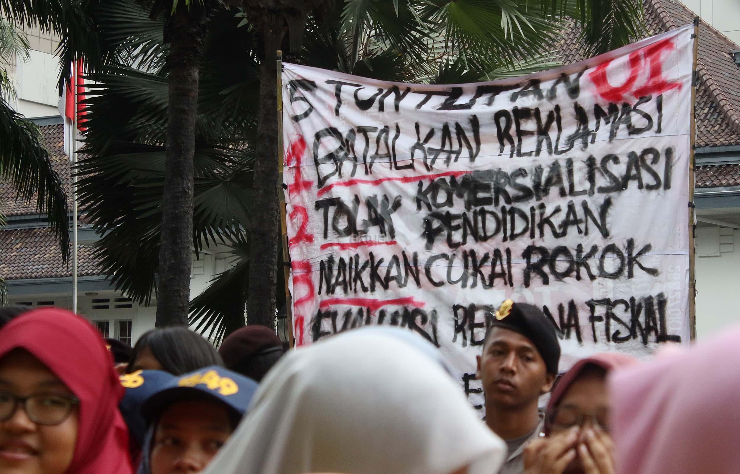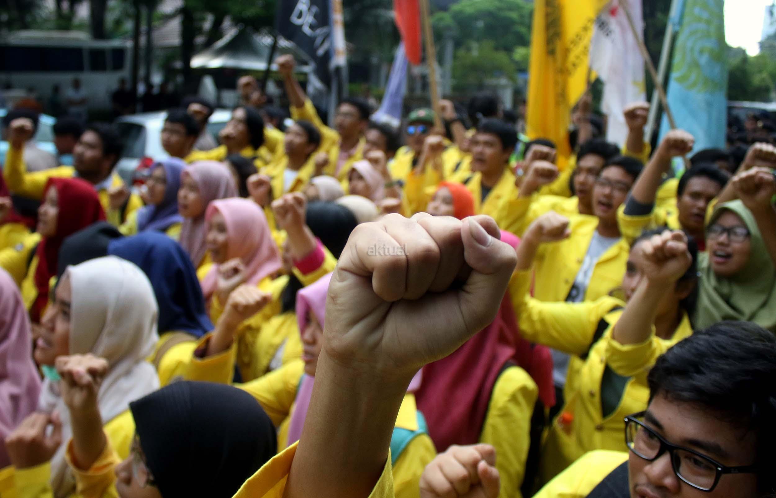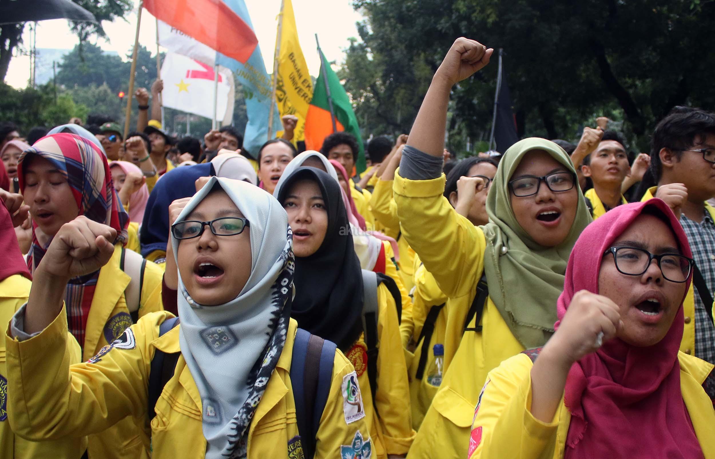 Ratusan mahasiswa Universitas Indonesia (UI) yang tergabung dalam BEM UI melakukan aksi unjuk rasa di Jalan. Merdeka Selatan, Jakarta, Jumat (28/10/2016). Dalam aksinya BEM UI memperingati Hari Sumpah Pemuda ke-88 dan mengkritisi dua tahun kinerja pemerintahan Jokowi-JK.