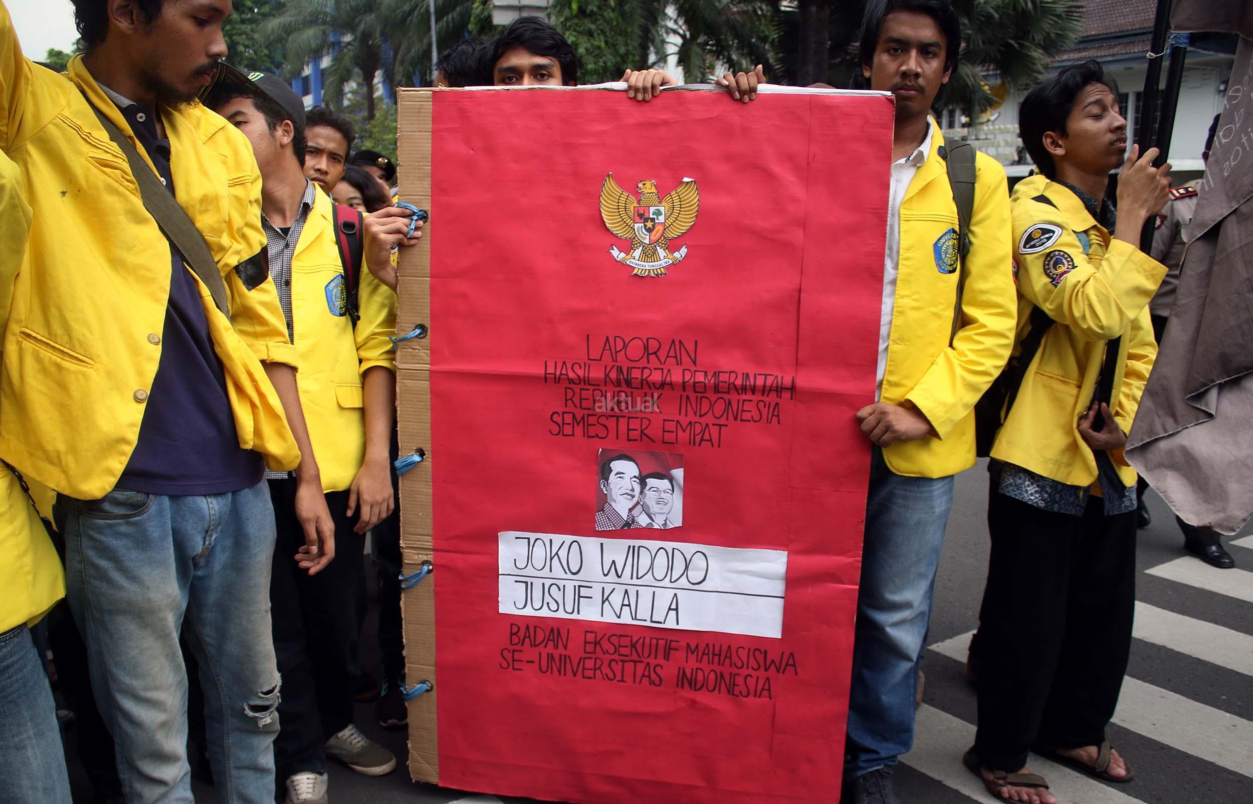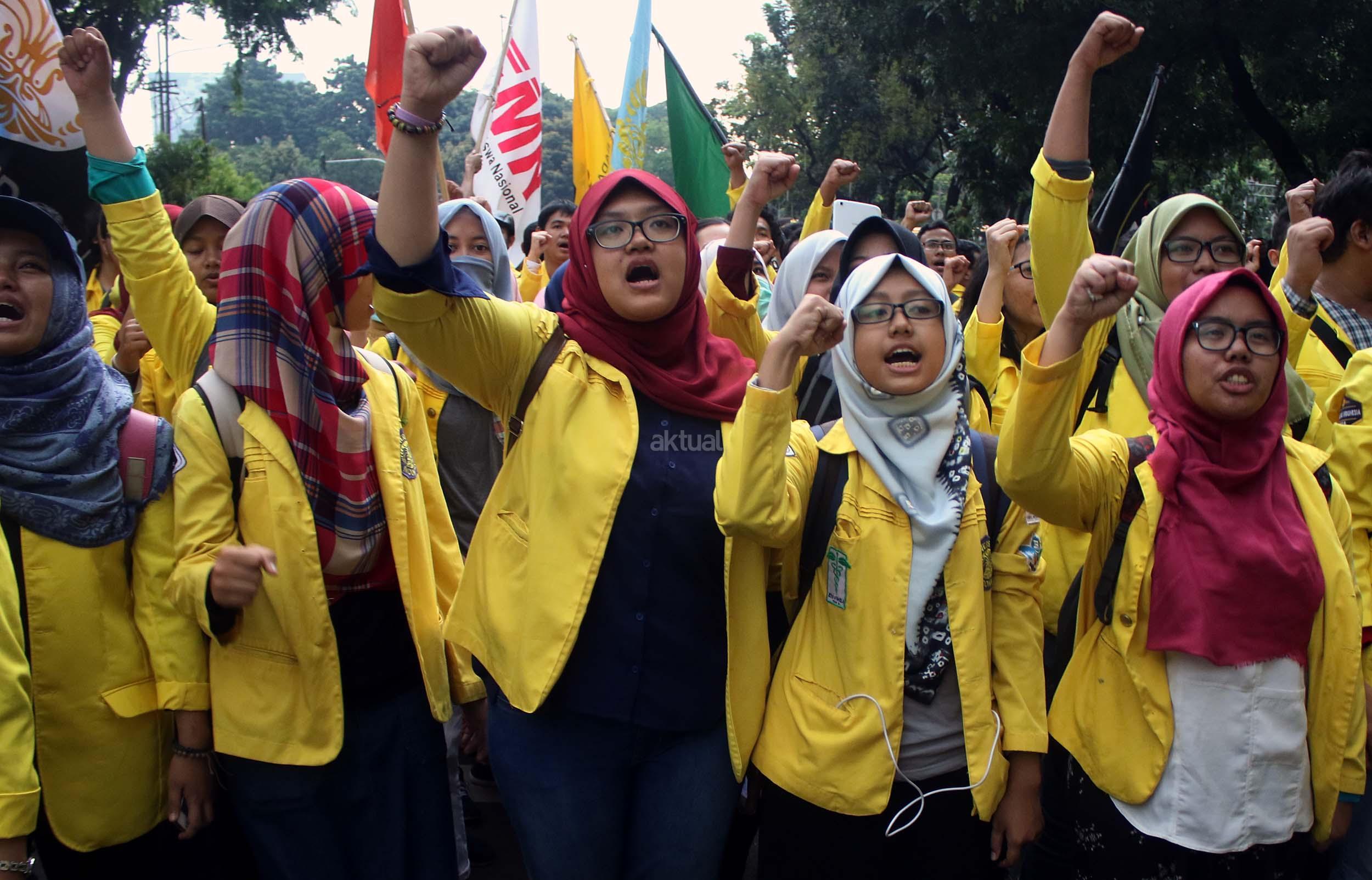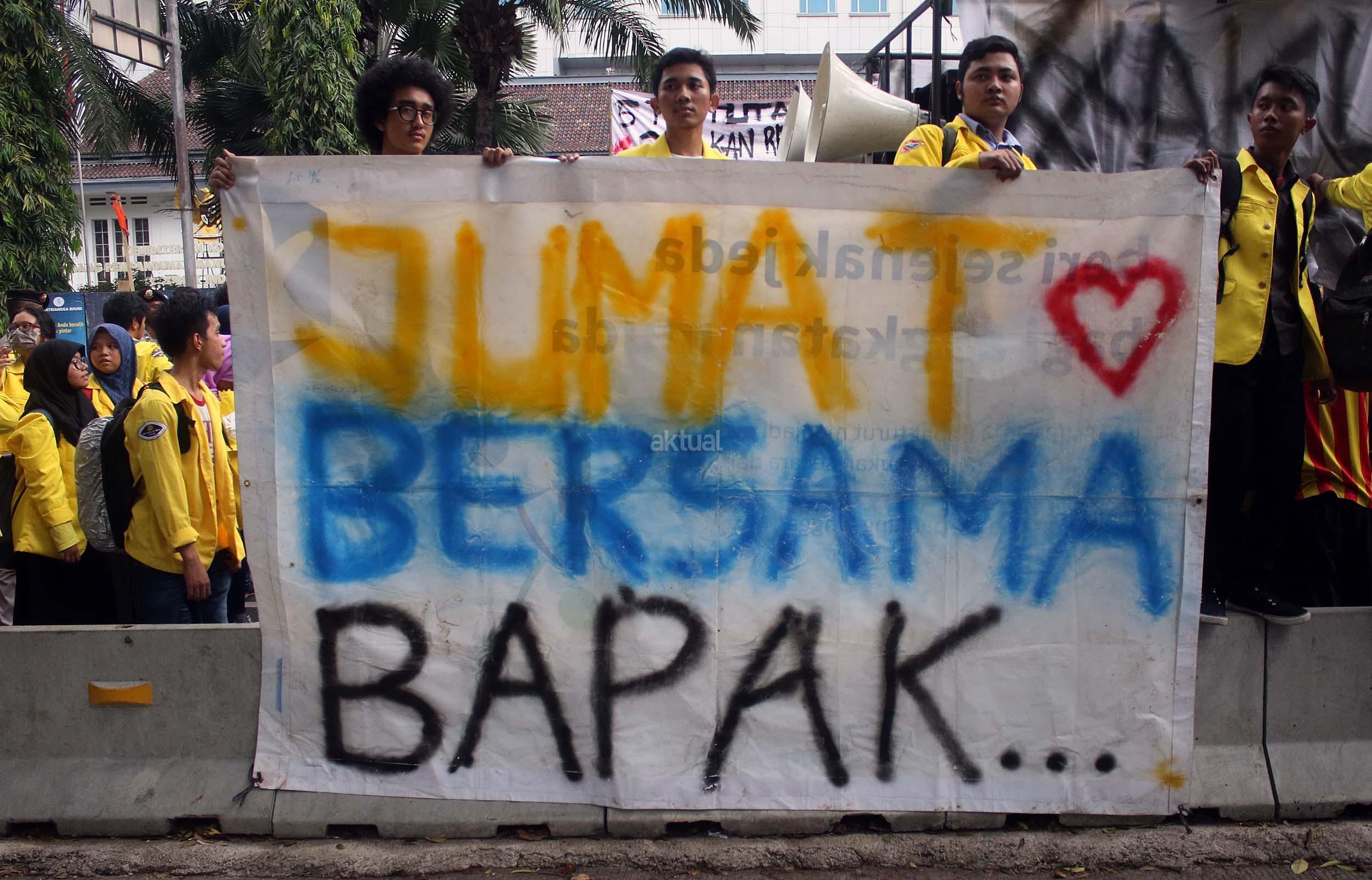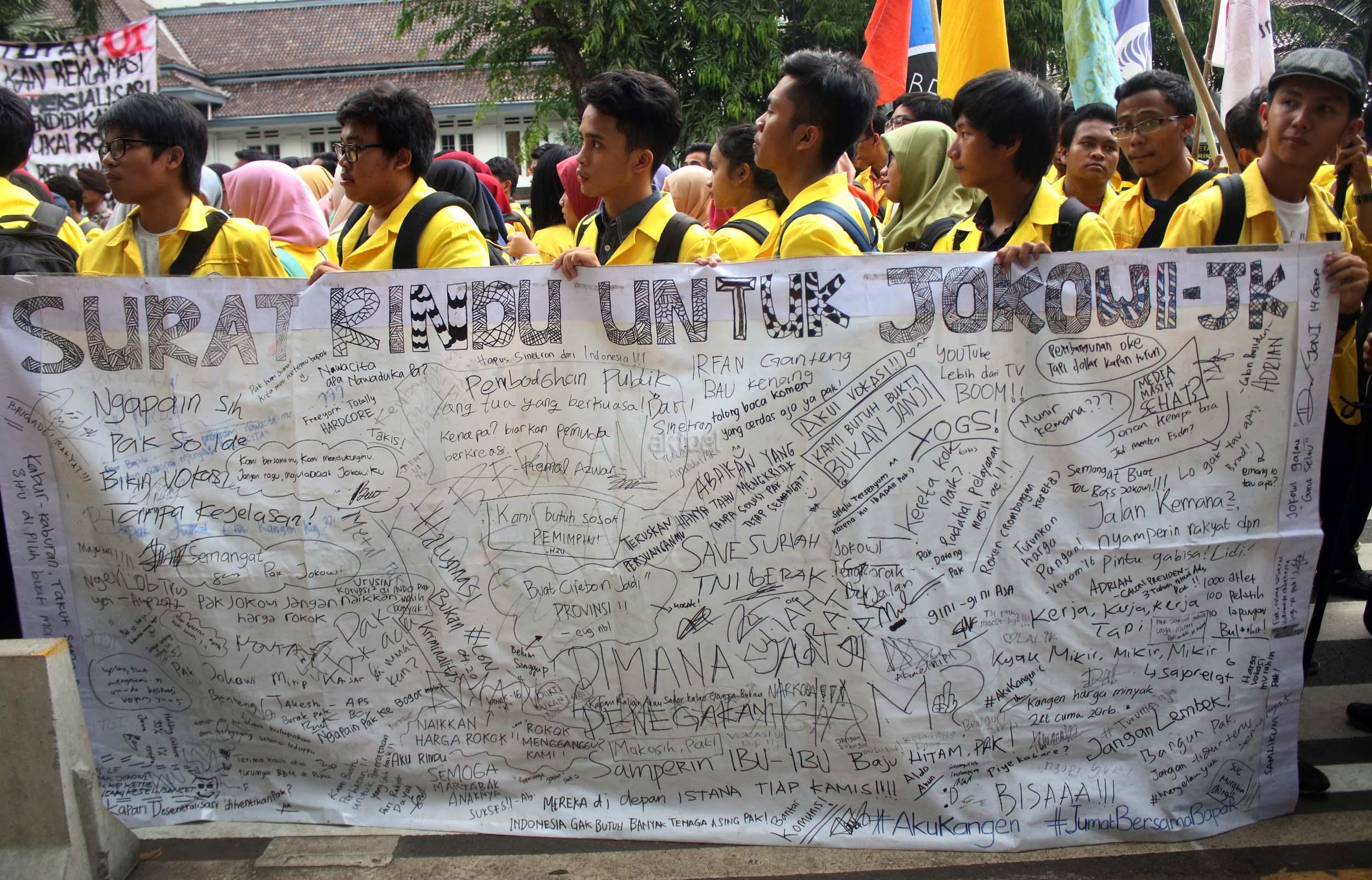 Ratusan mahasiswa Universitas Indonesia (UI) yang tergabung dalam BEM UI melakukan aksi unjuk rasa di Jalan. Merdeka Selatan, Jakarta, Jumat (28/10/2016). Dalam aksinya BEM UI memperingati Hari Sumpah Pemuda ke-88 dan mengkritisi dua tahun kinerja pemerintahan Jokowi-JK.