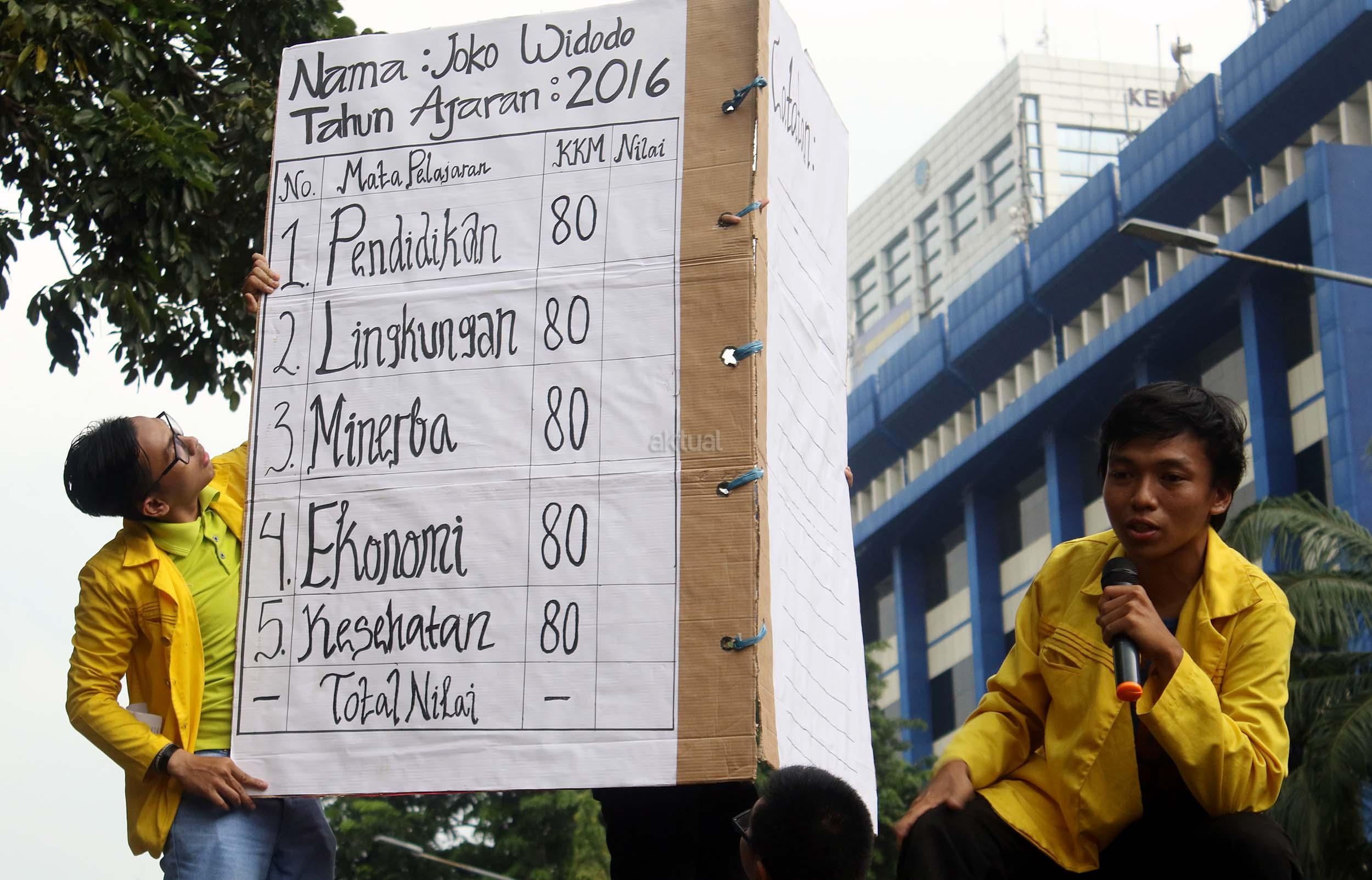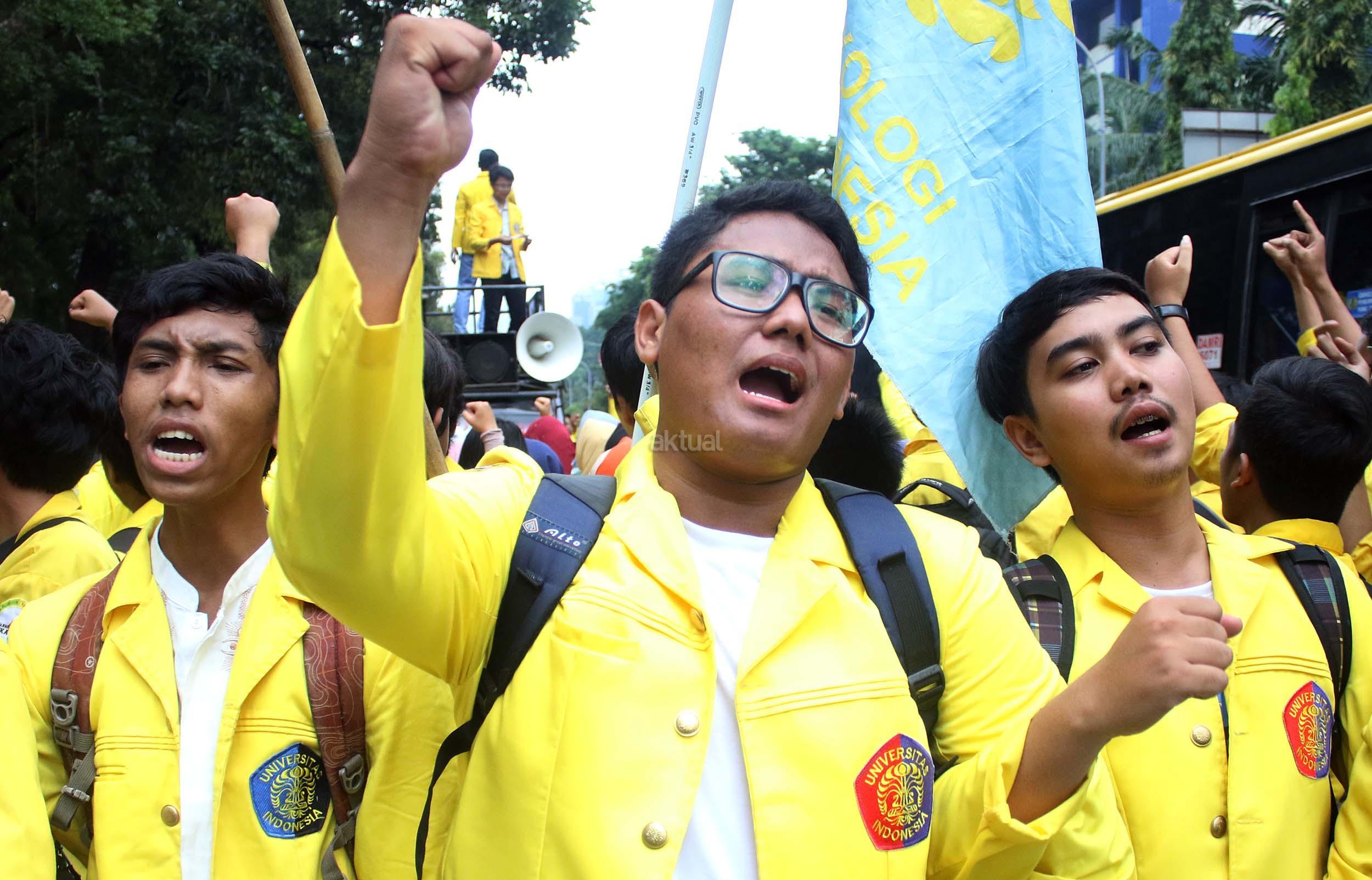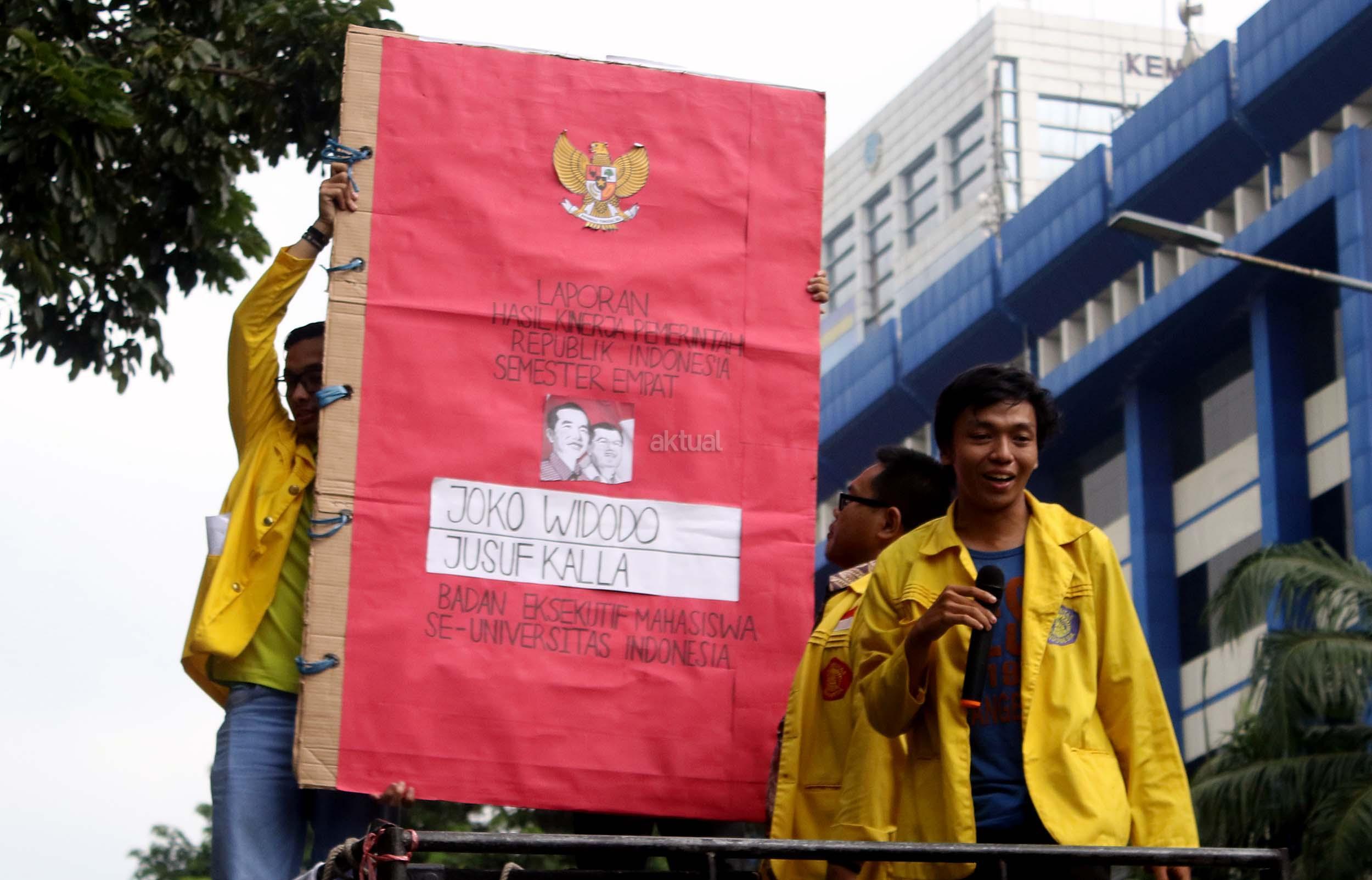 Ratusan mahasiswa Universitas Indonesia (UI) yang tergabung dalam BEM UI melakukan aksi unjuk rasa di Jalan. Merdeka Selatan, Jakarta, Jumat (28/10/2016). Dalam aksinya BEM UI memperingati Hari Sumpah Pemuda ke-88 dan mengkritisi dua tahun kinerja pemerintahan Jokowi-JK. AKTUAL/Munzir