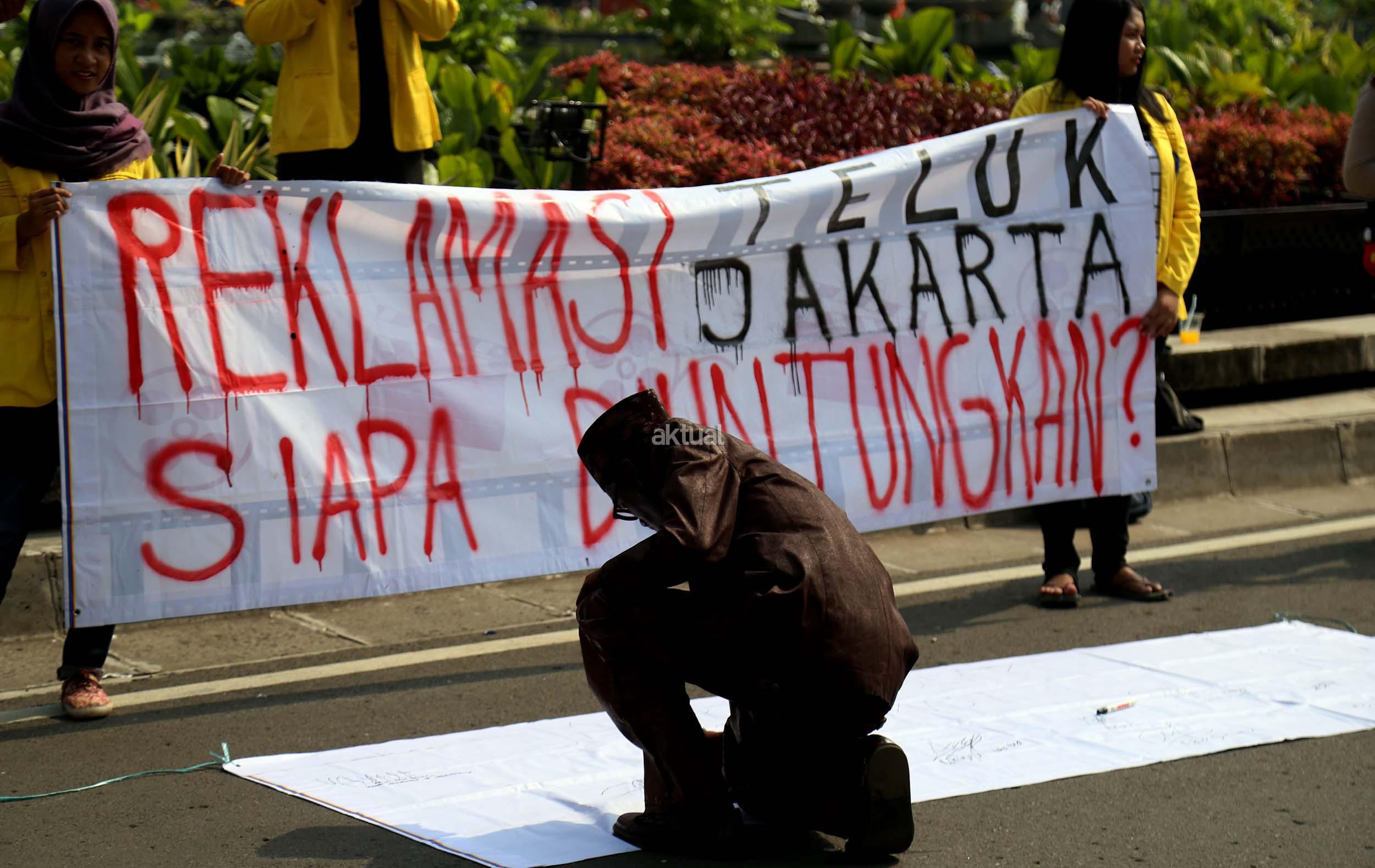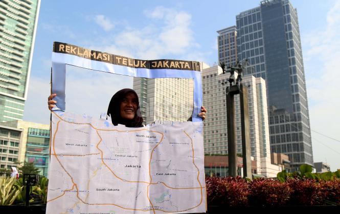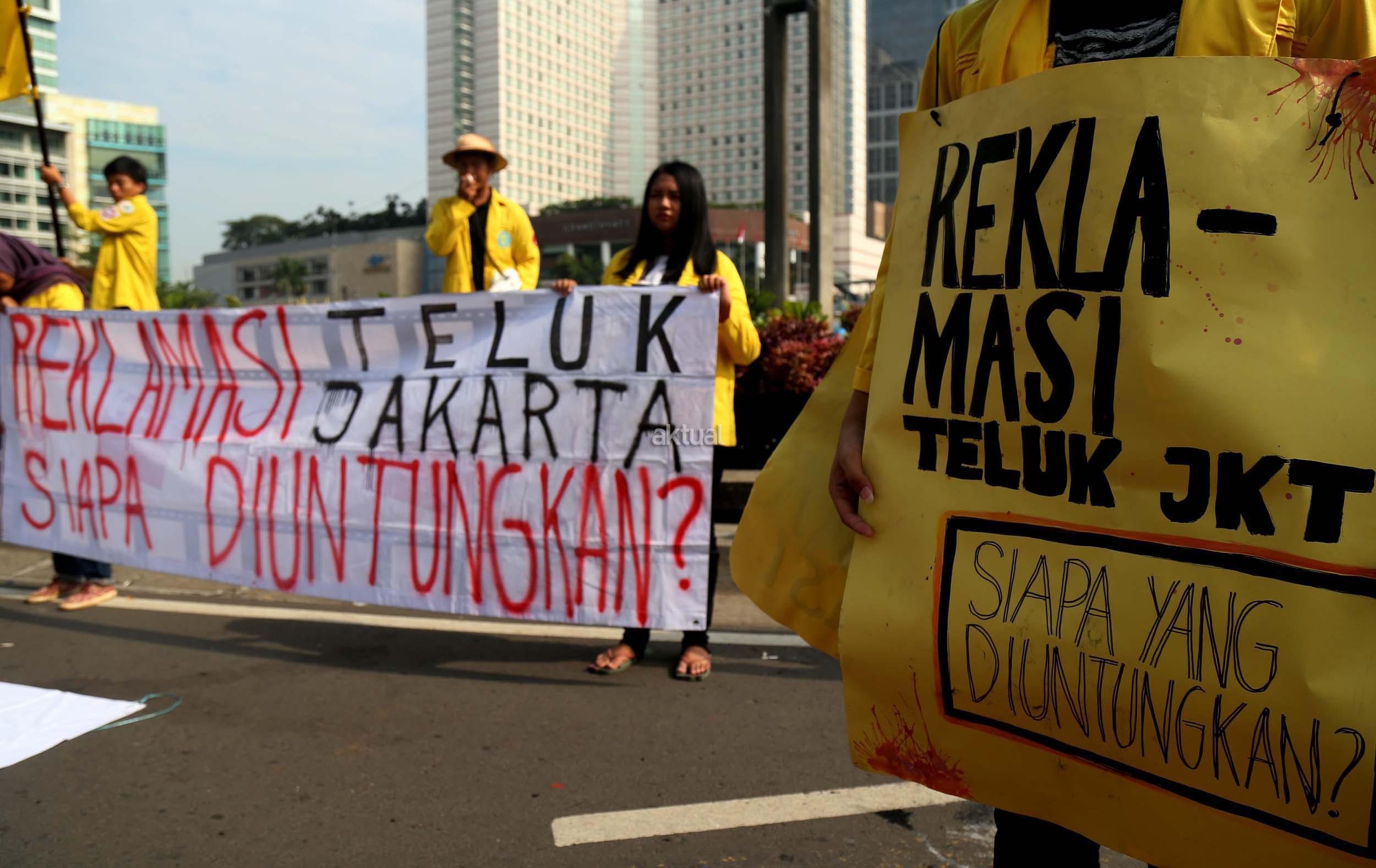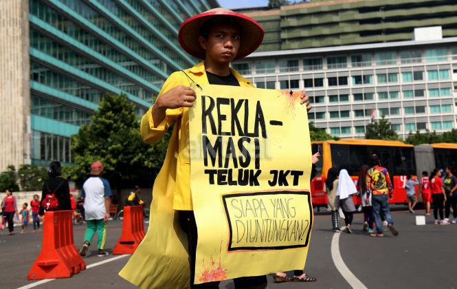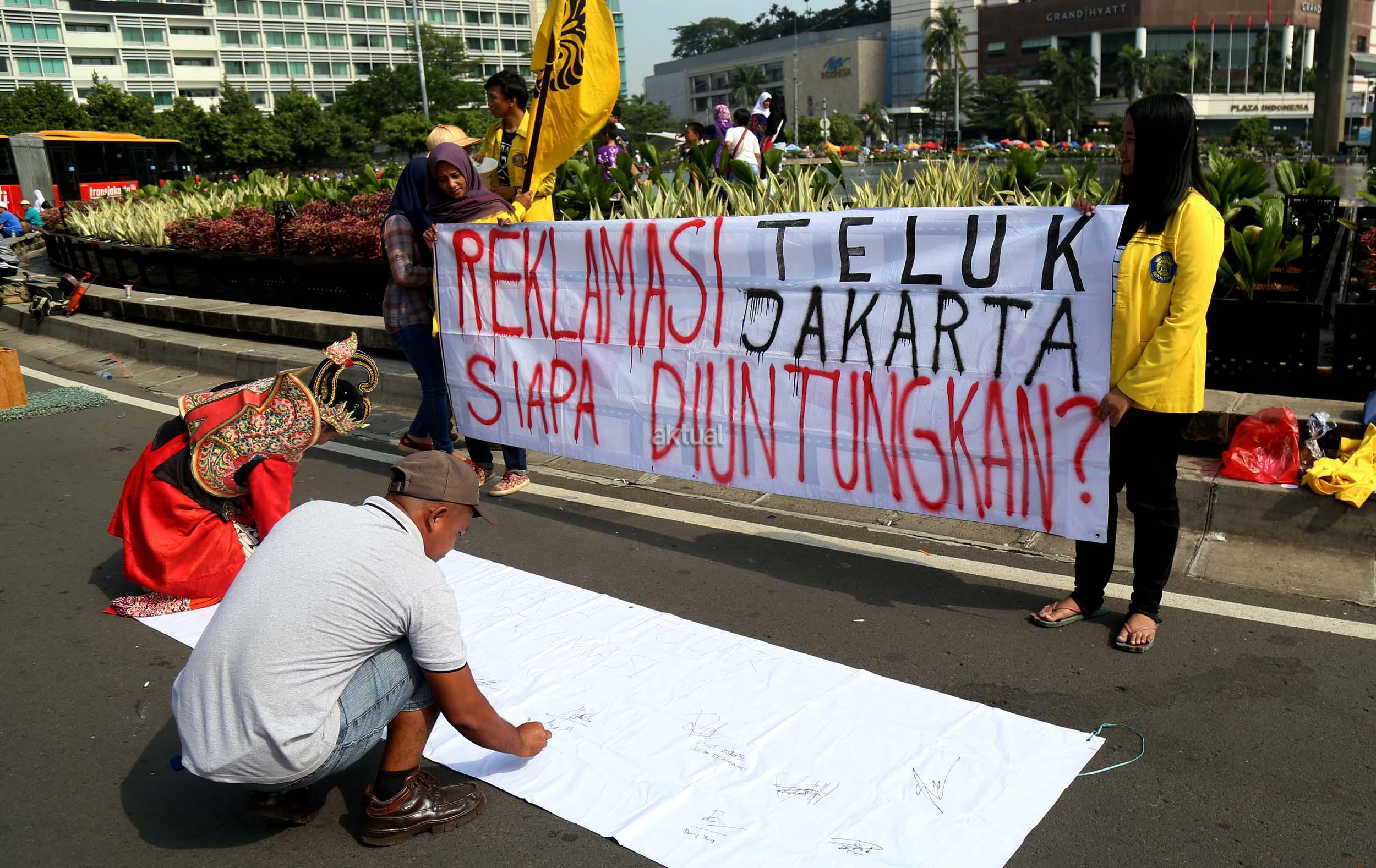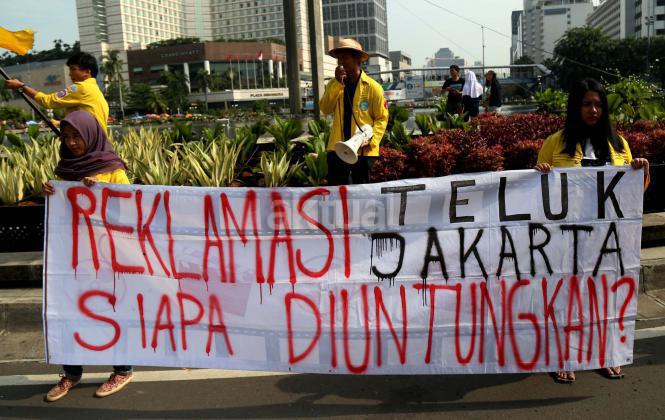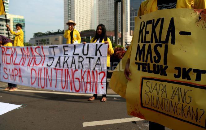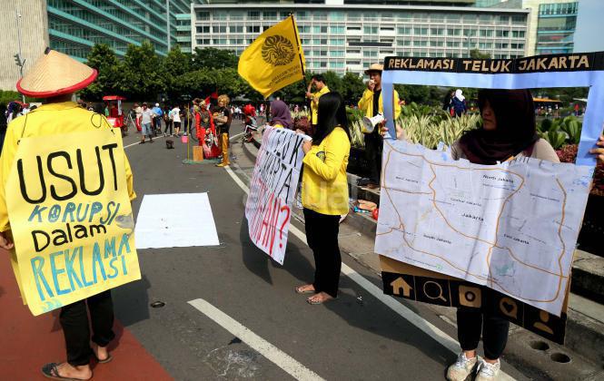 Puluhan mahasiswa dari Badan Eksekutif Mahasiswa Universitas Indonesia (BEM UI) melakukan aksi Tolak Reklamasi Teluk Jakarta, Bunderan HI, Jakarta, Minggu (10/4/2016). Dalam akasinya BEM UI mempertanyakan Reklamasi Teluk Jakarta siapa yang diuntungkan dan mendesak agar Usut Korupsi dalam kasus Reklamasi Teluk Jakarta.