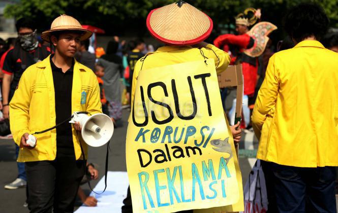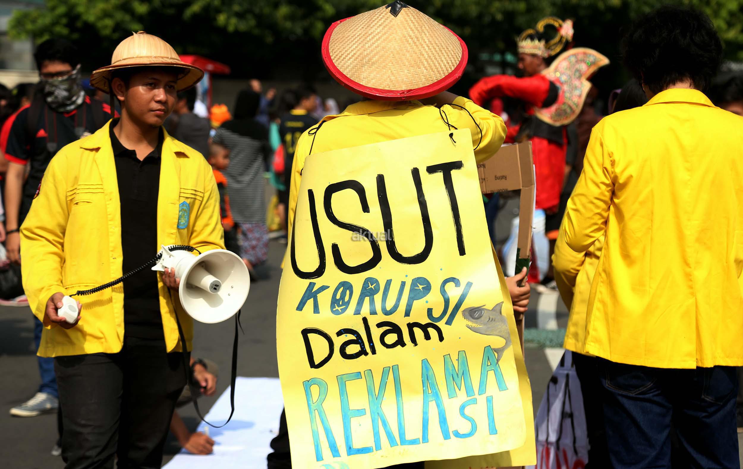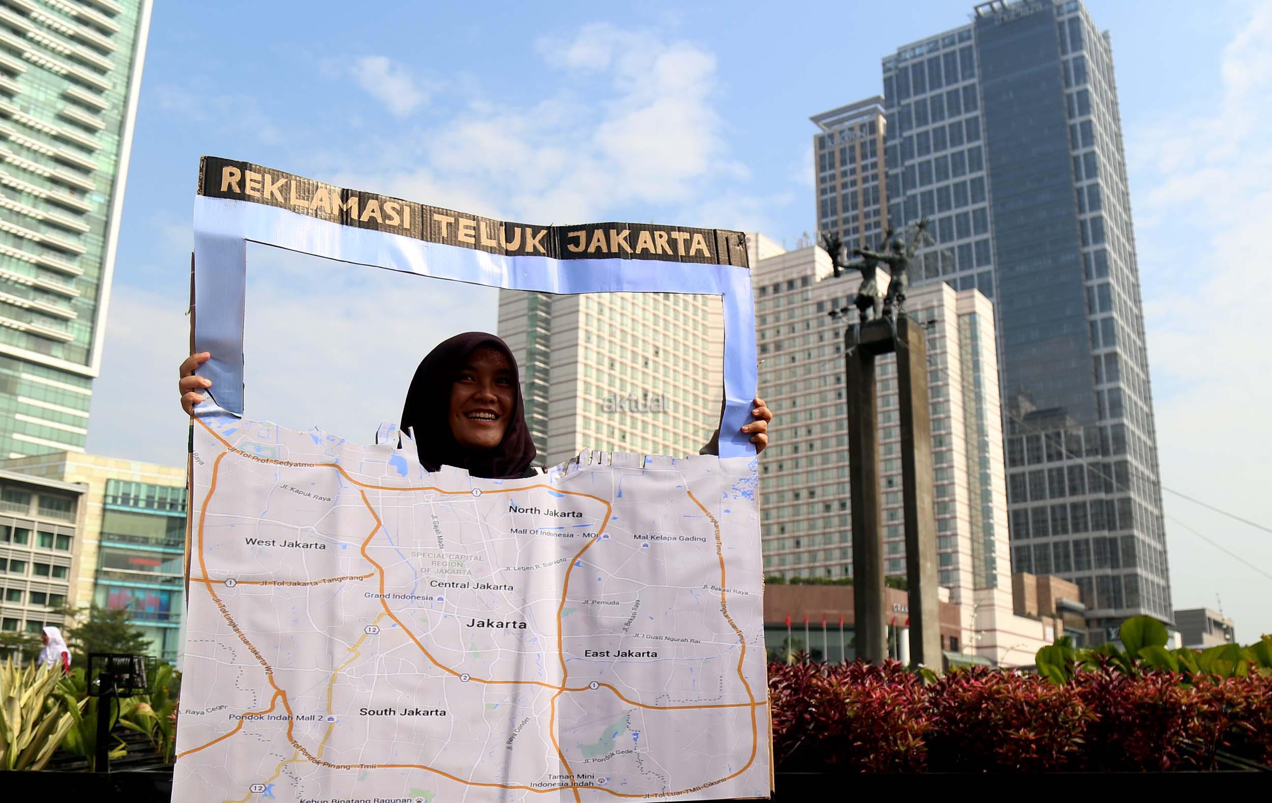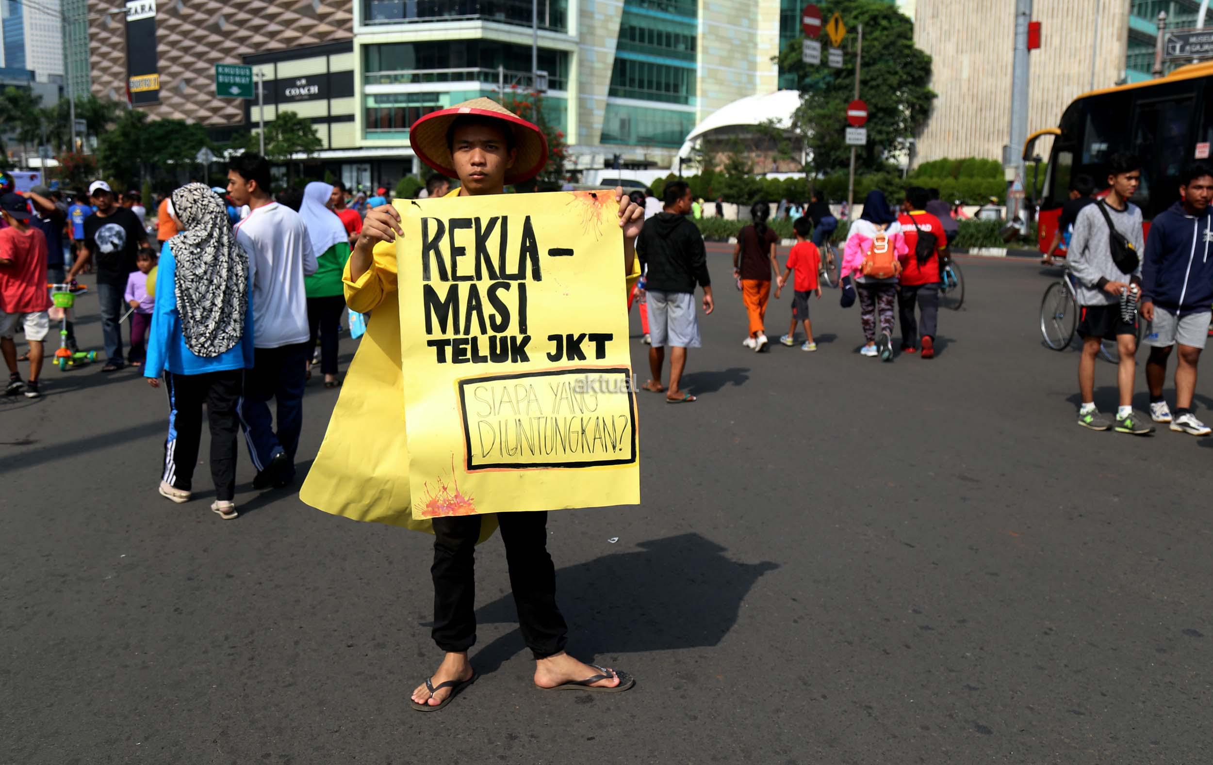 Puluhan mahasiswa dari Badan Eksekutif Mahasiswa Universitas Indonesia (BEM UI) melakukan aksi Tolak Reklamasi Teluk Jakarta, Bunderan HI, Jakarta, Minggu (10/4/2016). Dalam akasinya BEM UI mempertanyakan Reklamasi Teluk Jakarta siapa yang diuntungkan dan mendesak agar Usut Korupsi dalam kasus Reklamasi Teluk Jakarta.