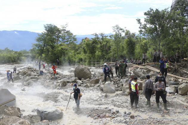 Petugas gabungan menyisir lokasi longsor di areal pembangunan Pembangkit Listrik Tenaga Panas Bumi (geothermal) PT Pertamina Gheotermal Energy (PGE) di Kecamatan Lebong Selatan, Kabupaten Lebong, Bengkulu, Sabtu (30/4). Tanah longsor menimbun kamp pekerja dan warung yang berada di lokasi pembangunan Pembangkit Listrik Tenaga Panas Bumi (geothermal) menyebabkan dua orang meninggal dunia, tiga orang ditemukan selamat dan empat orang lainnya masih dalam pencarian. ANTARA FOTO/David Muharmansyah/kye/16