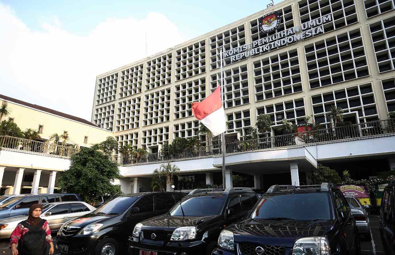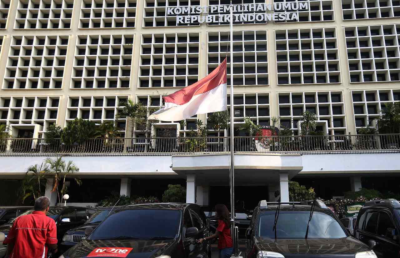 Bendera Merah Putih dikibarkan setengah tiang di Gedung Komisi Pemilihan Umum (KPU), Jakarta, Senin (11/7/2016). Bendera setengah tiang tersebut ditujukan untuk berkabung atas tutup usianya Ketua KPU Husni Kamil Manik pada Kamis (7/7/2016).