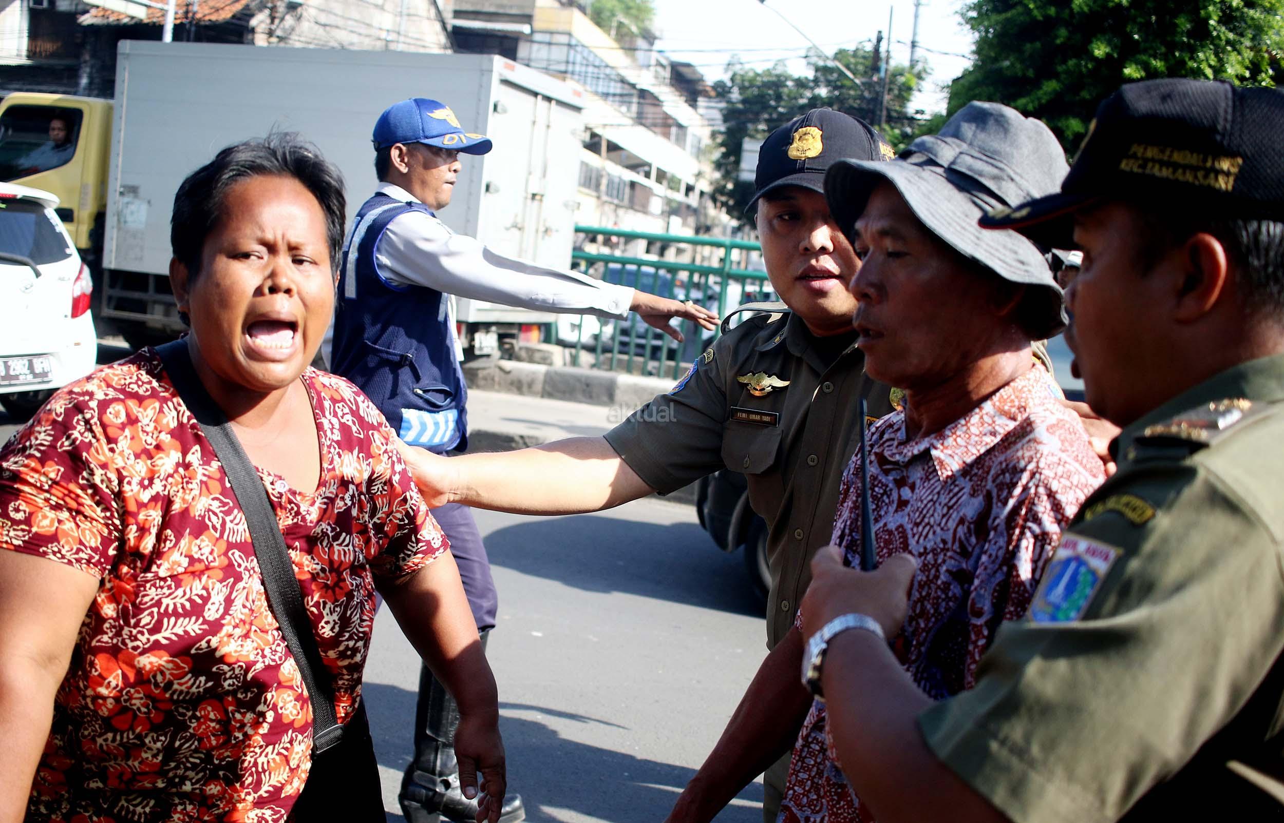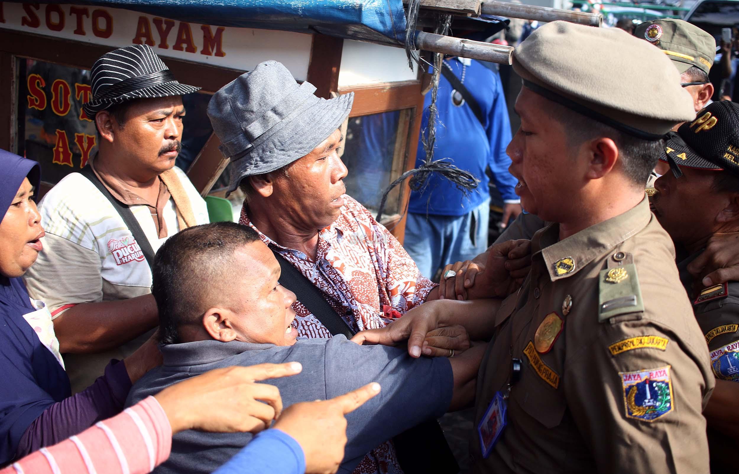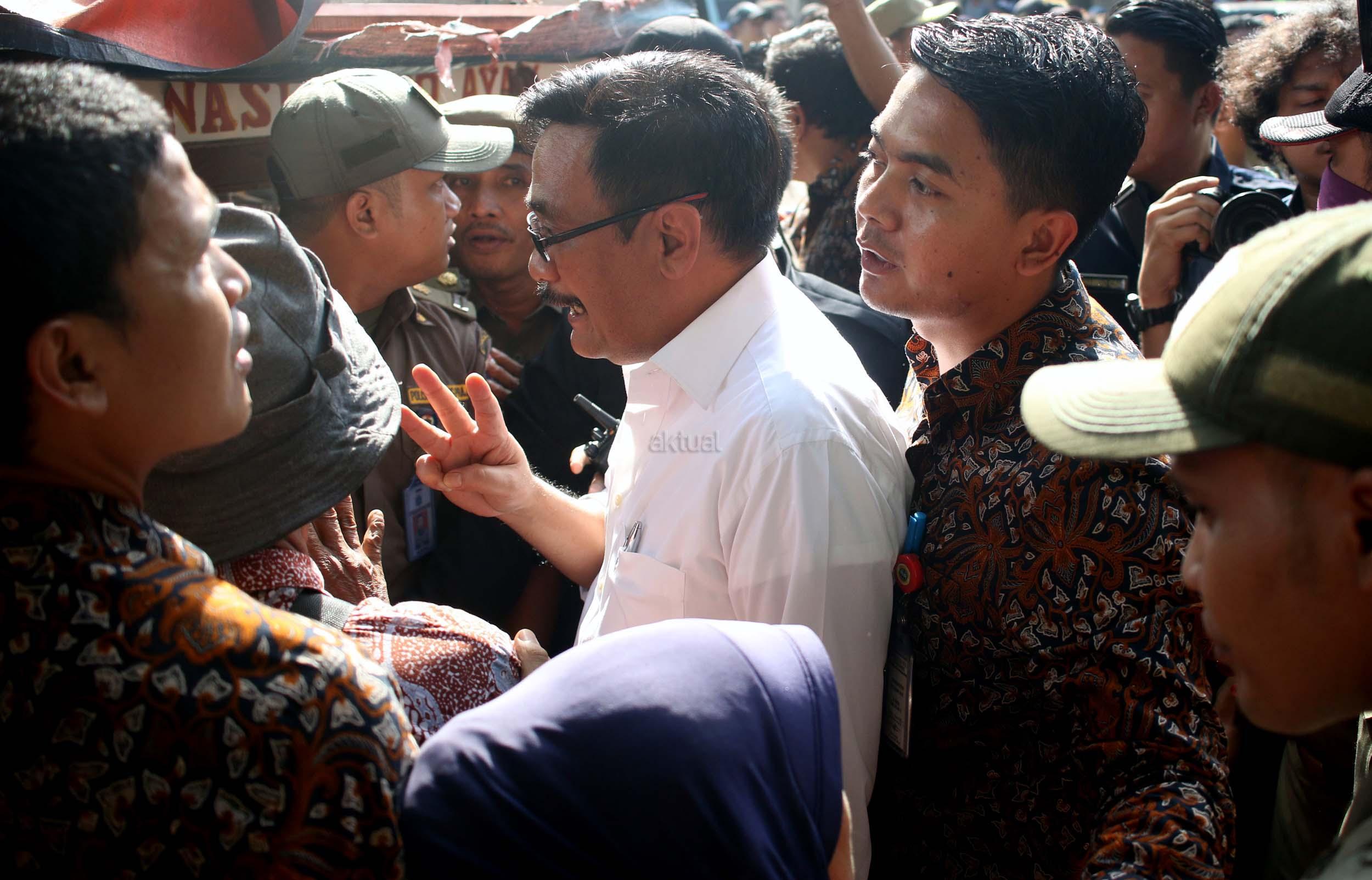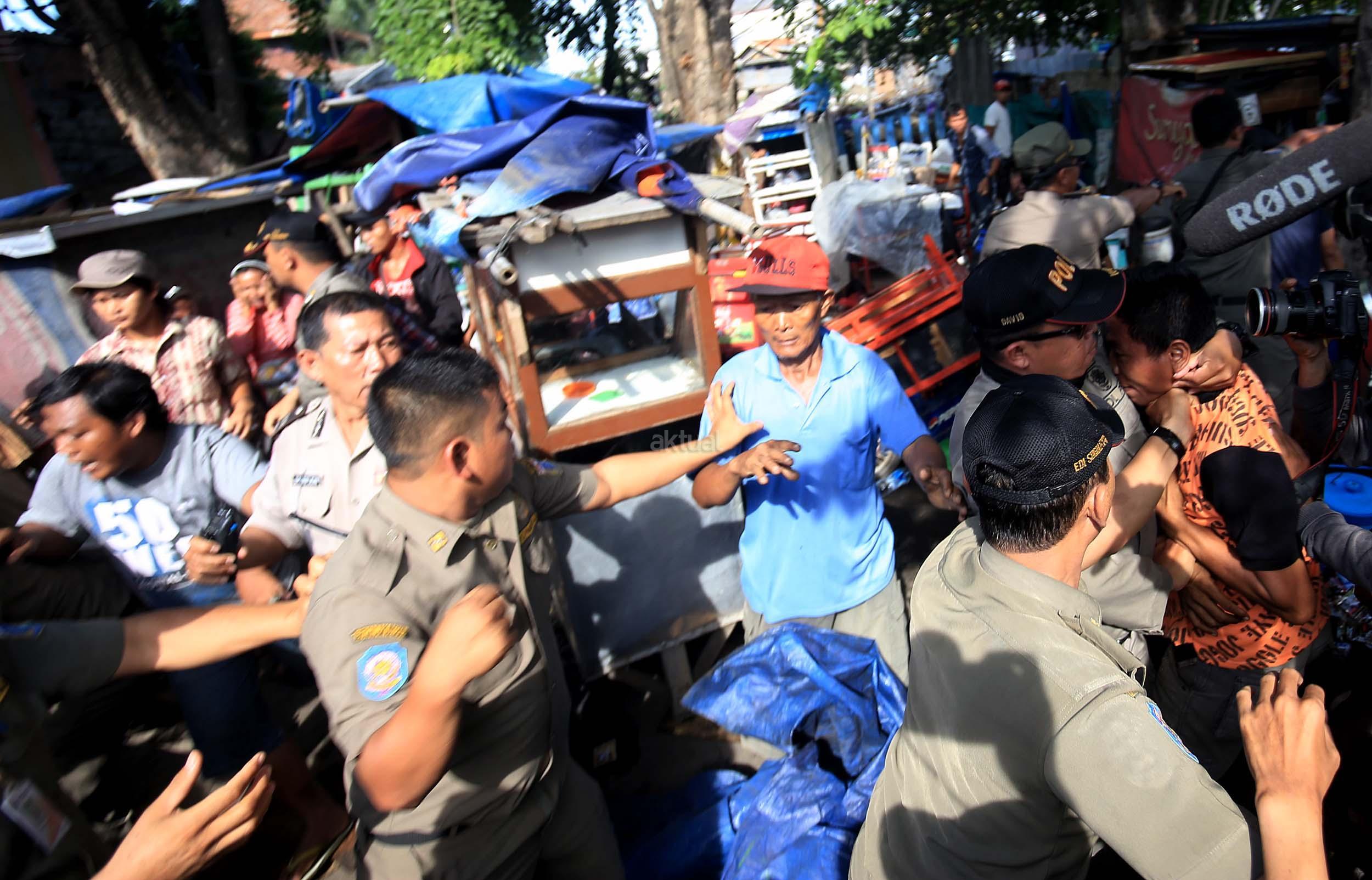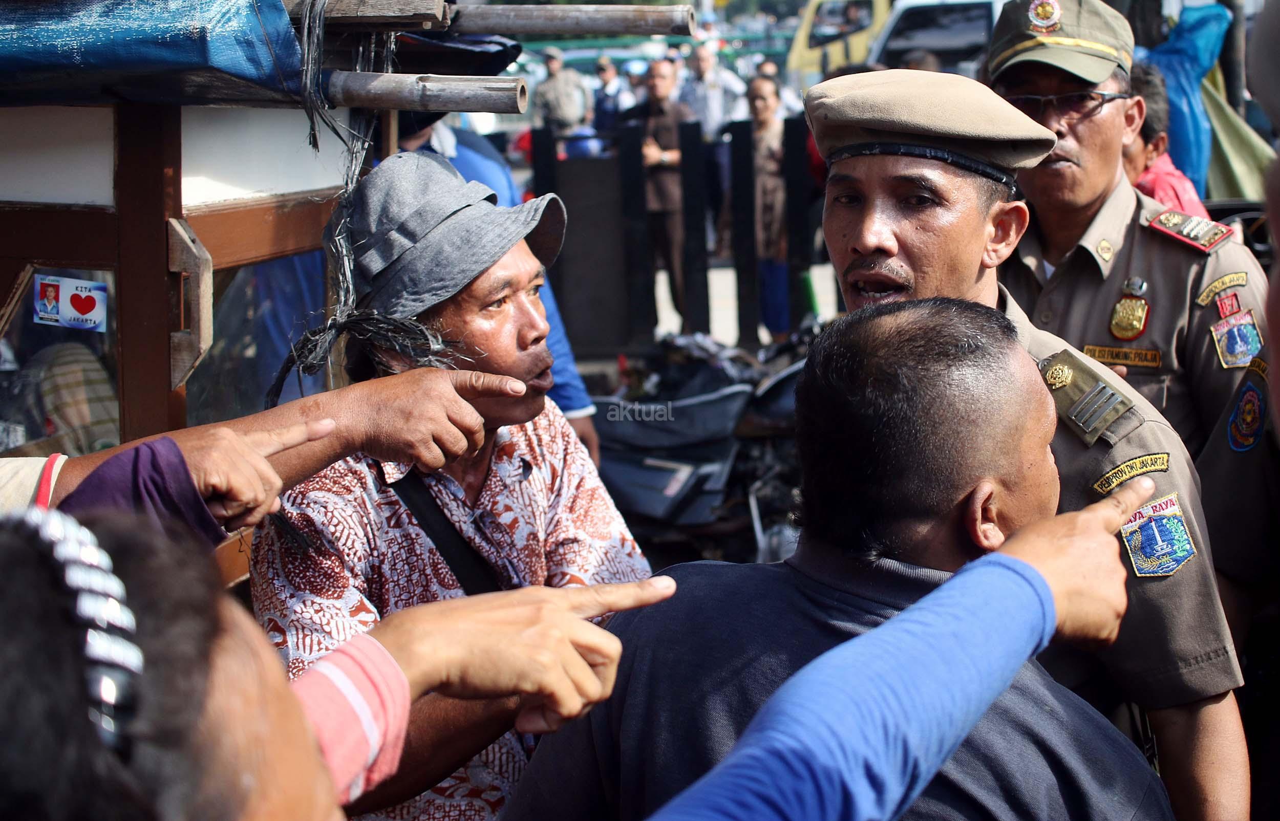 Suasana ricuh terjadi saat Djarot meninjau kawasan tersebut. Pedagang yang kebanyakan ibu-ibu terlihat menangis dan memarahi personel Satpol PP yang telah mengangkut gerobak para pedagang. AKTUAL/Munzir