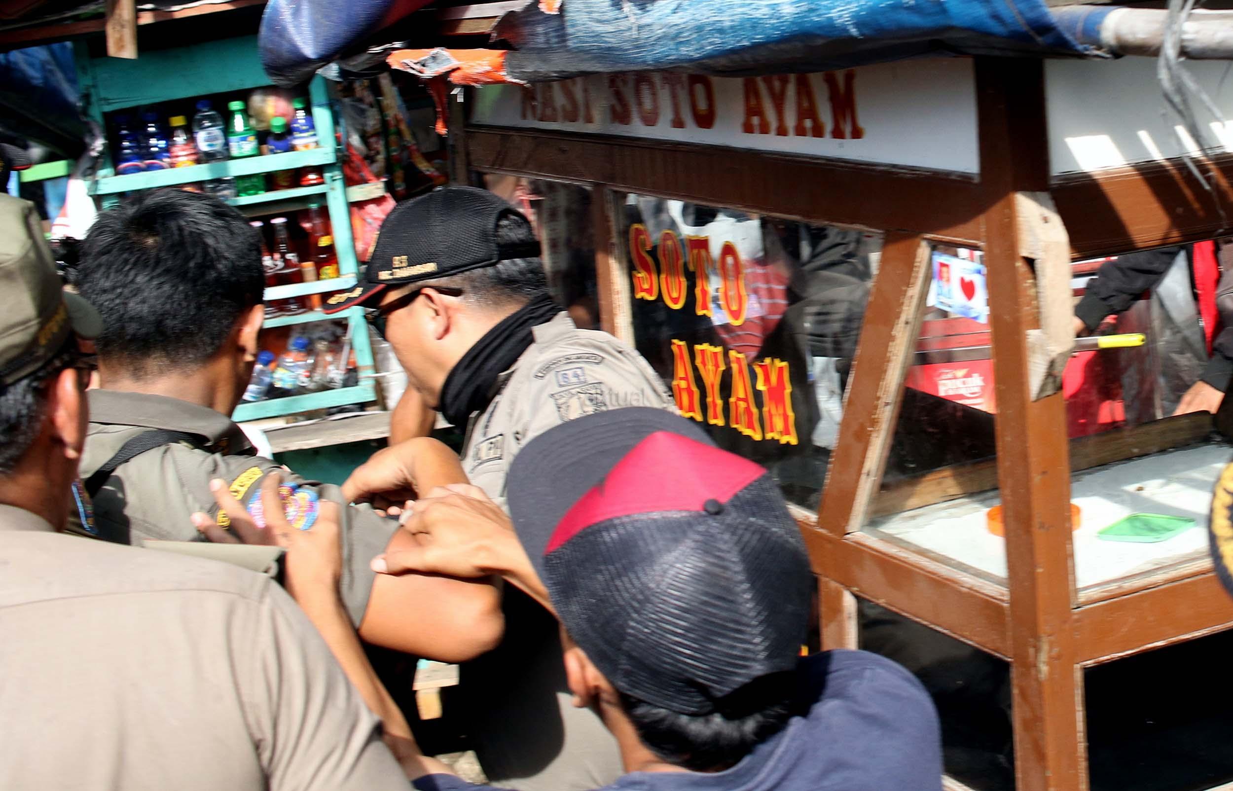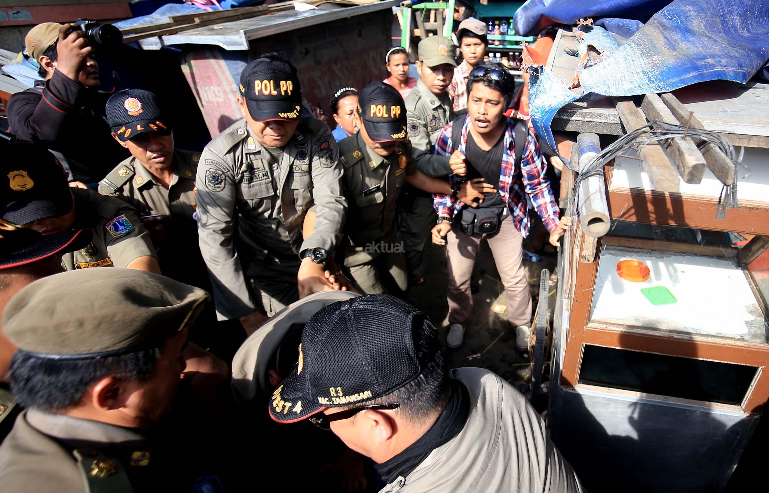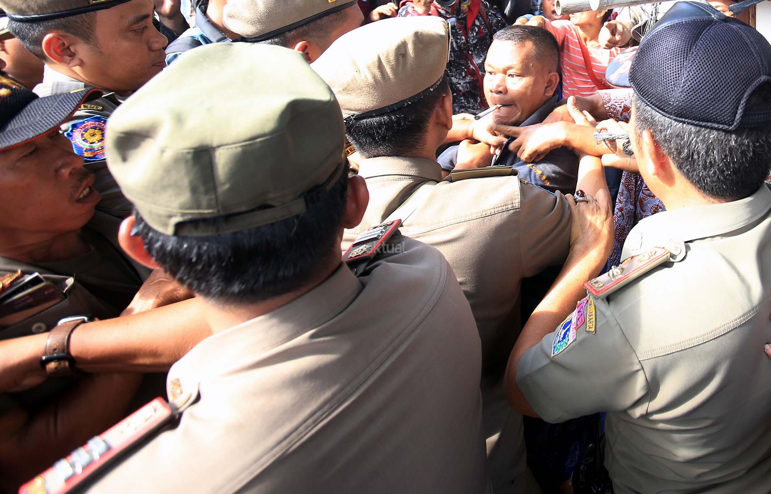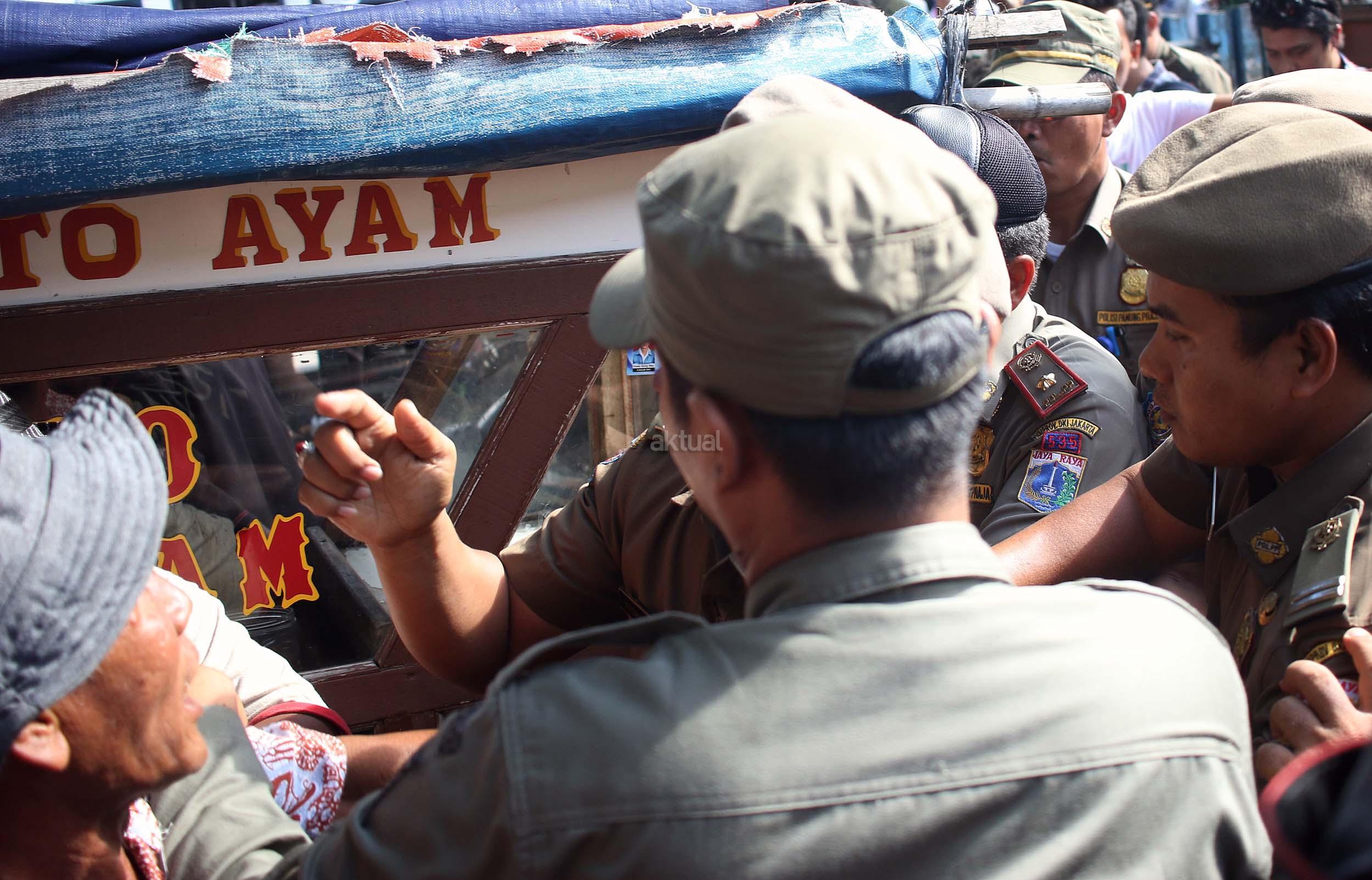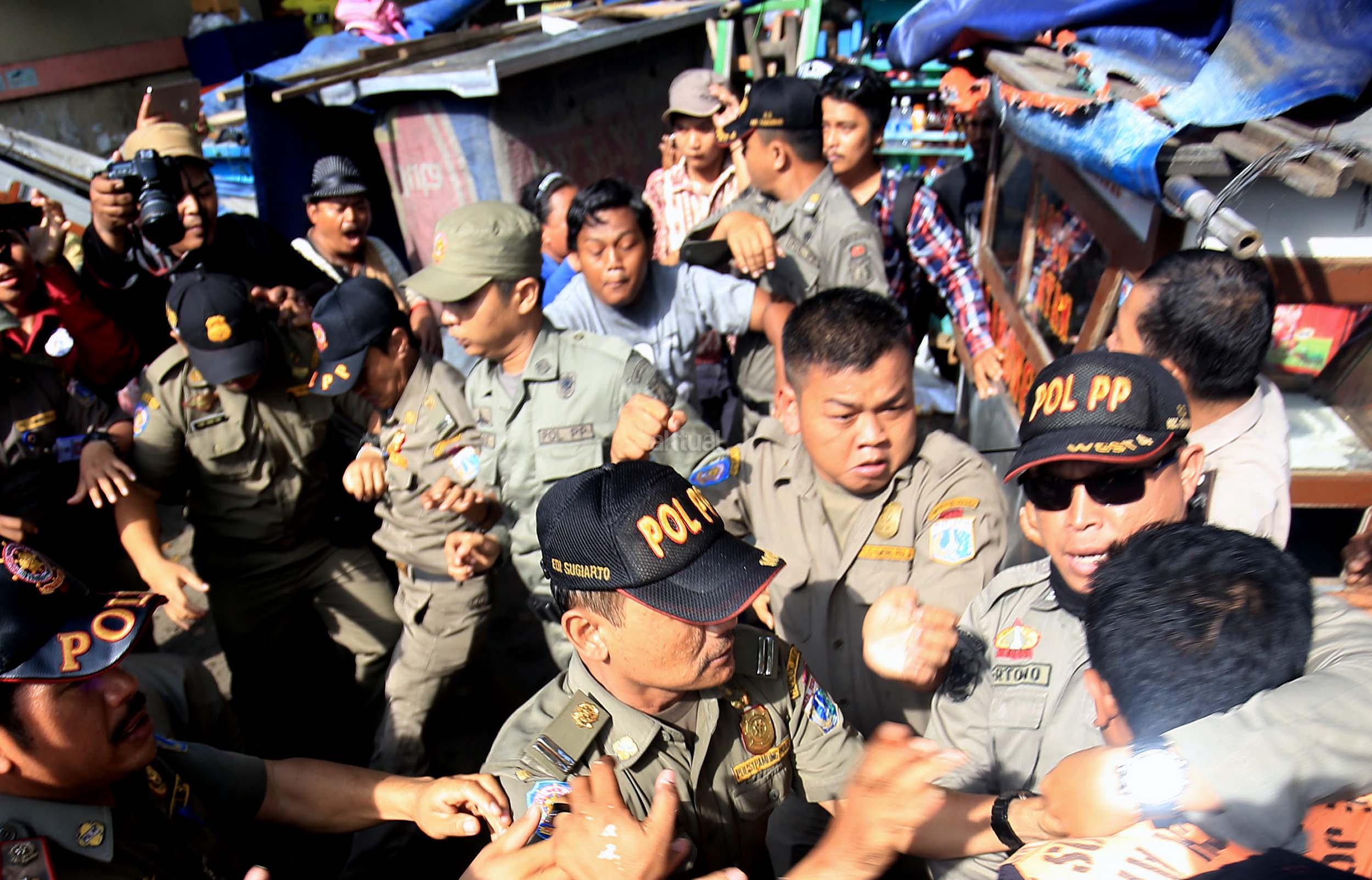 Suasana ricuh terjadi saat Djarot meninjau kawasan tersebut. Pedagang yang kebanyakan ibu-ibu terlihat menangis dan memarahi personel Satpol PP yang telah mengangkut gerobak para pedagang. AKTUAL/Munzir