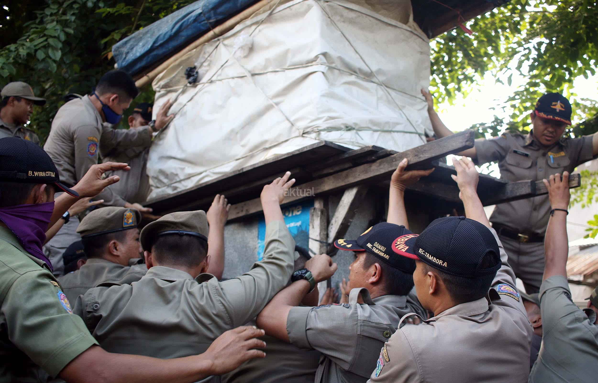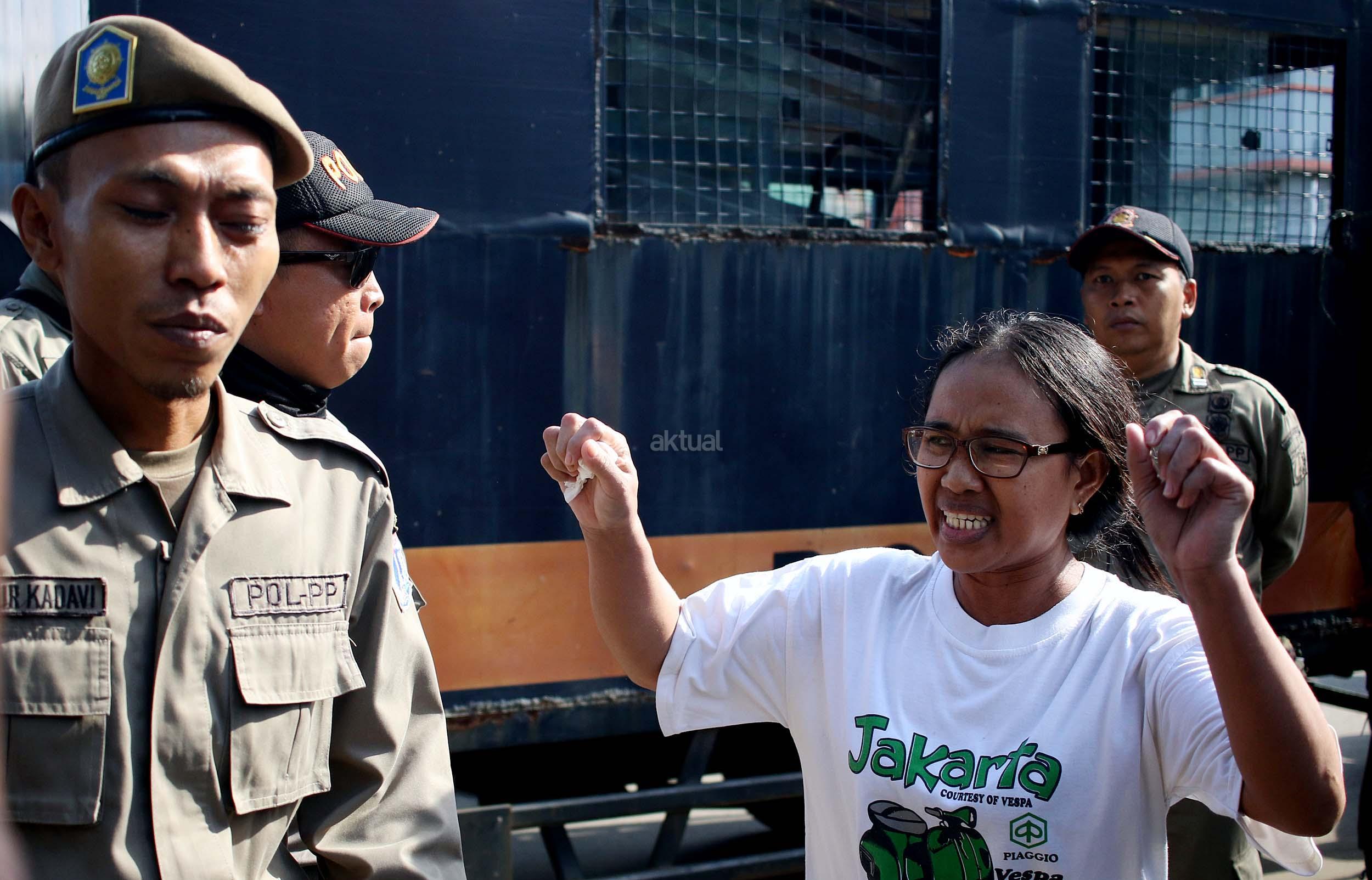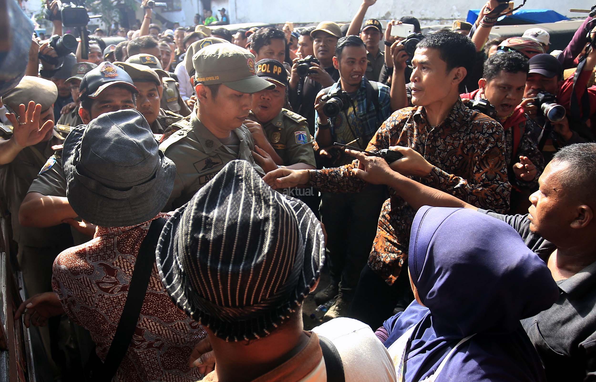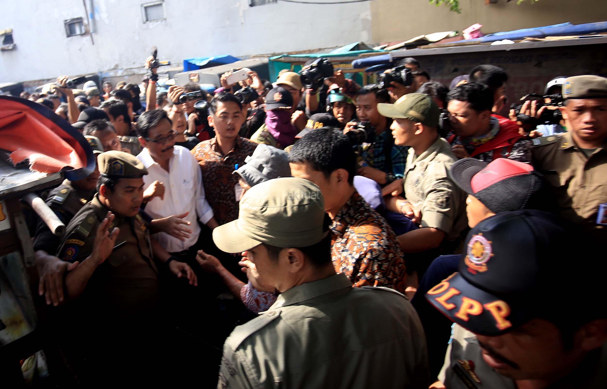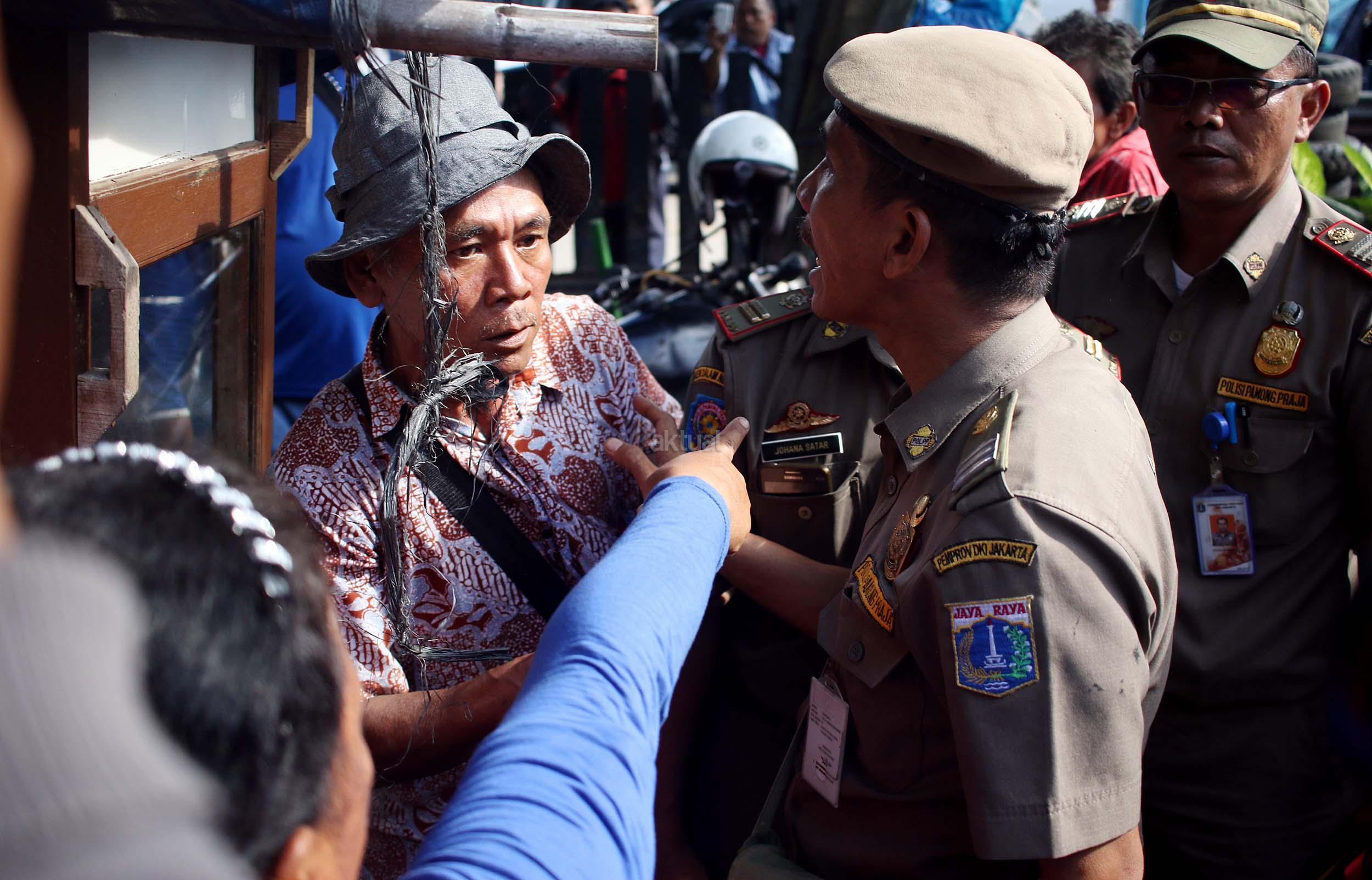 Suasana ricuh terjadi saat Djarot meninjau kawasan tersebut. Pedagang yang kebanyakan ibu-ibu terlihat menangis dan memarahi personel Satpol PP yang telah mengangkut gerobak para pedagang. AKTUAL/Munzir