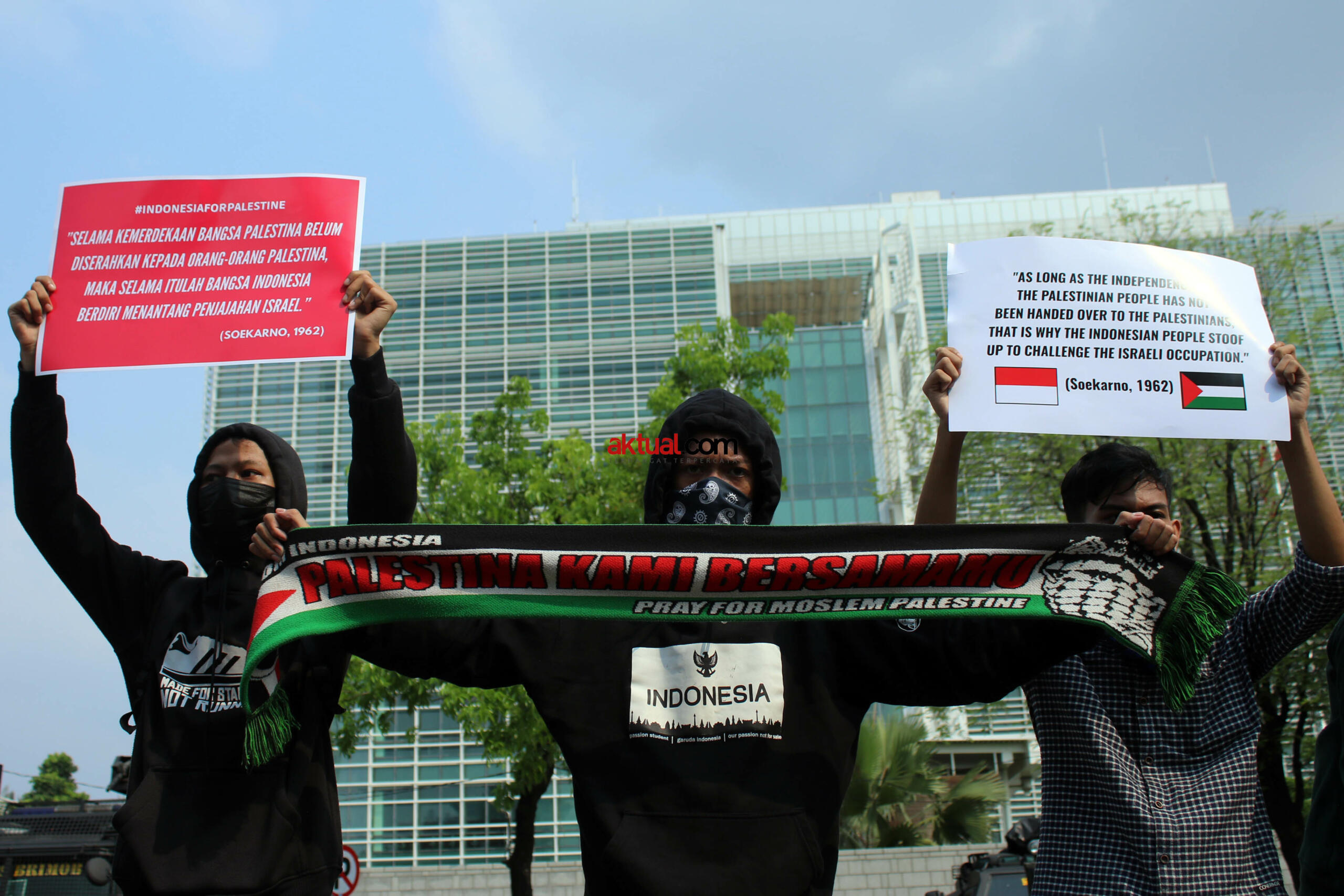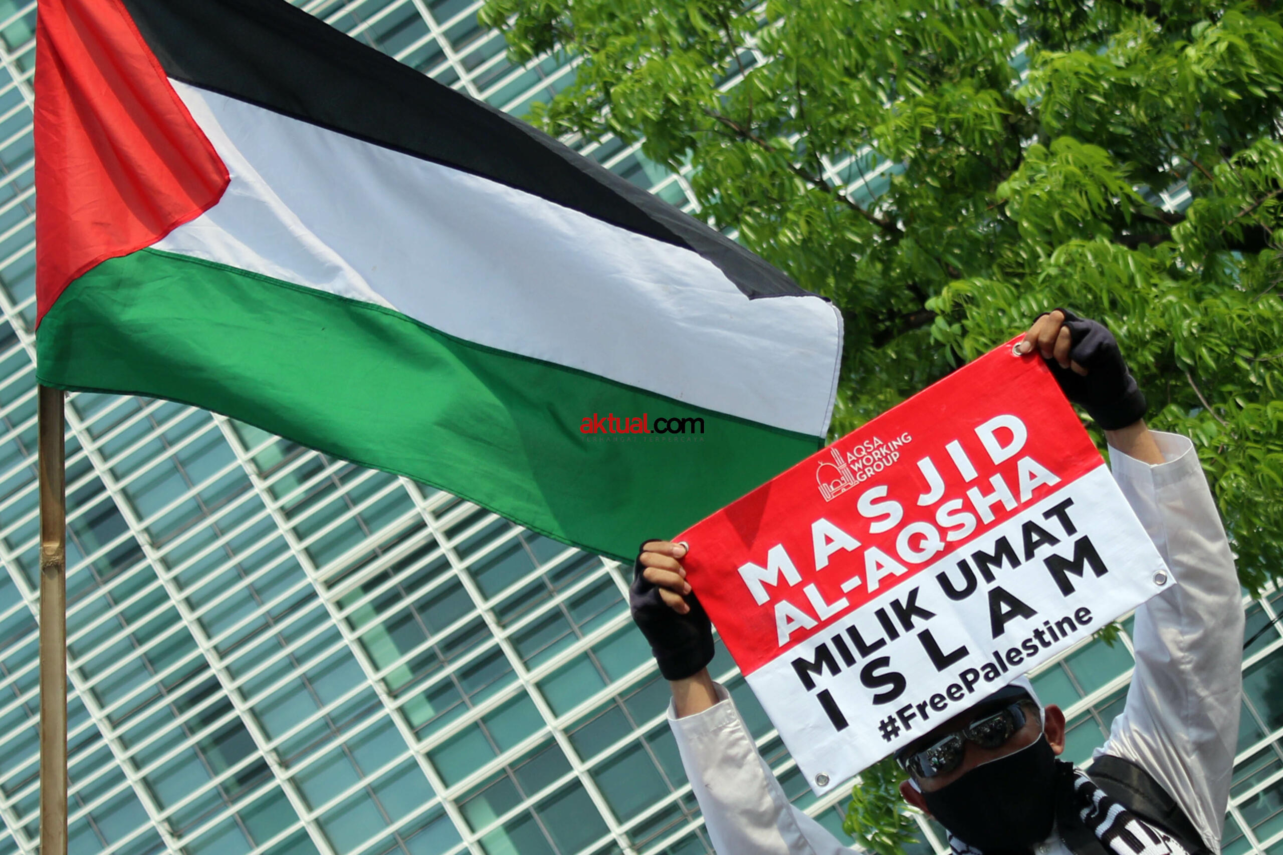 Aksi unjuk rasa peduli Palestina di Kedutaan Besar Amerika Serikat, yang berlokasi di Jl Medan Merdeka Selatan, Jakarta Pusat, Jumaat (21/5), diikuti oleh seribuan massa dari sejumlah elemen masyarakat dan mahasiswa. Aksi solidaritas yang digelar untuk memberikan dukungan pada Palestina serta mengecam aksi brutal tentara zionis Israel yang mengakibatkan ratusan warga sipil Palestina menjadi korban. Demonstrasi yang berjalan tertib diwarnai dengan beragam poster kecaman untuk Israel. AKTUAL / WARNOTO.