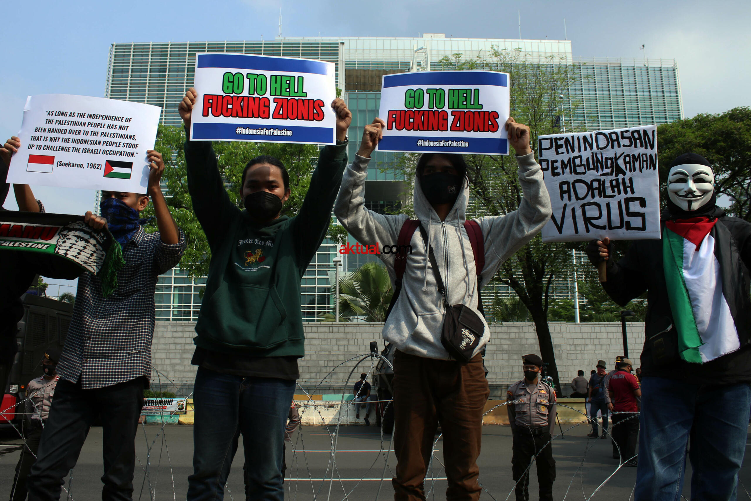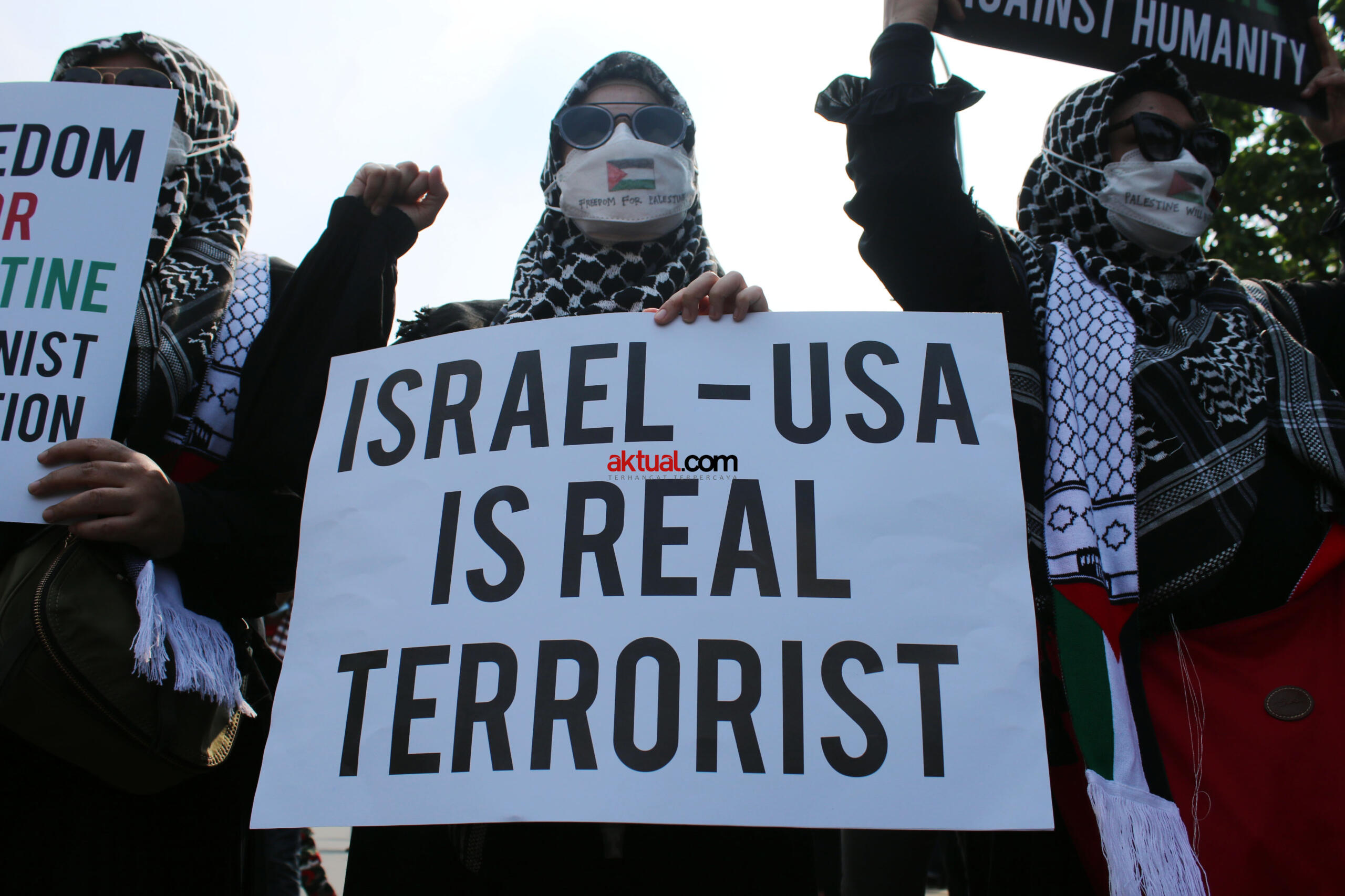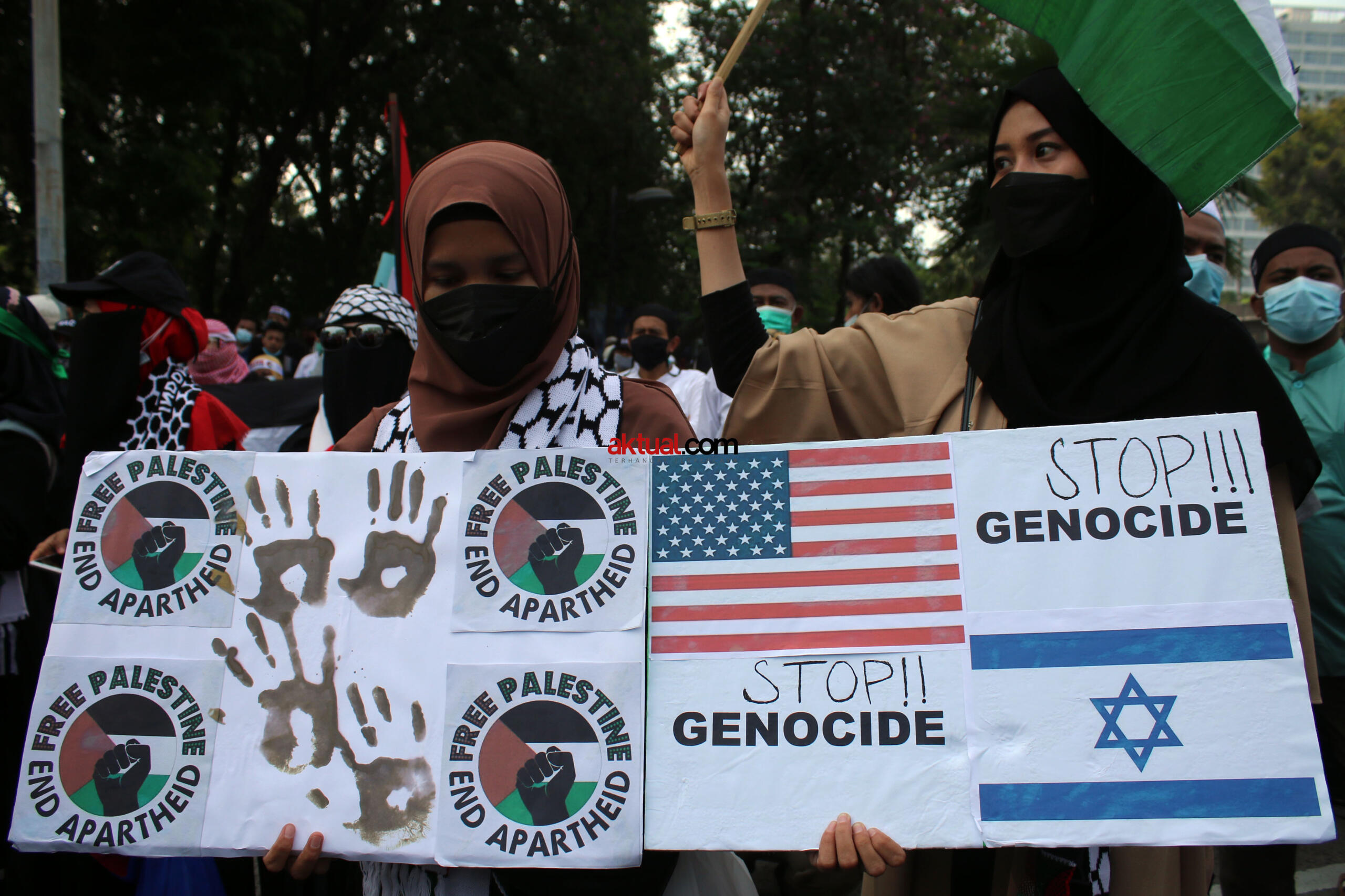 Massa aksi membentangkan poster kecaman untuk Israel ditengah jalannya aksi unjuk rasa di Kedutaan Besar Amerika Serikat, Jl Medan Merdeka Selatan, Jakarta Pusat, Jumaat (21/5). AKTUAL / WARNOTO
