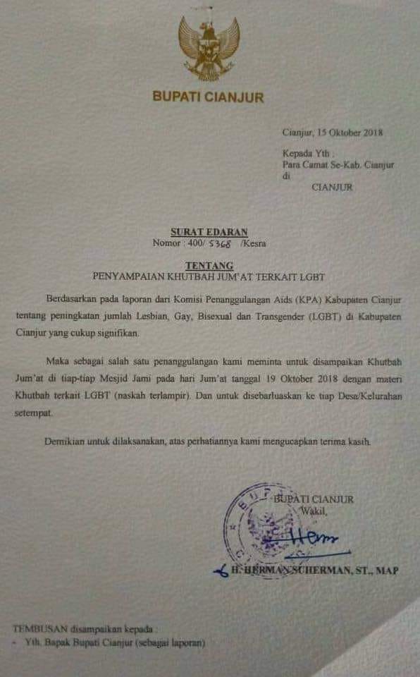 Anjuran ini ditegaskan dalam Surat Edaran Bupati Cianjur tentang Penyampaian Khutbah Jum’at Terkait LGBT. Surat bernomor 400/5368/Kesra yang diterbitkan 15 Oktober lalu ini ditujukan kepada seluruh Camat di Kabupaten Cianjur.