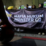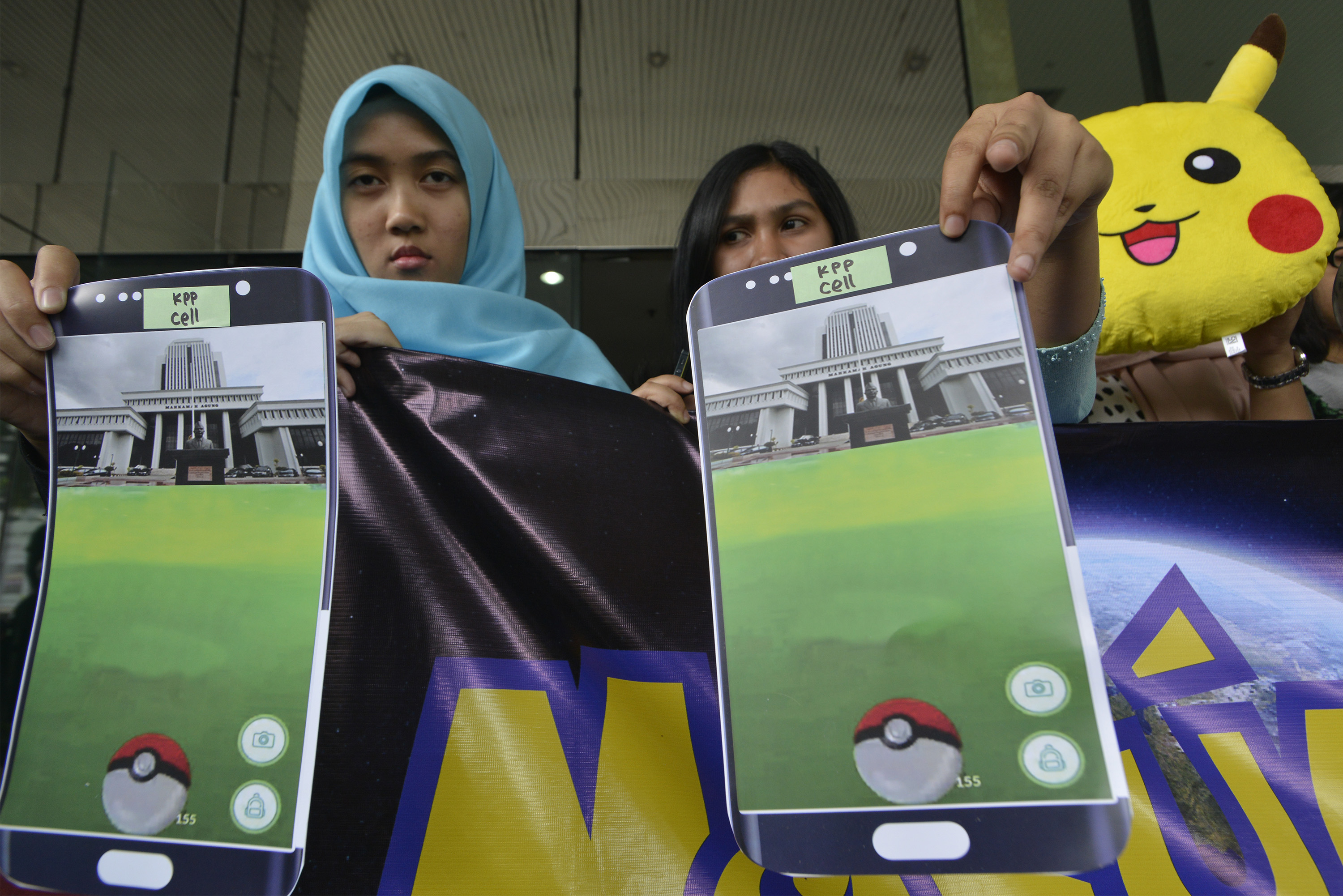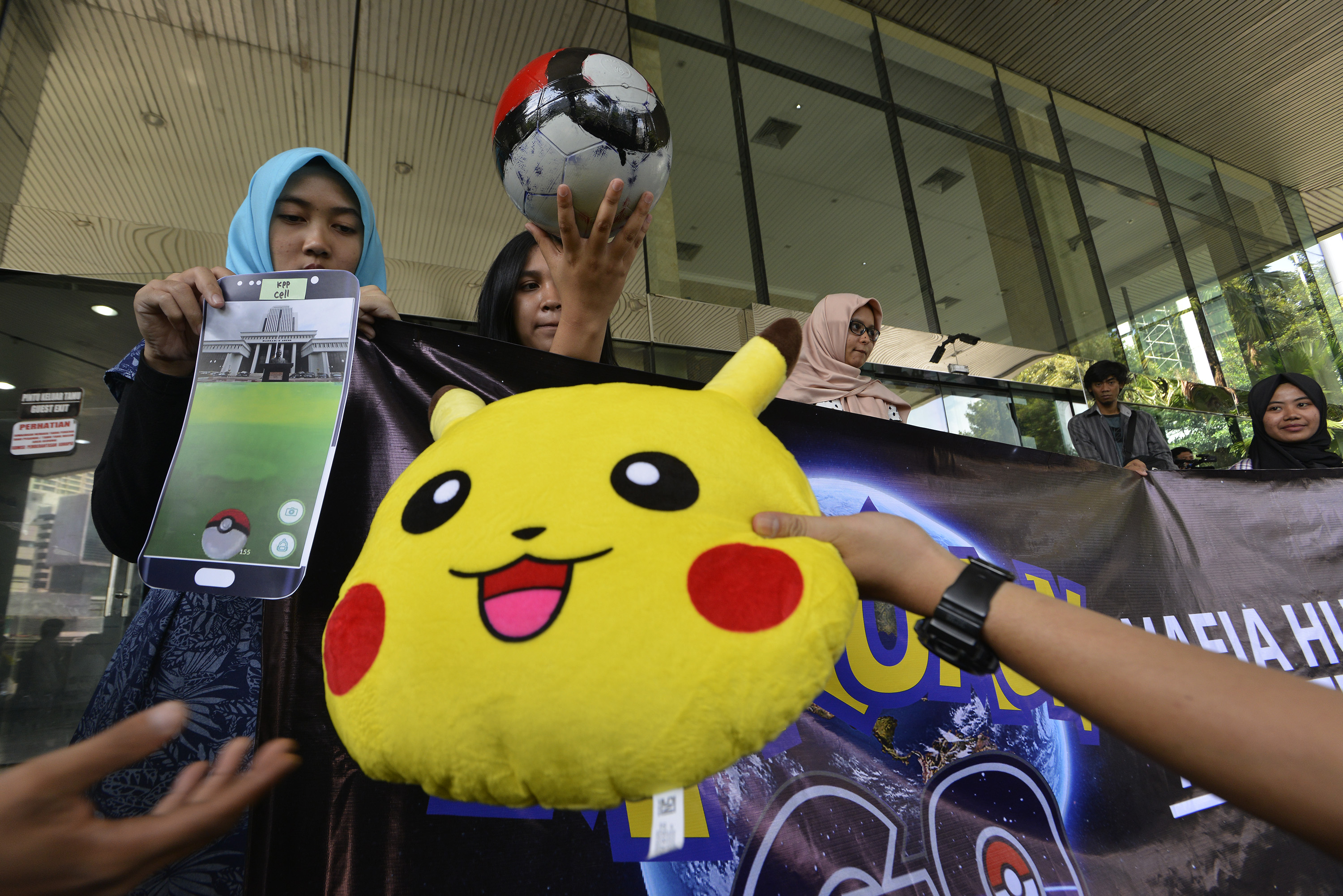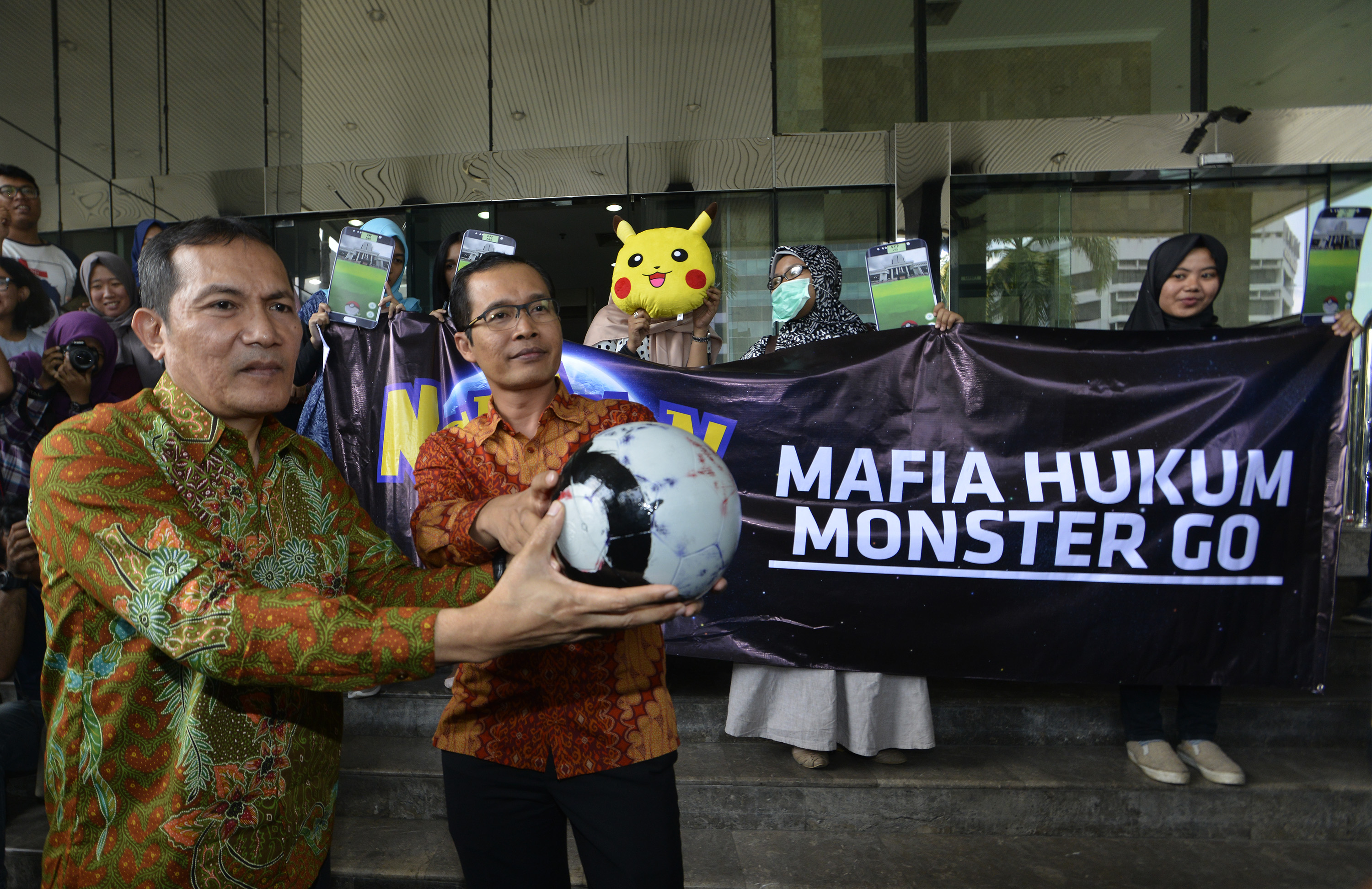 Koalisi Pemantau Peradilan melakukan aksi damai Tangkap Makumon dengan memparodikan permainan Pokemon di Gedung KPK, Jakarta, Selasa (26/7). Aksi tersebut guna mendorong pemberantasan mafia hukum di pengadilan atau yang mereka simbolkan sebagai Mafia Hukum Kelas Monster (Makumon) serta mendesak dan membantu Mahkamah Agung (MA) melakukan perbaikan sistemik untuk mencegah menguatnya kembali jaringan mafia hukum di pengadilan. ANTARA FOTO/Rosa Panggabean/kye/16.
