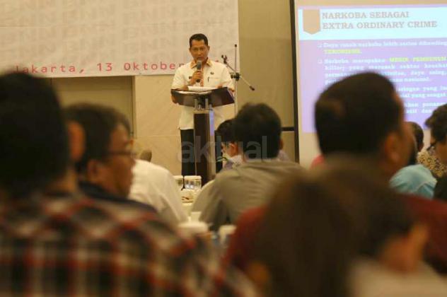 Kepala Badan Narkotika Nasional (BNN), Komjen Pol Budi Waseso, saat membuka acara sarasehan advokasi P4GN (Pencegahan dan Pemberantasan Penyalahgunaan dan Peredaran Gelap Narkotika) bagi kalangan media di Jakarta, Selasa (13/10). Dalam acara tersebut, Budi mempersiapkan pasukan khusus (Passus) BNN untuk melakukan pemberantasan narkoba di Indonesia. Pasukan ini mempunyai tujuan pasti yakni melakukan pemberantasan narkoba. Sebab, untuk melakukan pemberantasan narkoba dibutuhkan manusia yang berkemauan kuat dan keras. AKTUAL/TINO OKTAVIANO