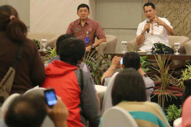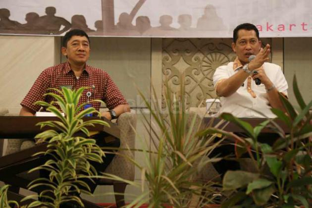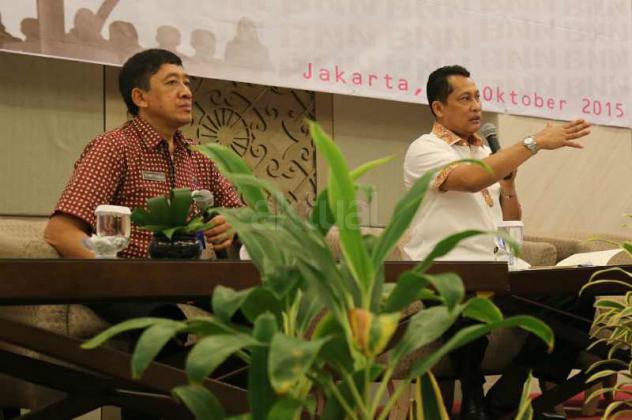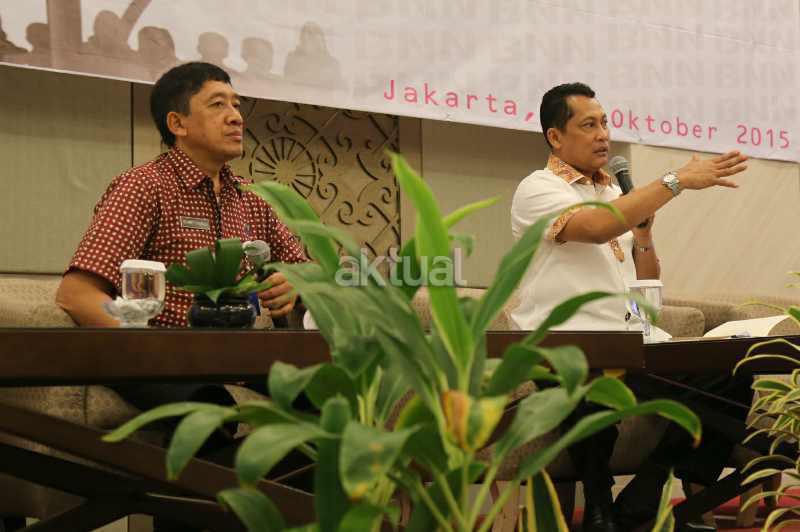 Kepala Badan Narkotika Nasional (BNN), Komjen Pol Budi Waseso (kanan) dampingi Kepala Bagian Humas BNN, Kombes Pol Slamet Pribadi (kiri), menjawab pertanyaan wartawan saat acara sarasehan advokasi P4GN (Pencegahan dan Pemberantasan Penyalahgunaan dan Peredaran Gelap Narkotika) bagi kalangan media di Jakarta, Selasa (13/10). Dalam acara tersebut, Budi mempersiapkan pasukan khusus (Passus) BNN untuk melakukan pemberantasan narkoba di Indonesia. Pasukan ini mempunyai tujuan pasti yakni melakukan pemberantasan narkoba. Sebab, untuk melakukan pemberantasan narkoba dibutuhkan manusia yang berkemauan kuat dan keras. AKTUAL/TINO OKTAVIANO