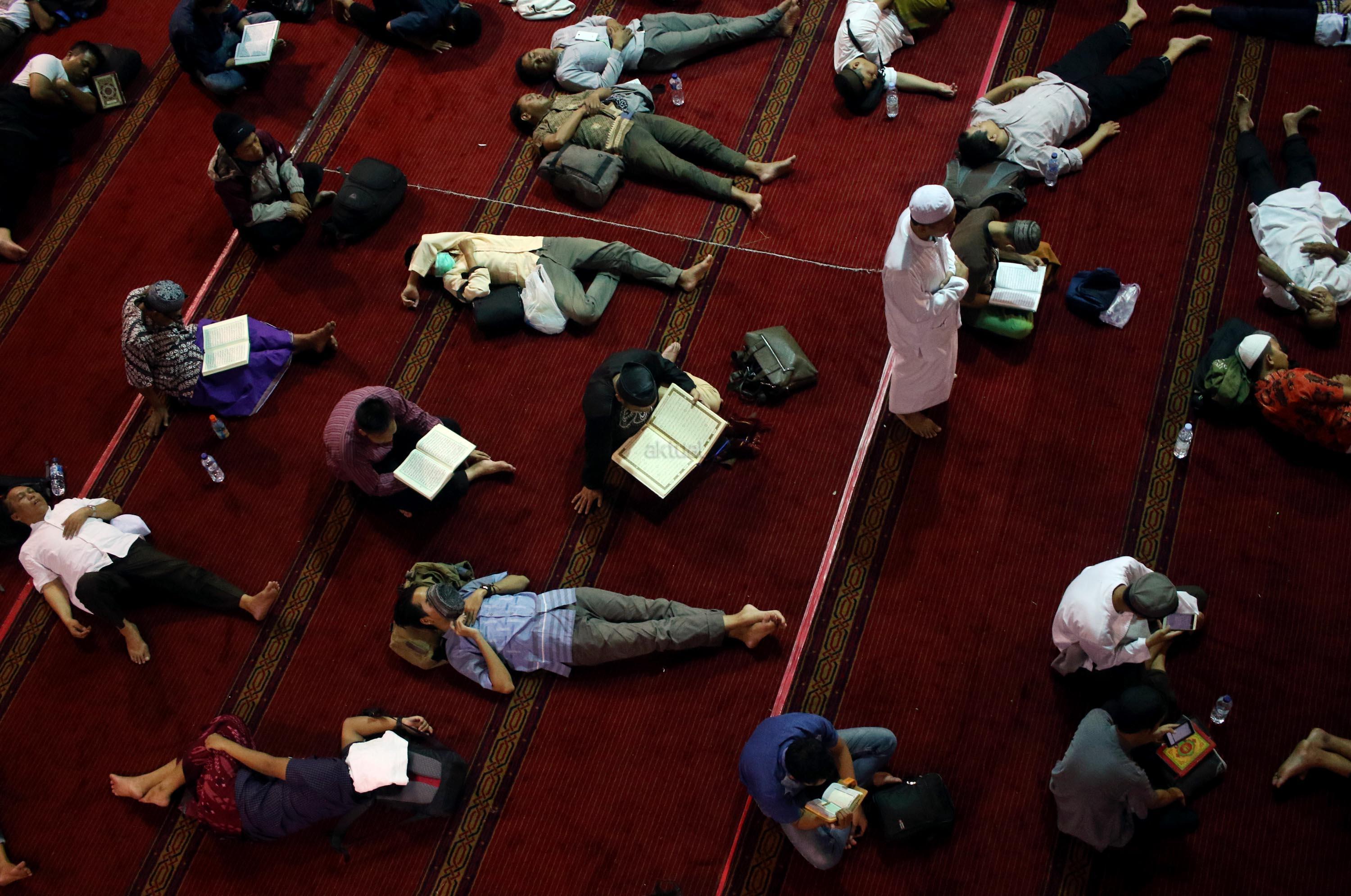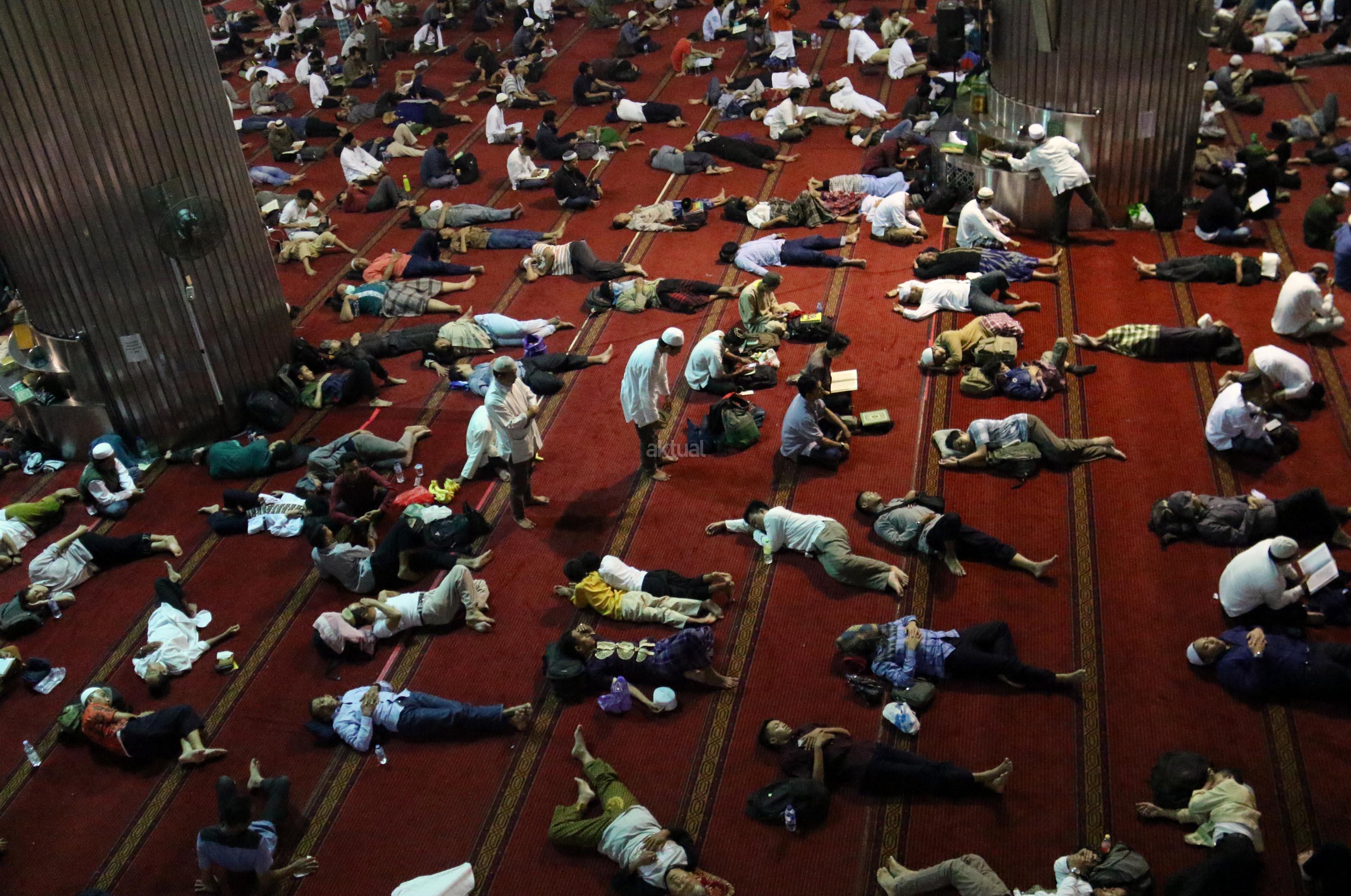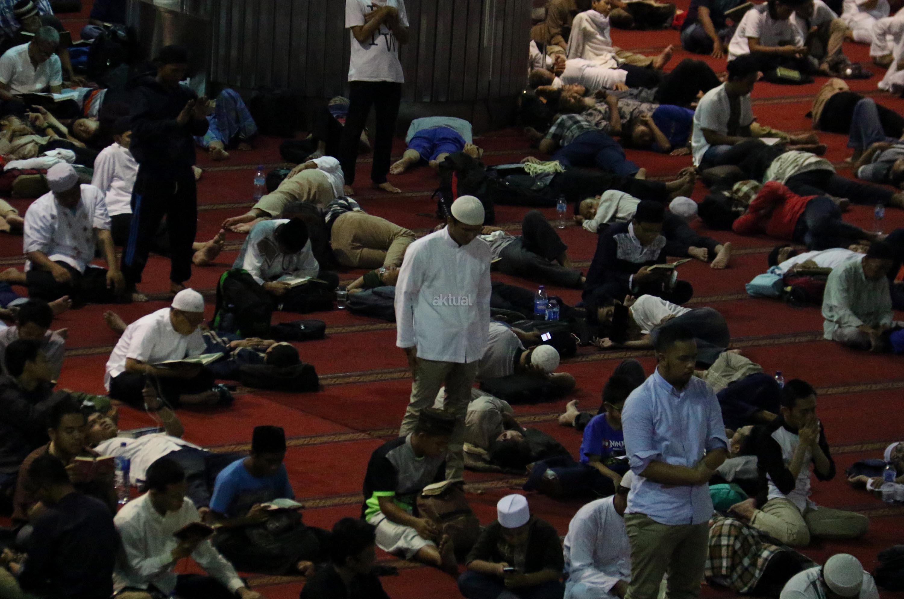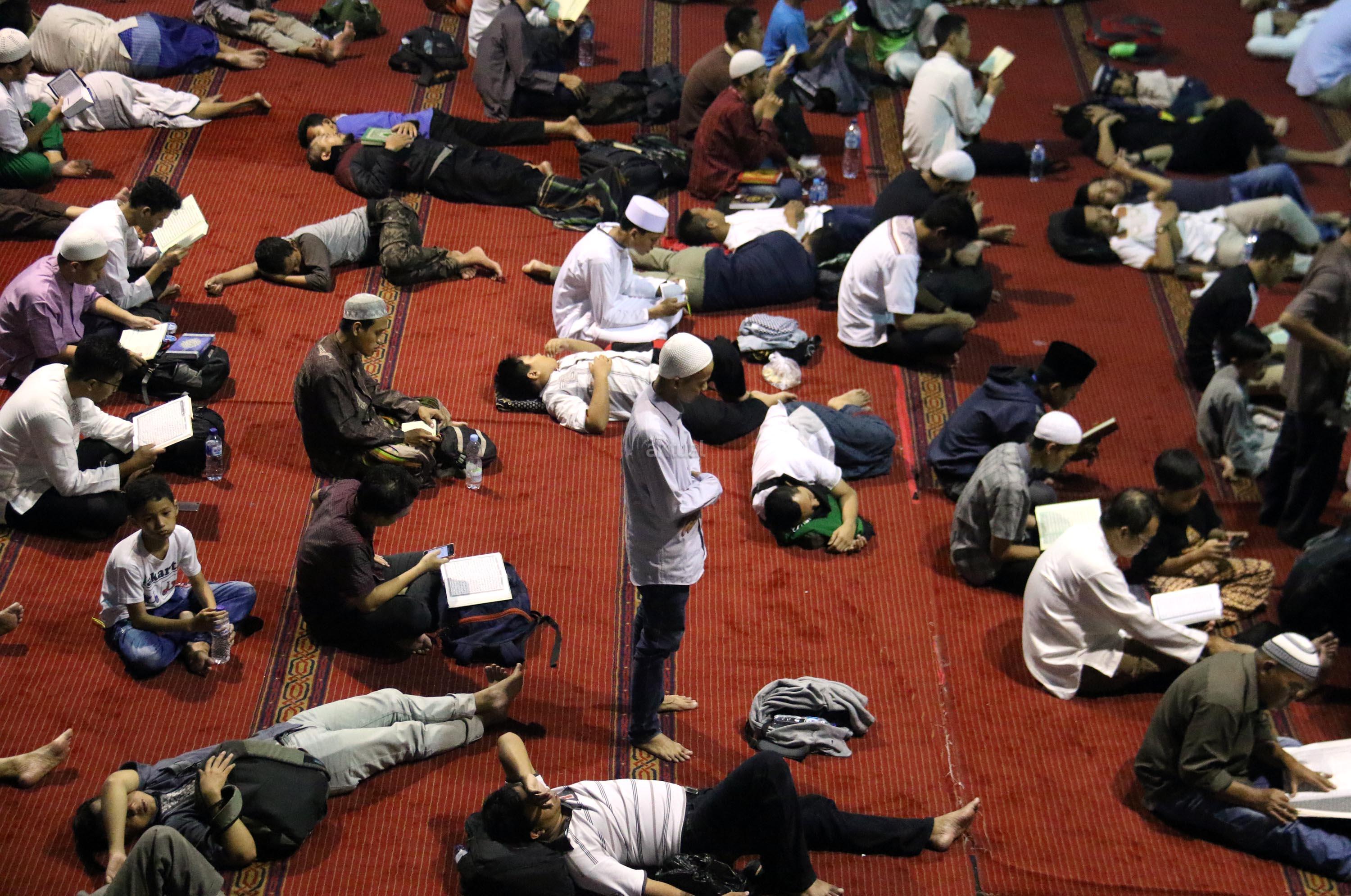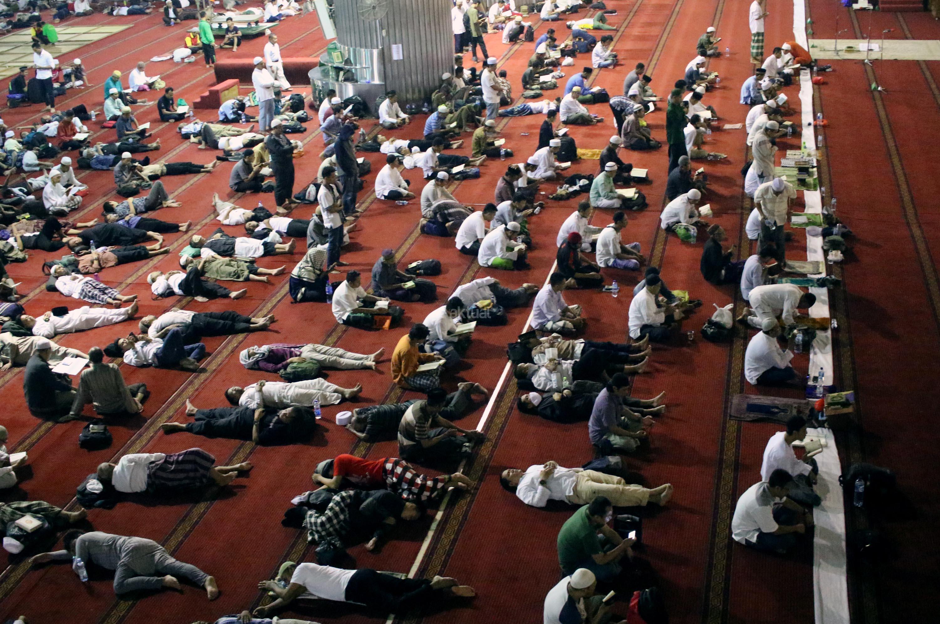 Sejumlah jamaah tengah beritikaf dengan membaca Quran dan sholat di antara jamaah yang terlelap di Masjid Istiqalal, Minggu (18/6/2017) dini hari. Ribuan warga meramaikan masjid untuk beritikaf atau berdiam diri di masjid dengan memperbanyak aktivitas ibadah di sisa malam terakhir Ramadhan untuk mengharap Lailatul Qadar. AKTUAL/Munzir