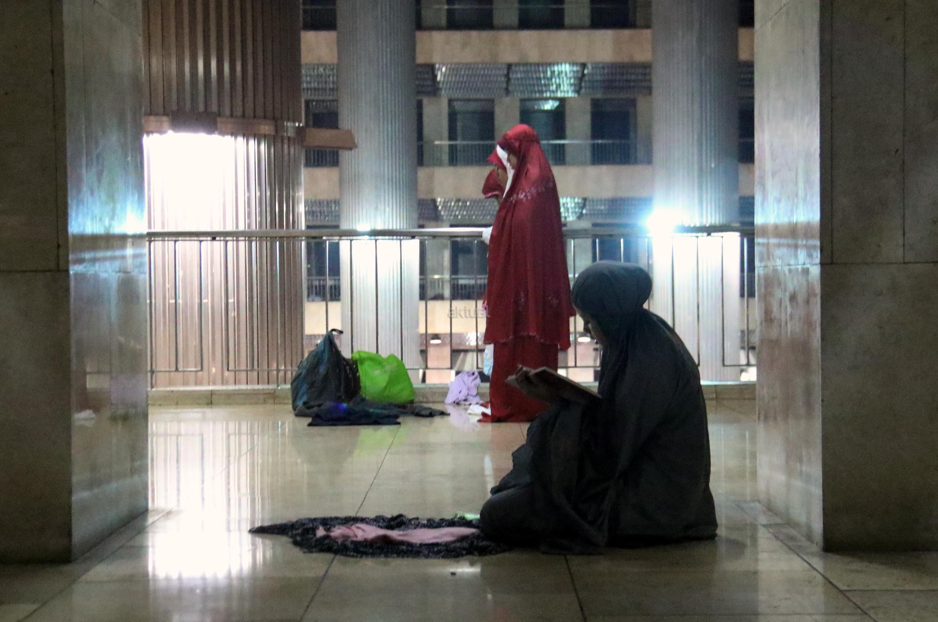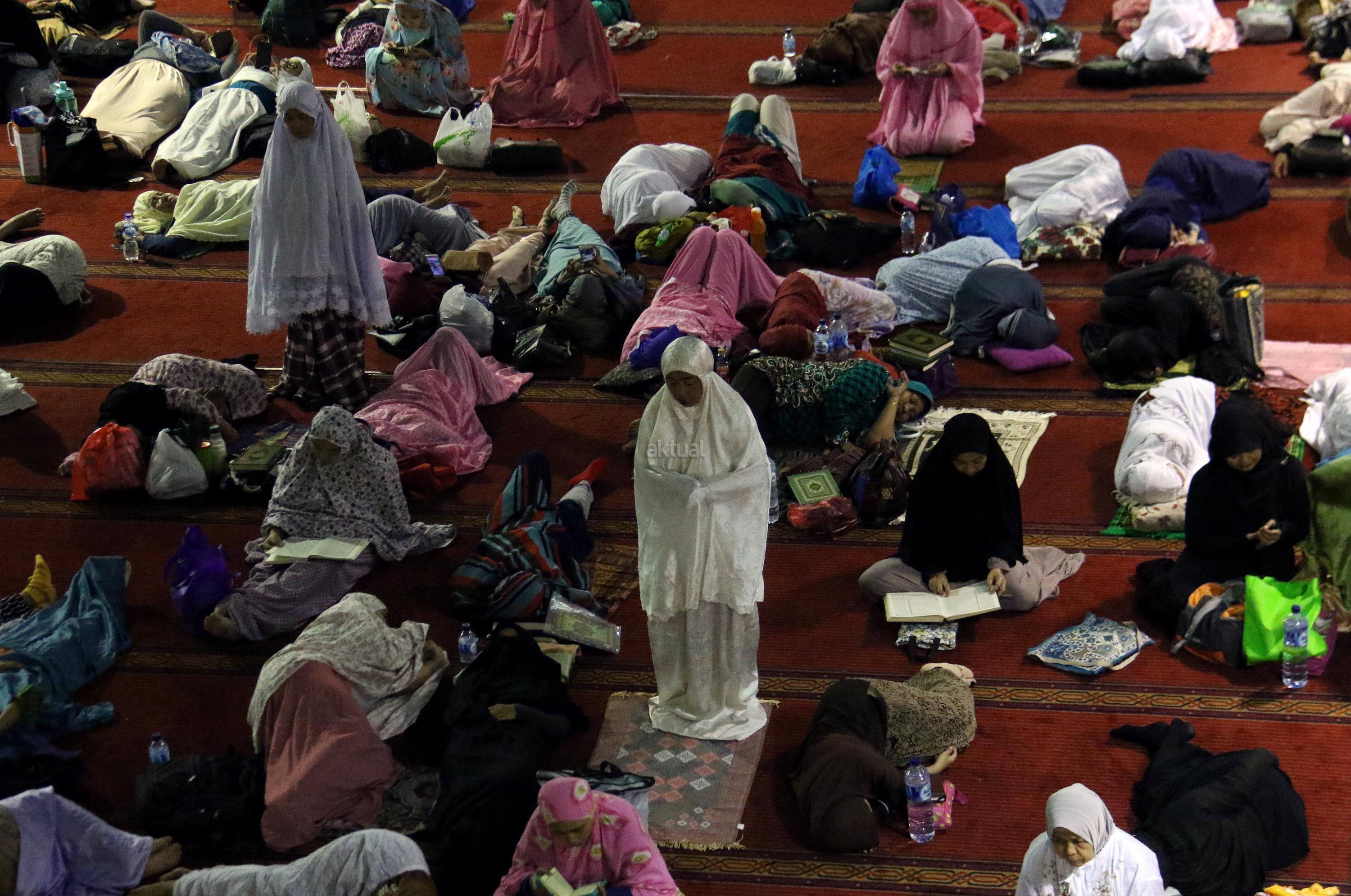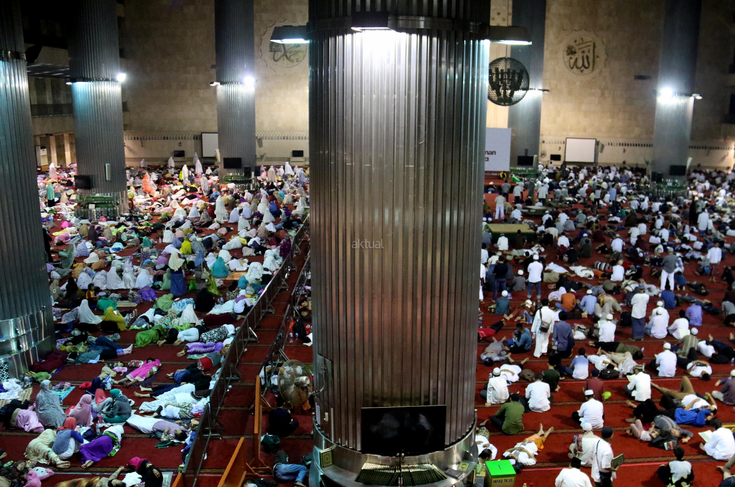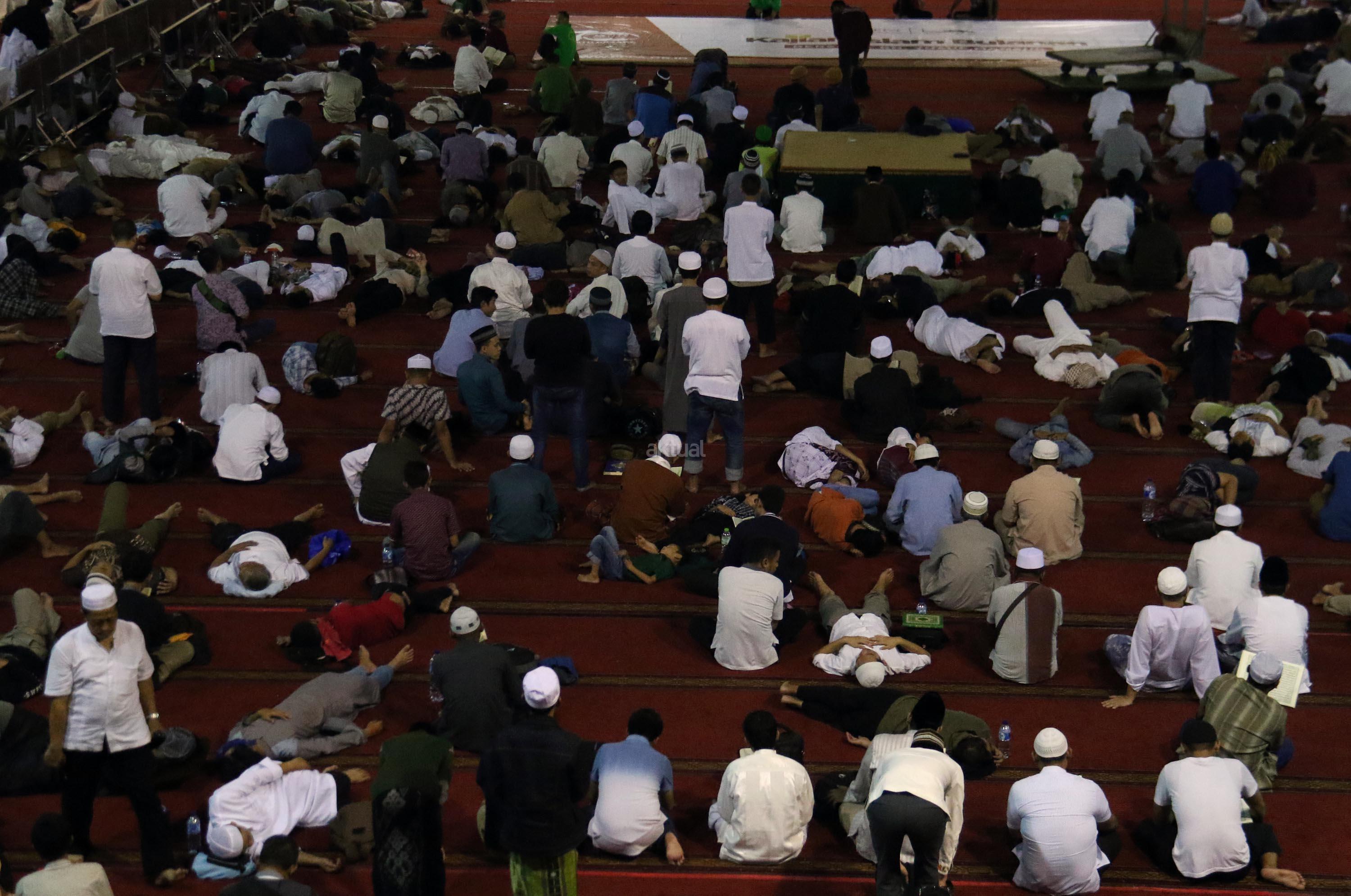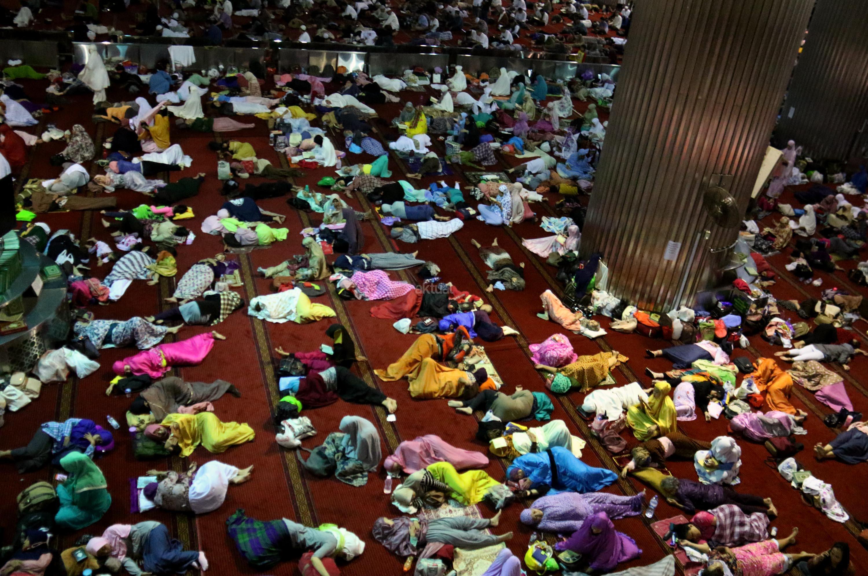 Sejumlah jamaah tengah beritikaf dengan membaca Quran dan sholat di antara jamaah yang terlelap di Masjid Istiqalal, Minggu (18/6/2017) dini hari. Ribuan warga meramaikan masjid untuk beritikaf atau berdiam diri di masjid dengan memperbanyak aktivitas ibadah di sisa malam terakhir Ramadhan untuk mengharap Lailatul Qadar. AKTUAL/Munzir