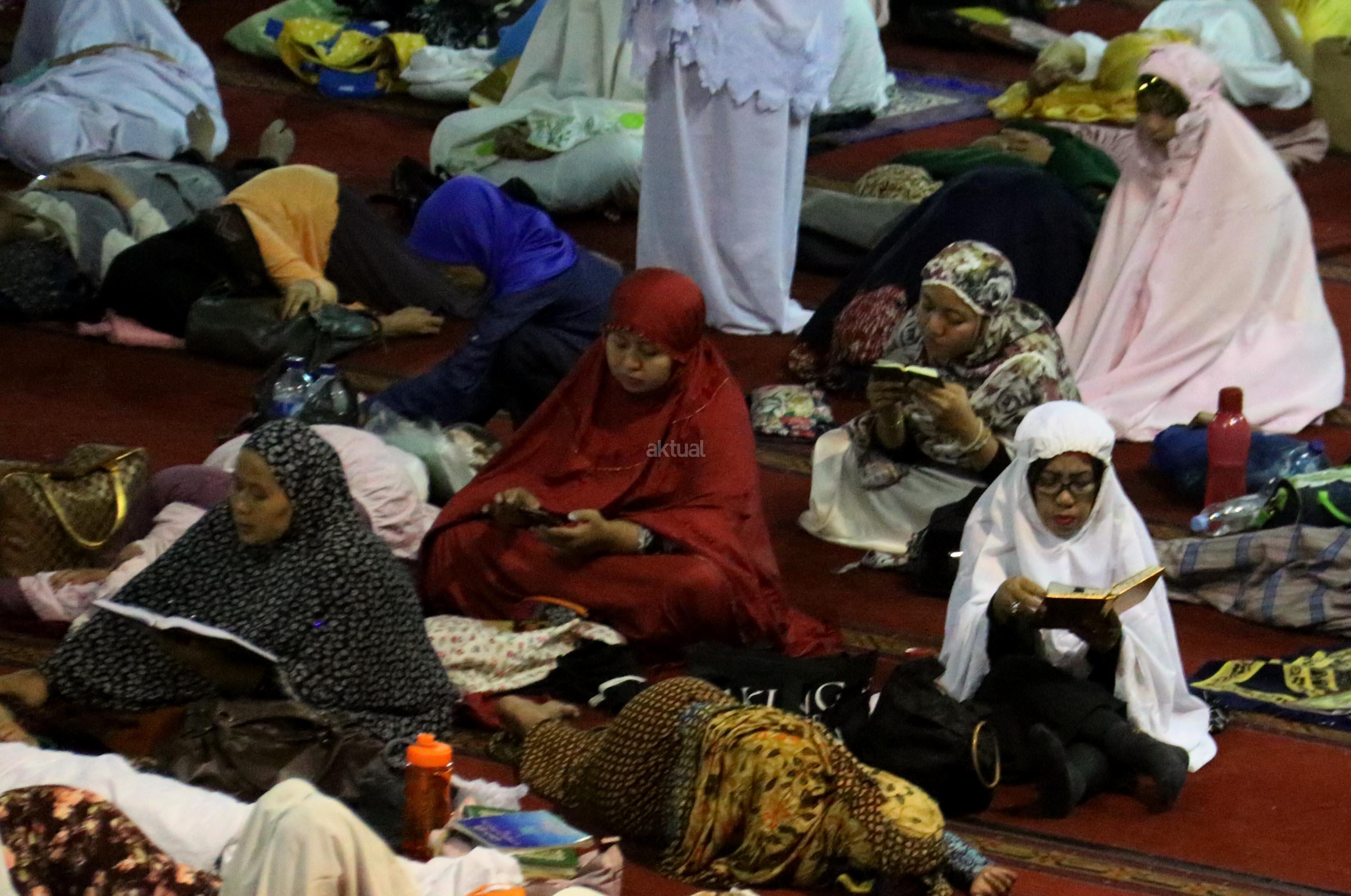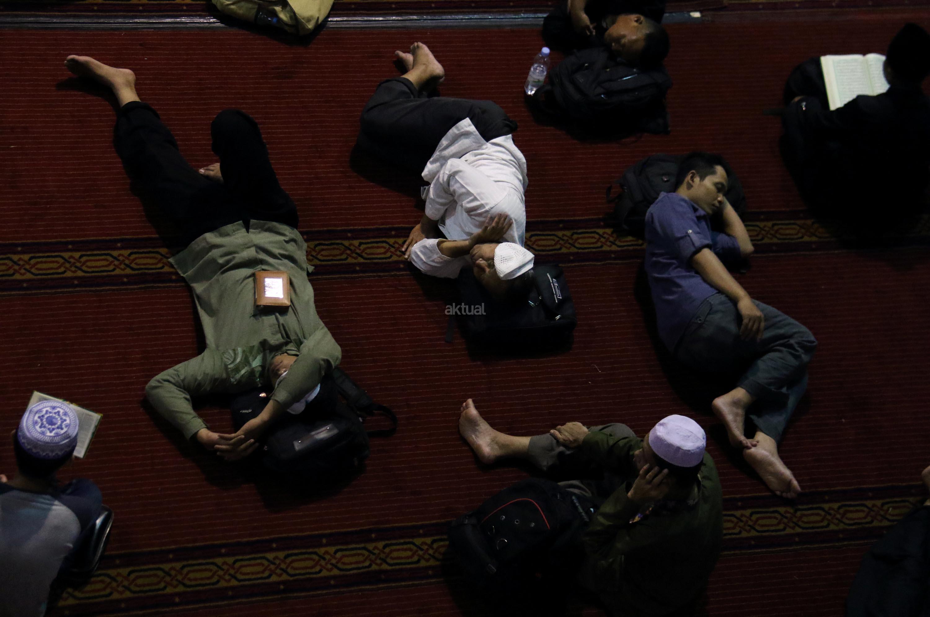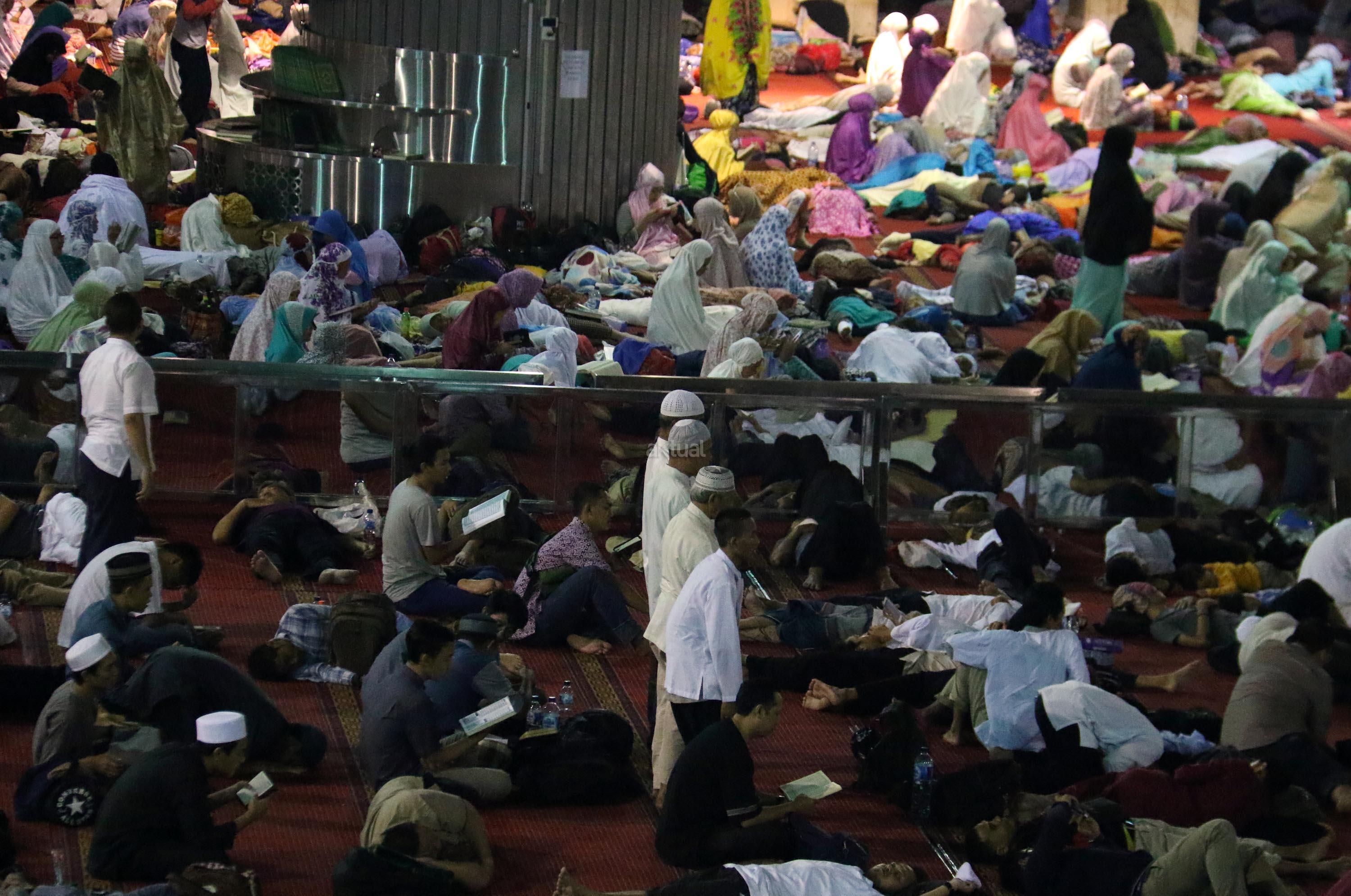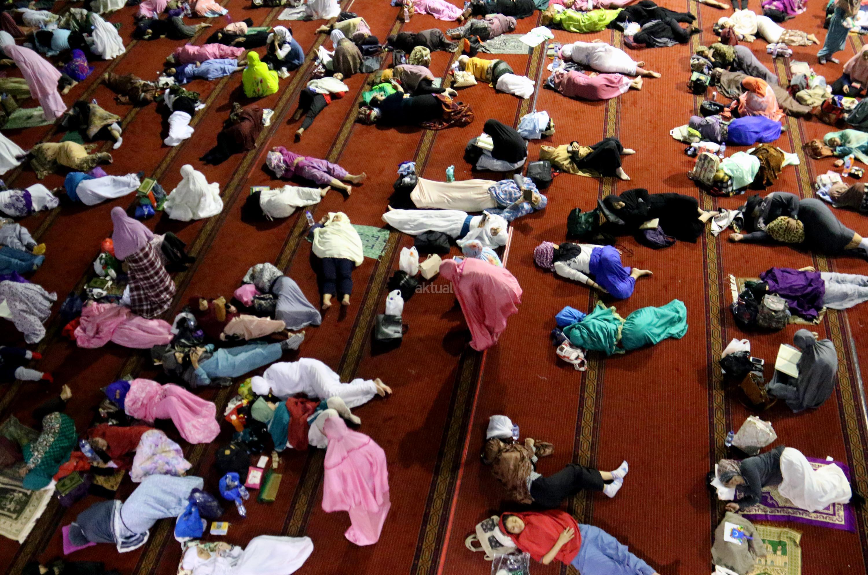 Sejumlah jamaah tengah beritikaf dengan membaca Quran dan sholat di antara jamaah yang terlelap di Masjid Istiqalal, Minggu (18/6/2017) dini hari. Ribuan warga meramaikan masjid untuk beritikaf atau berdiam diri di masjid dengan memperbanyak aktivitas ibadah di sisa malam terakhir Ramadhan untuk mengharap Lailatul Qadar. AKTUAL/Munzir