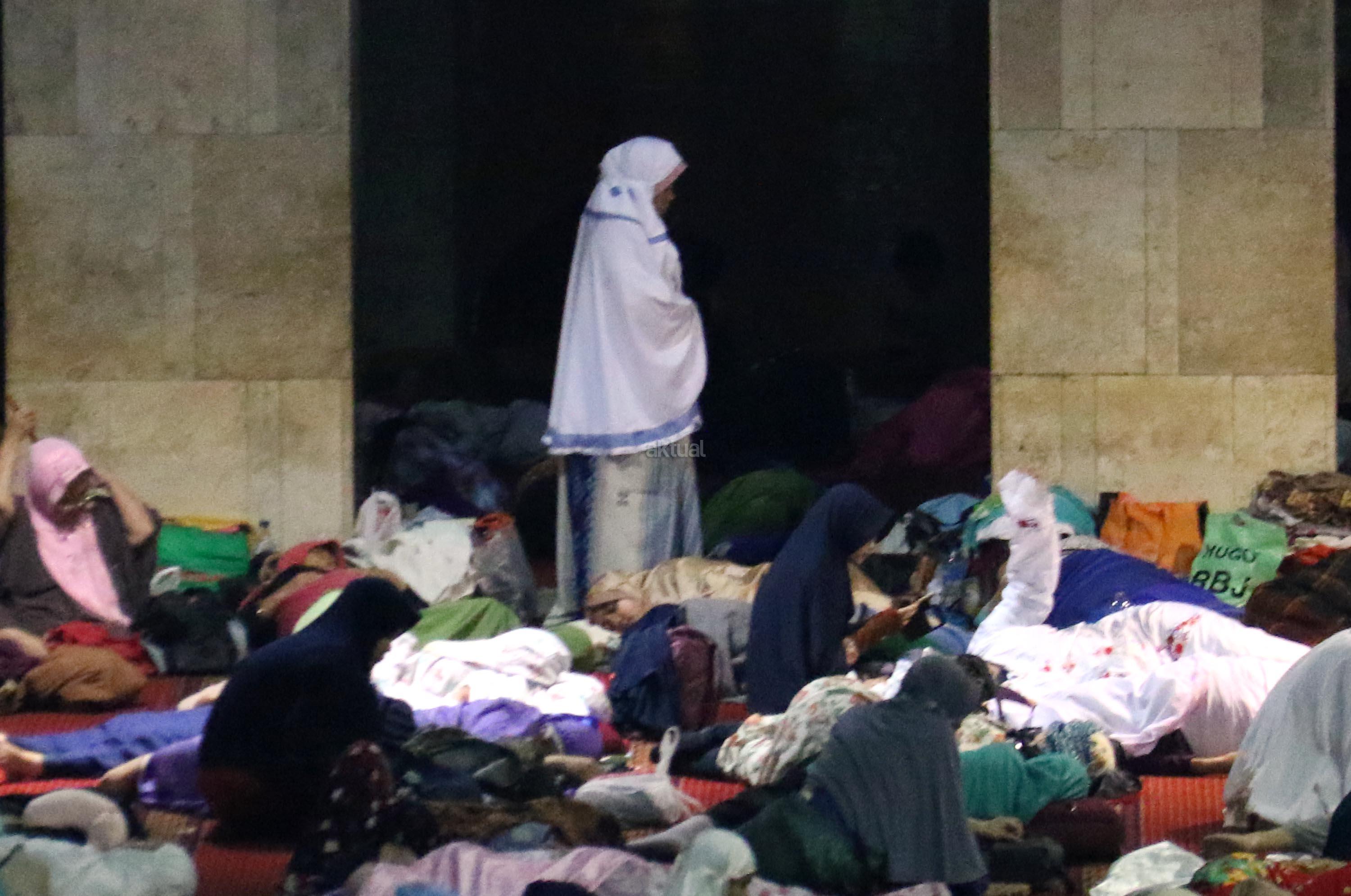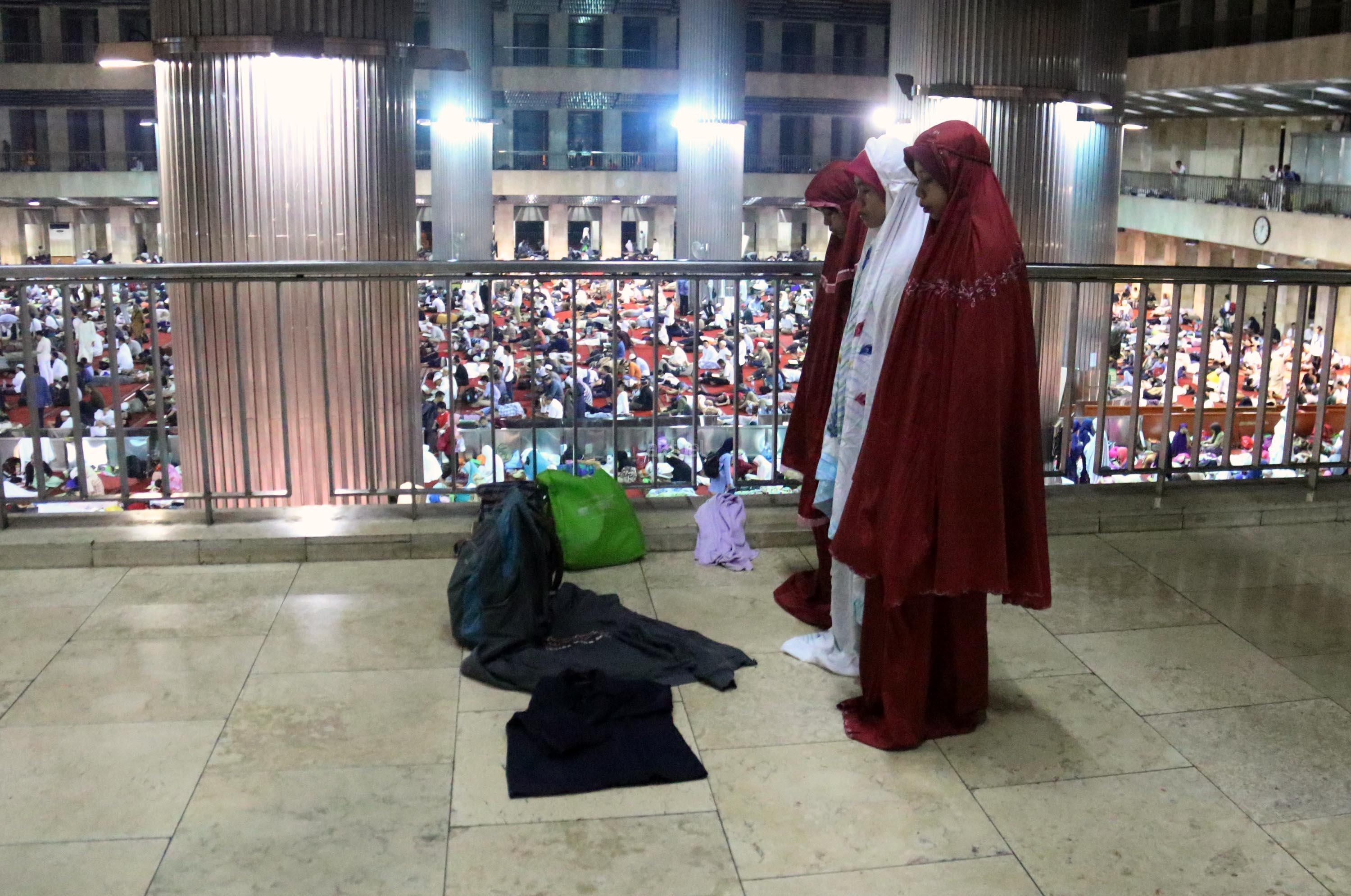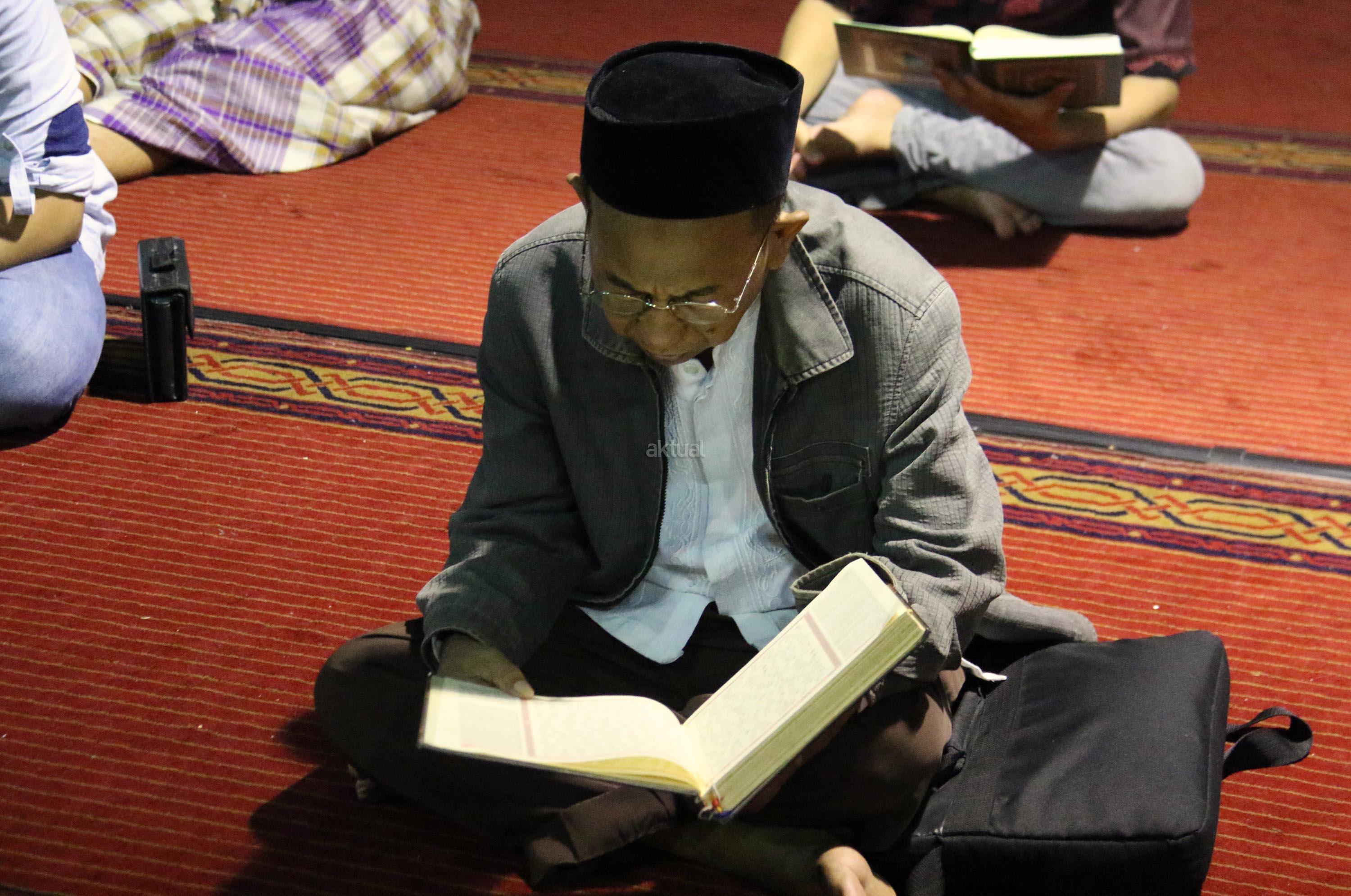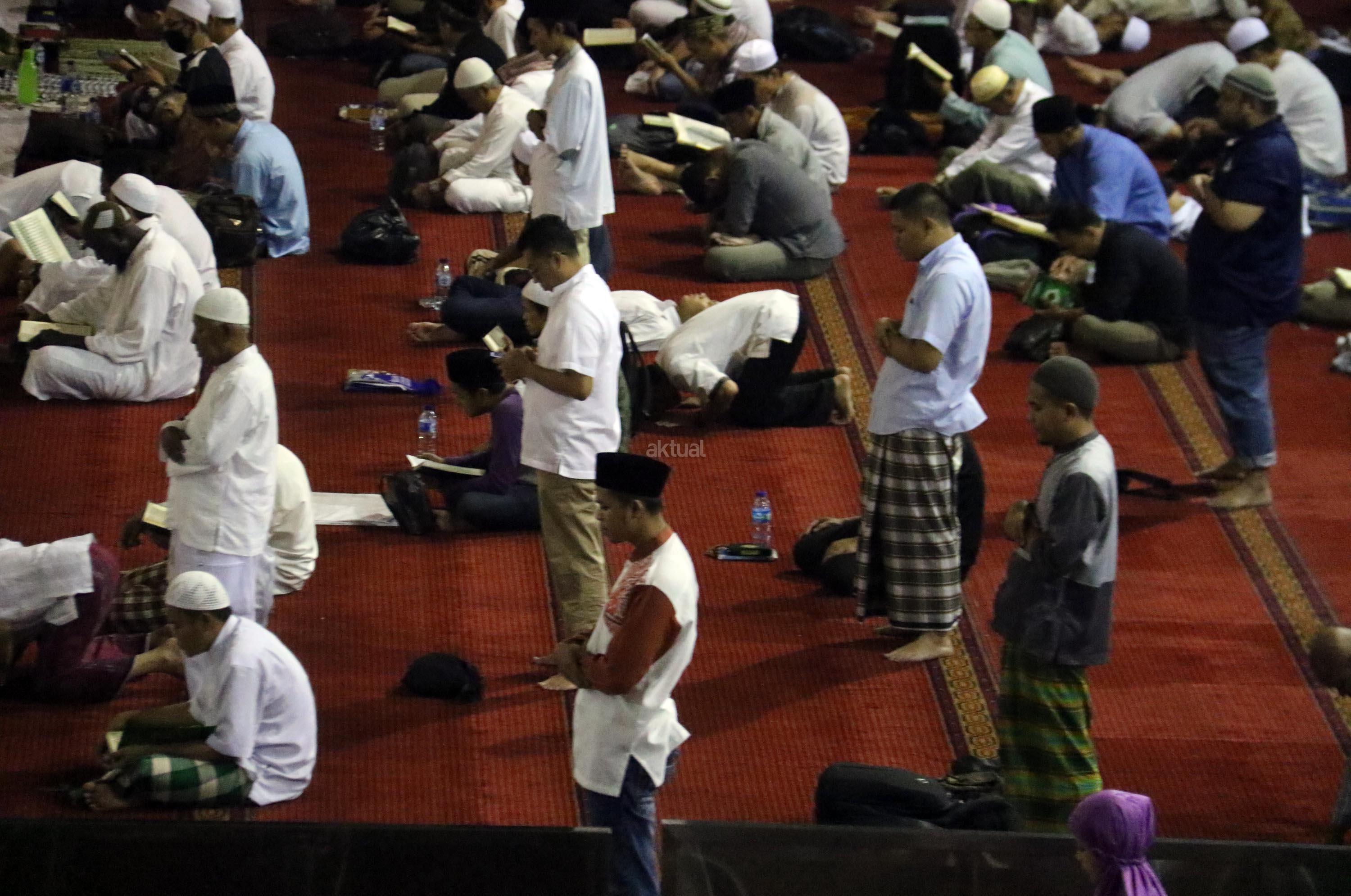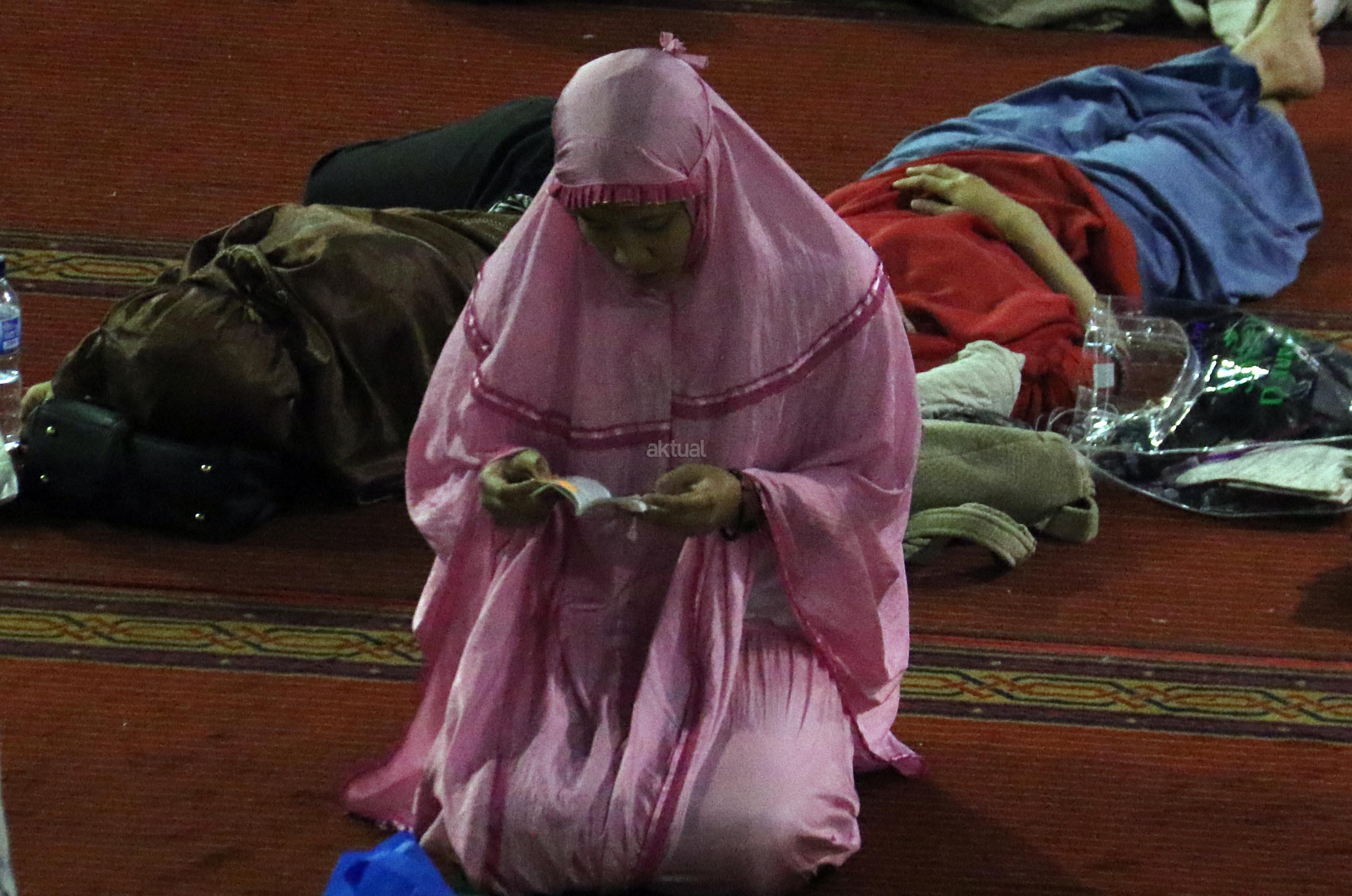 Sejumlah jamaah tengah beritikaf dengan membaca Quran dan sholat di antara jamaah yang terlelap di Masjid Istiqalal, Minggu (18/6/2017) dini hari. Ribuan warga meramaikan masjid untuk beritikaf atau berdiam diri di masjid dengan memperbanyak aktivitas ibadah di sisa malam terakhir Ramadhan untuk mengharap Lailatul Qadar. AKTUAL/Munzir