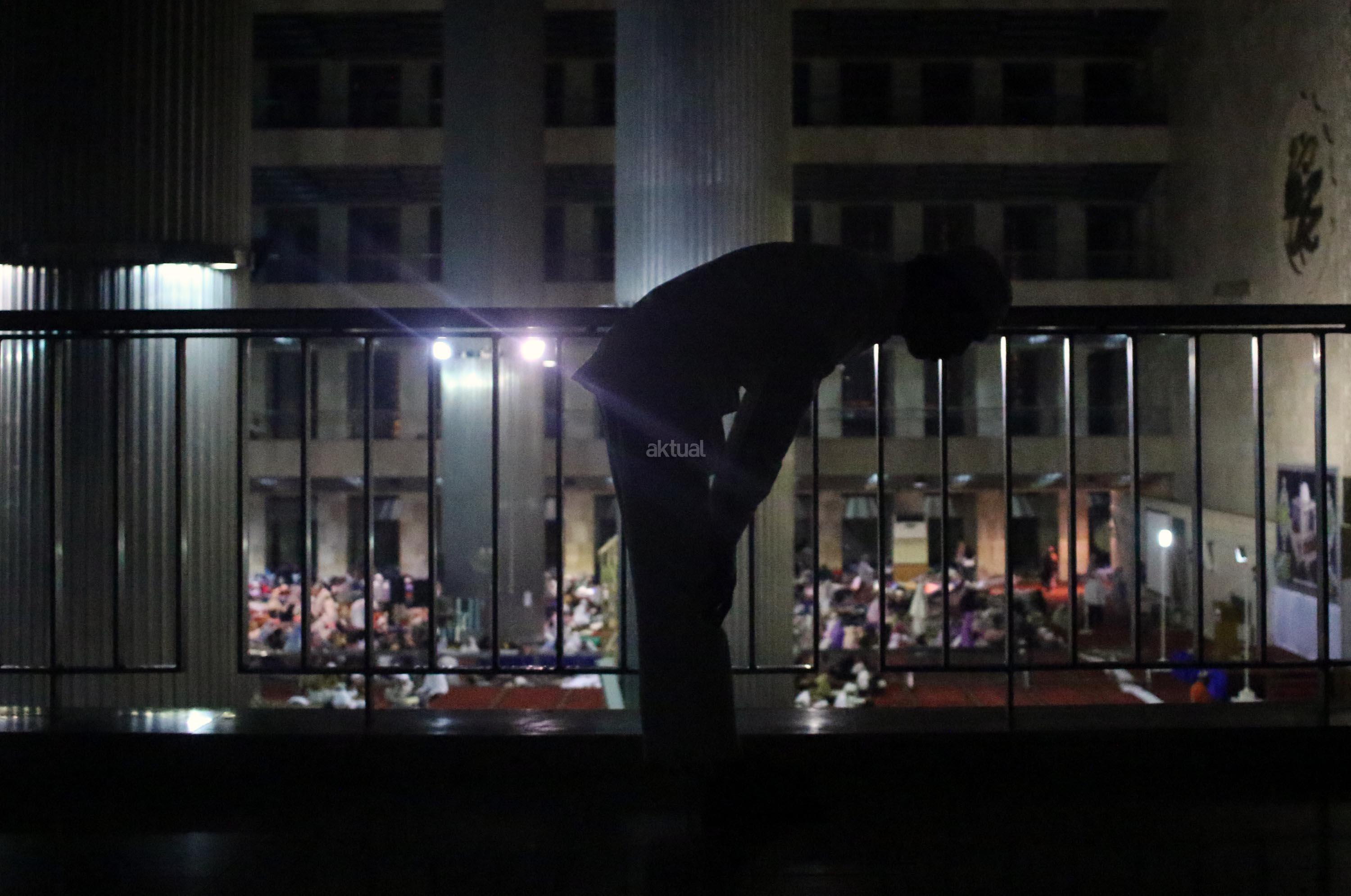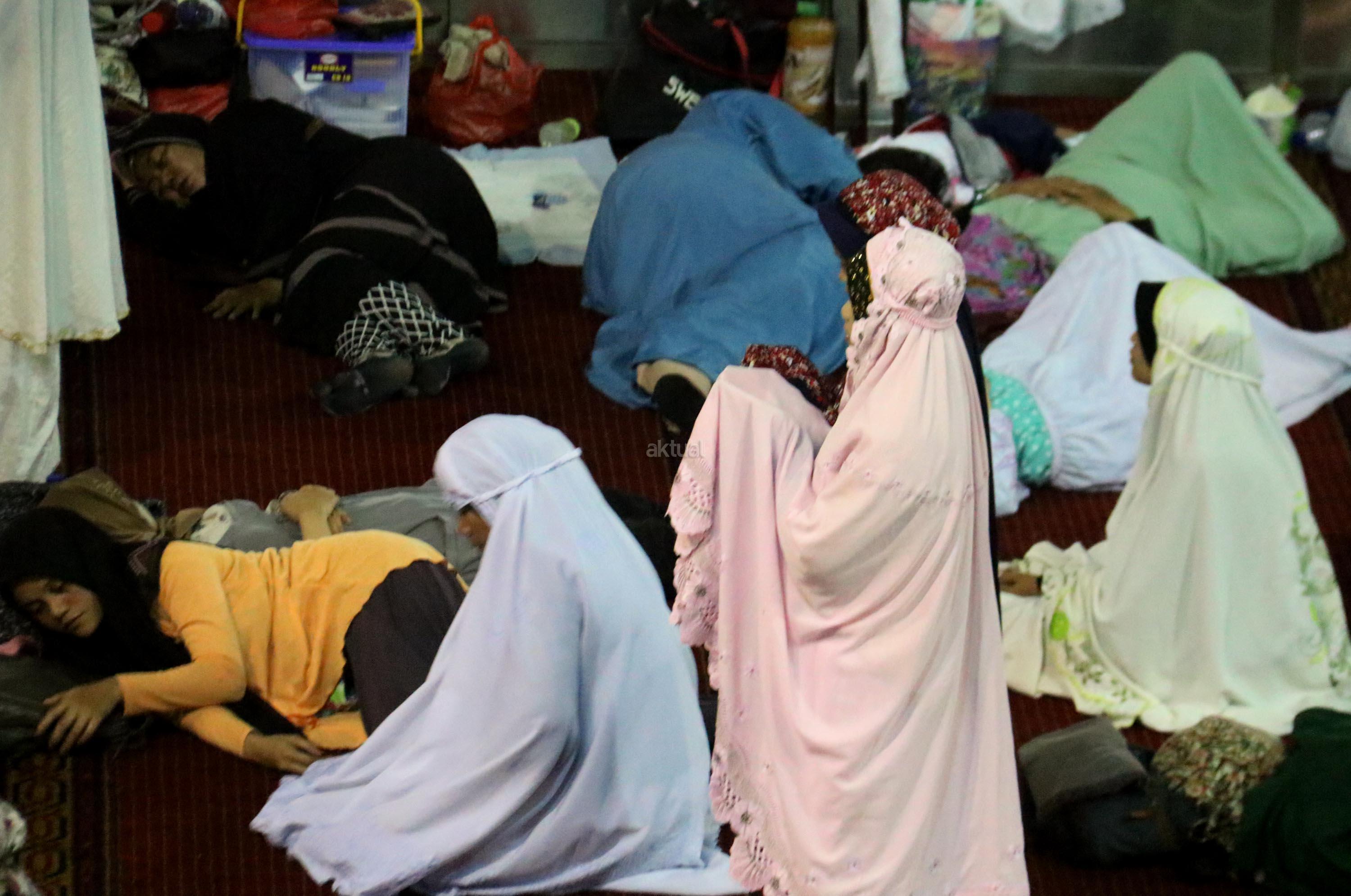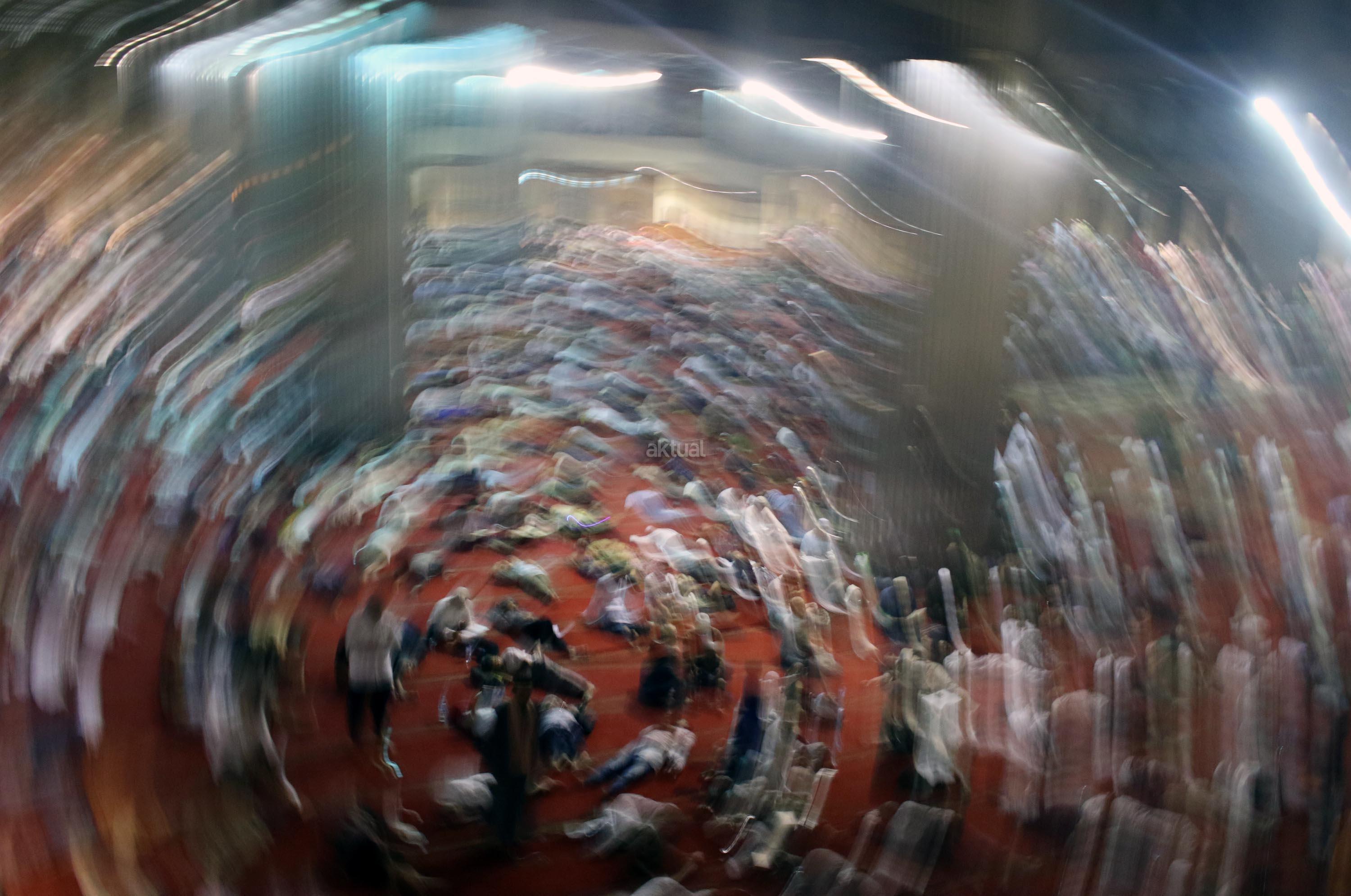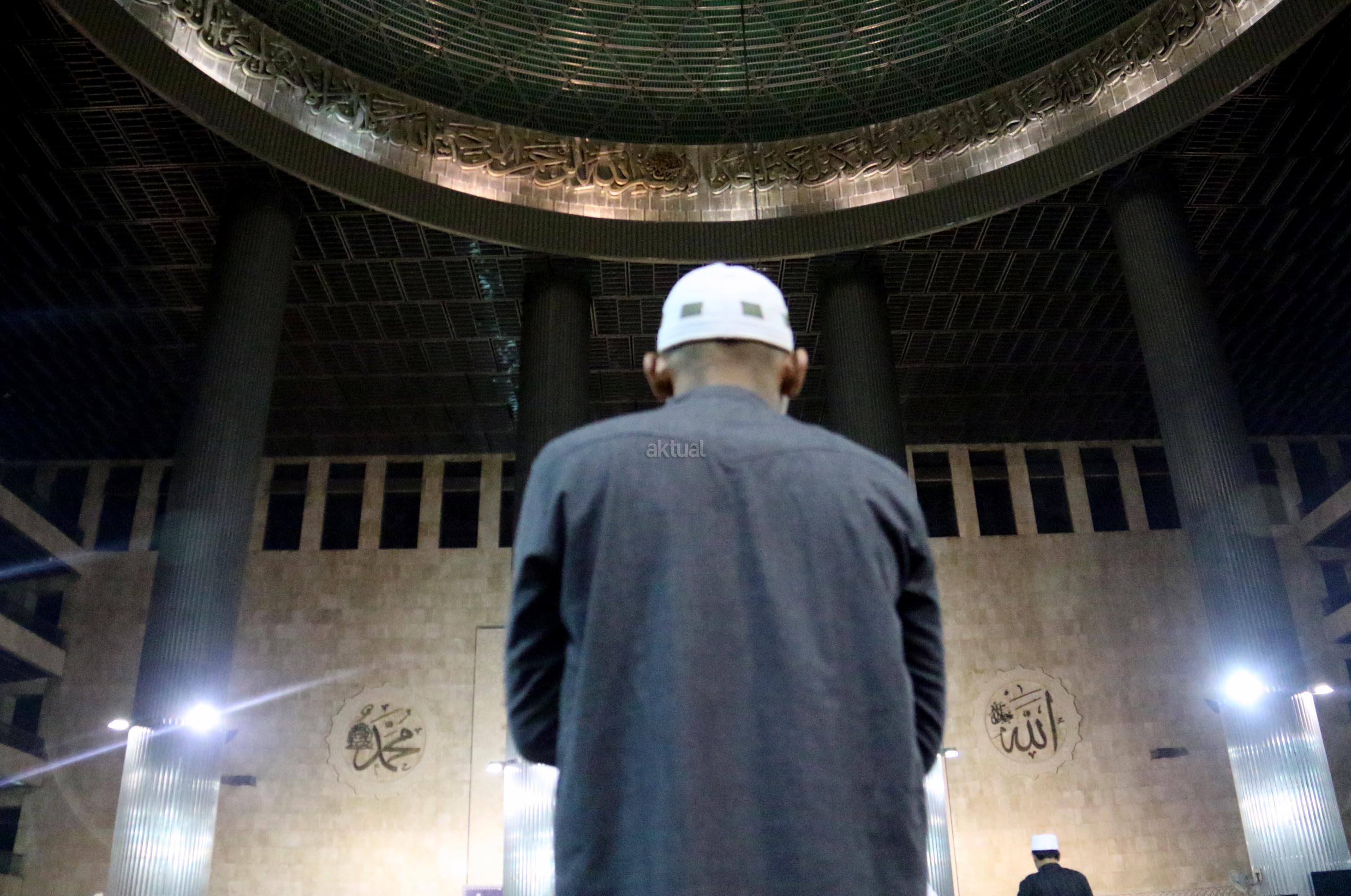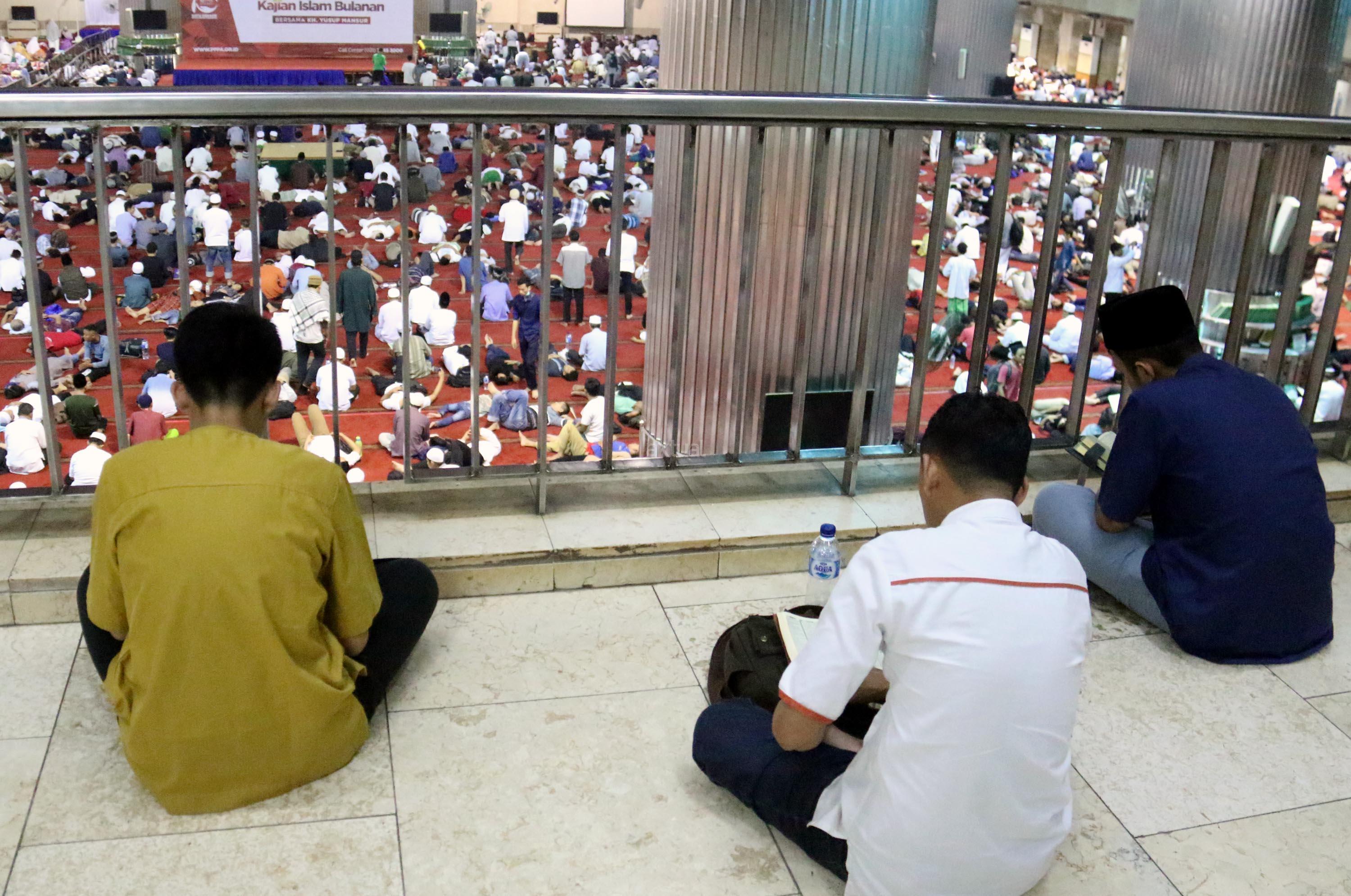 Sejumlah jamaah tengah beritikaf dengan membaca Quran dan sholat di antara jamaah yang terlelap di Masjid Istiqalal, Minggu (18/6/2017) dini hari. Ribuan warga meramaikan masjid untuk beritikaf atau berdiam diri di masjid dengan memperbanyak aktivitas ibadah di sisa malam terakhir Ramadhan untuk mengharap Lailatul Qadar. AKTUAL/Munzir