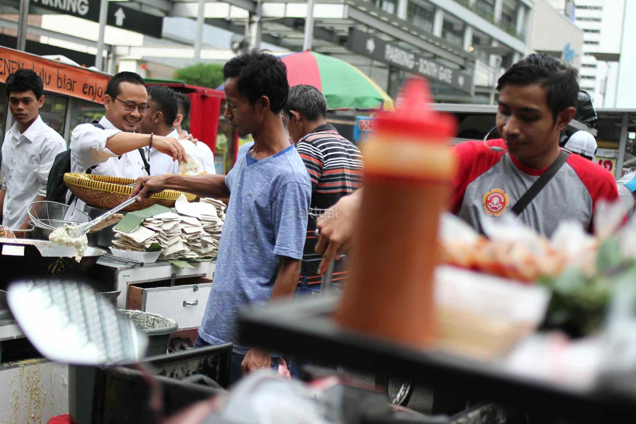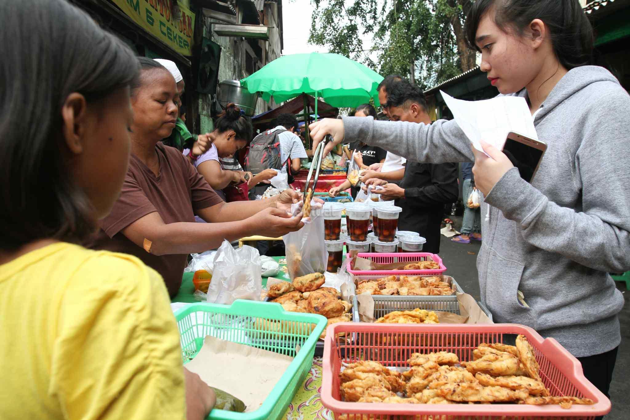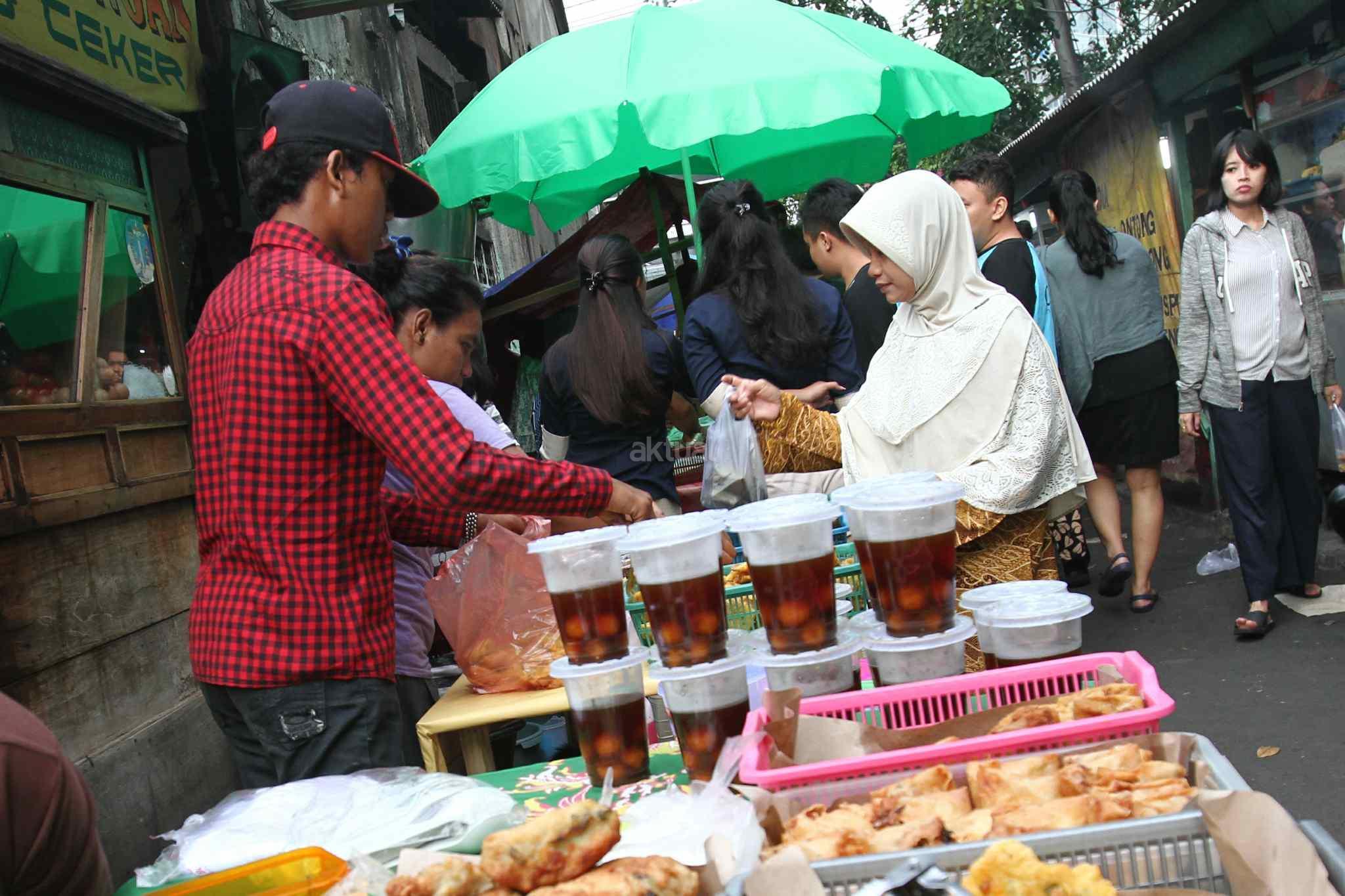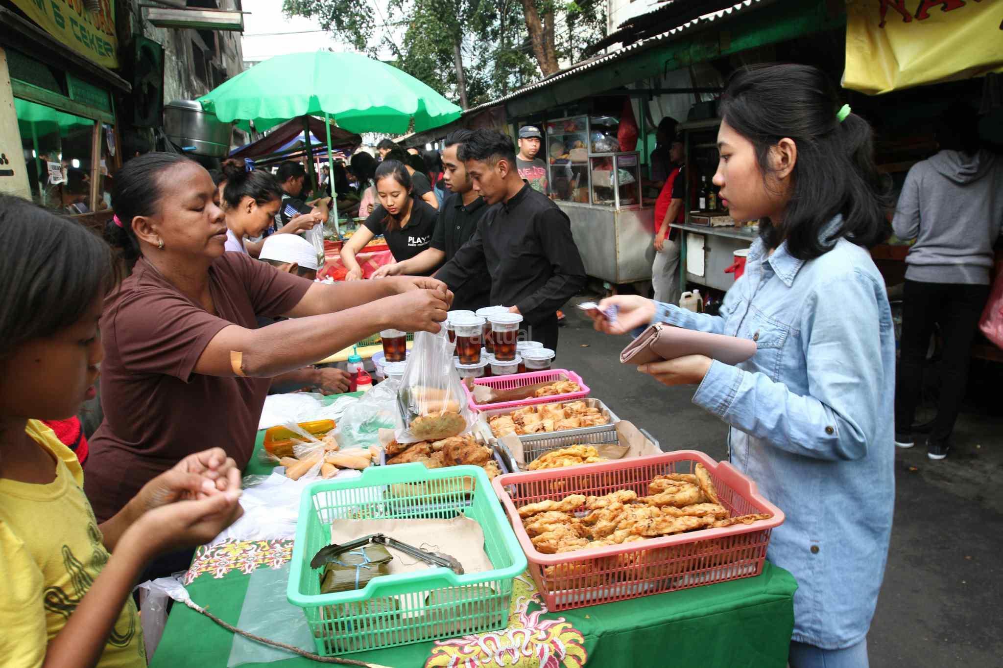 Warga dan pekerja memburu menu berbuka puasa di kawasan Tanah Abang, Jakarta Pusat, Senin (29/5). Menjadi cerita tersendiri di bulan Ramadan menjelang berbuka umat muslim mempersiapkan menu berbuka puasa untuk dirumah maupun di kantor. AKTUAL/Tino Oktaviano