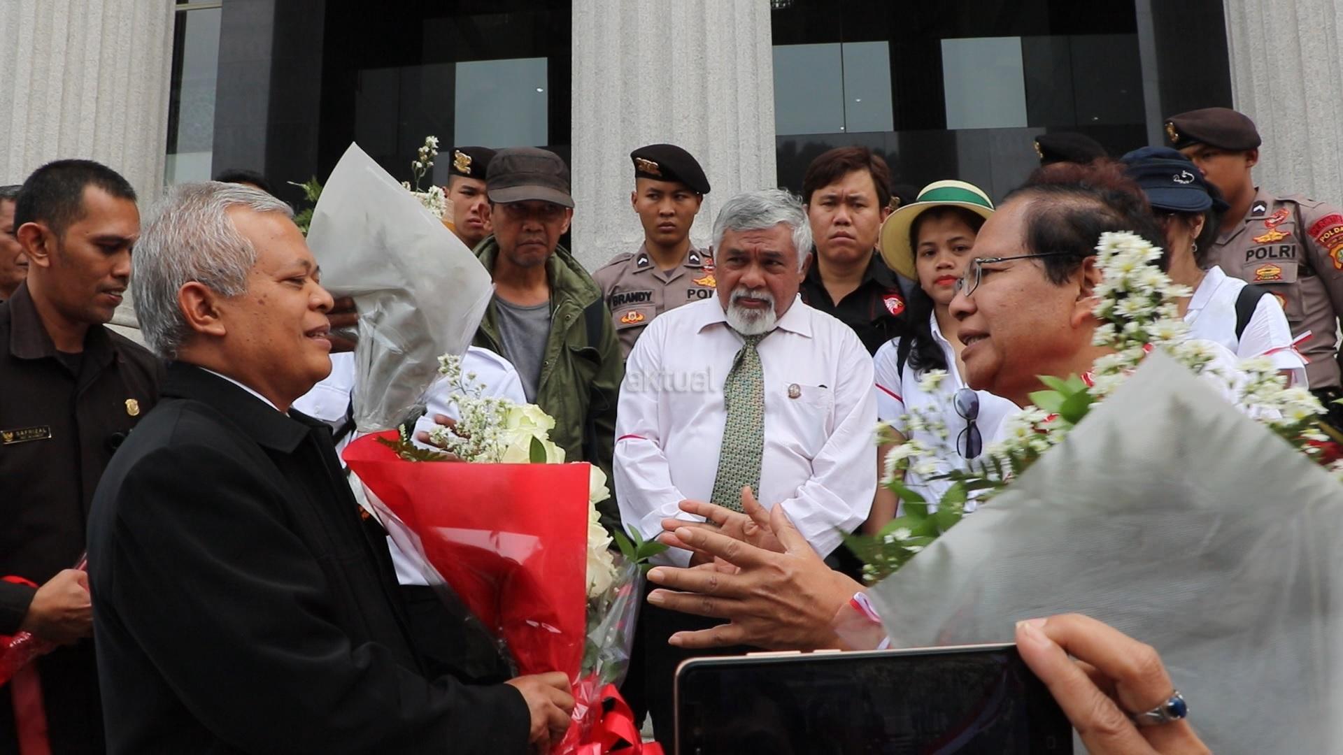Tokoh Nasional Rizal Ramli menyerahkan secara karangan bunga kepada Kepala Biro Humas dan Protokol MK, Rubiyo sebagai bentuk dukungan kepada dua Hakim Konstitusi, Saldi Isra dan Suhartoyo terkait perbedaan pendapat atau dissenting opinion uji materi ambang batas pencalonan presiden atau presidential threshold (PT) di Gedung Mahakamah Konsitusi, Jakarta, Kamis (12/7). Rizal Ramli berpendapat ambang batas pencalonan presiden, bertentangan dengan UUD 1945. Sebab, dalam UUD 45 dijelaskan bahwa, siapapun bisa menjadi presiden selama mendapat usungan partai politik (parpol). AKTUAL/Tino Oktaviano