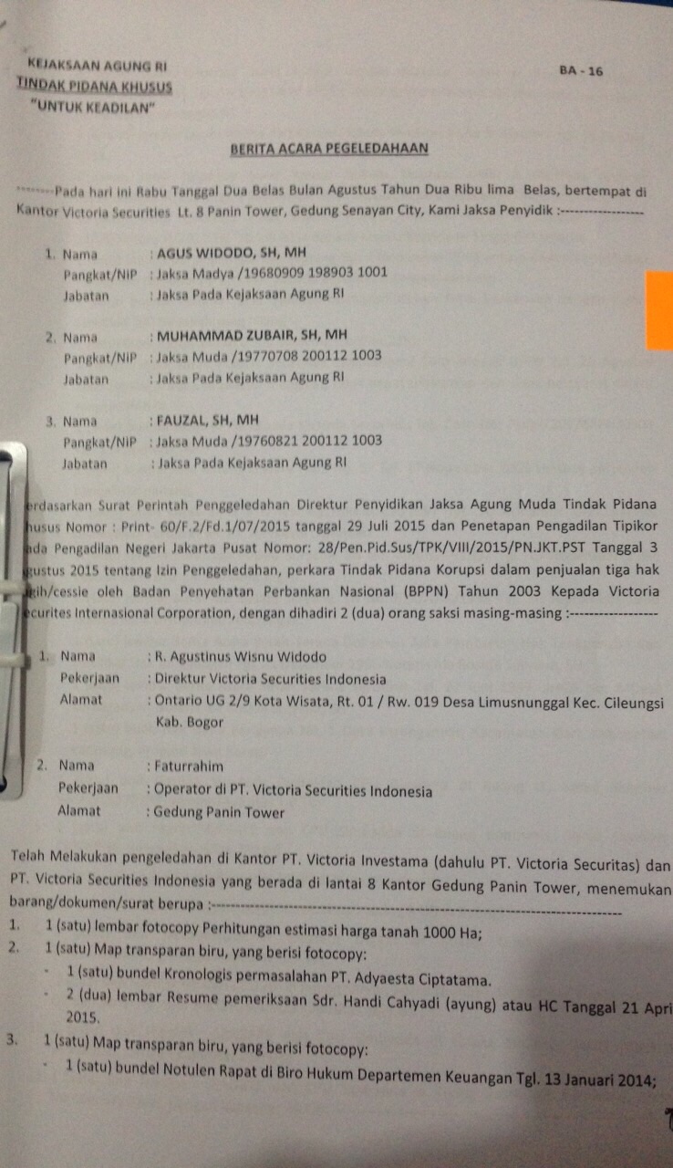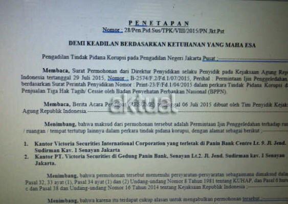 Berdasarkan surat Pengadilan Negeri Jakarta Pusat, tertulis Kejagung melayangkan surat untuk menggeledah kantor Victoria Securities Interntional Corporation yang terletak di Panin Bank Center lantai 9, jalan Jend Sudirman Kav 1 Senayan Jakarta.
