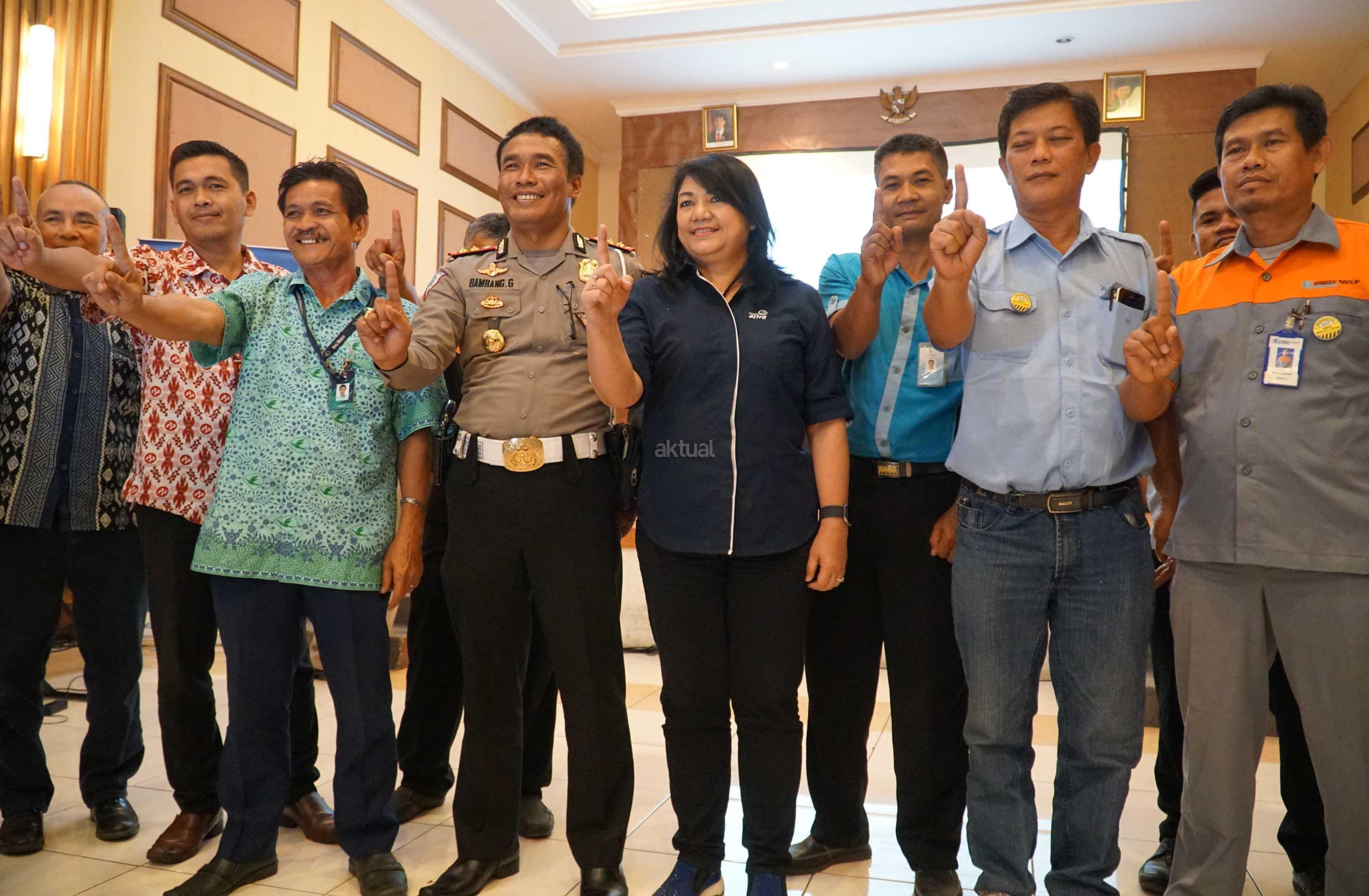 Perwakilan sopir bus angkutan mudik yang ada di wilayah Jabodetabek berfoto bersama dengan Chief Corporate Services Officer Asuransi Astra, Ida R. M. Sigalingging dan Kasubdit Dikyasa Ditlantas Polda Metro Jaya, AKBP Bambang Gunawan,S.Pd,MH seusai membacakan Ikrar Tertib Berlalu Lintas di TMC.Polda Metro Jaya,Sabtu (20/5).Menjelang bulan Ramadan 1438H/2017 Asuransi Astra menyiapkan 100 miliar rupiah untuk melindungi ribuan sopir bus angkutan mudik dari berbagai Perusahaan Otobus (PO) yang ada di wilayah Jabodetabek. AKTUAL/Eko S Hilman