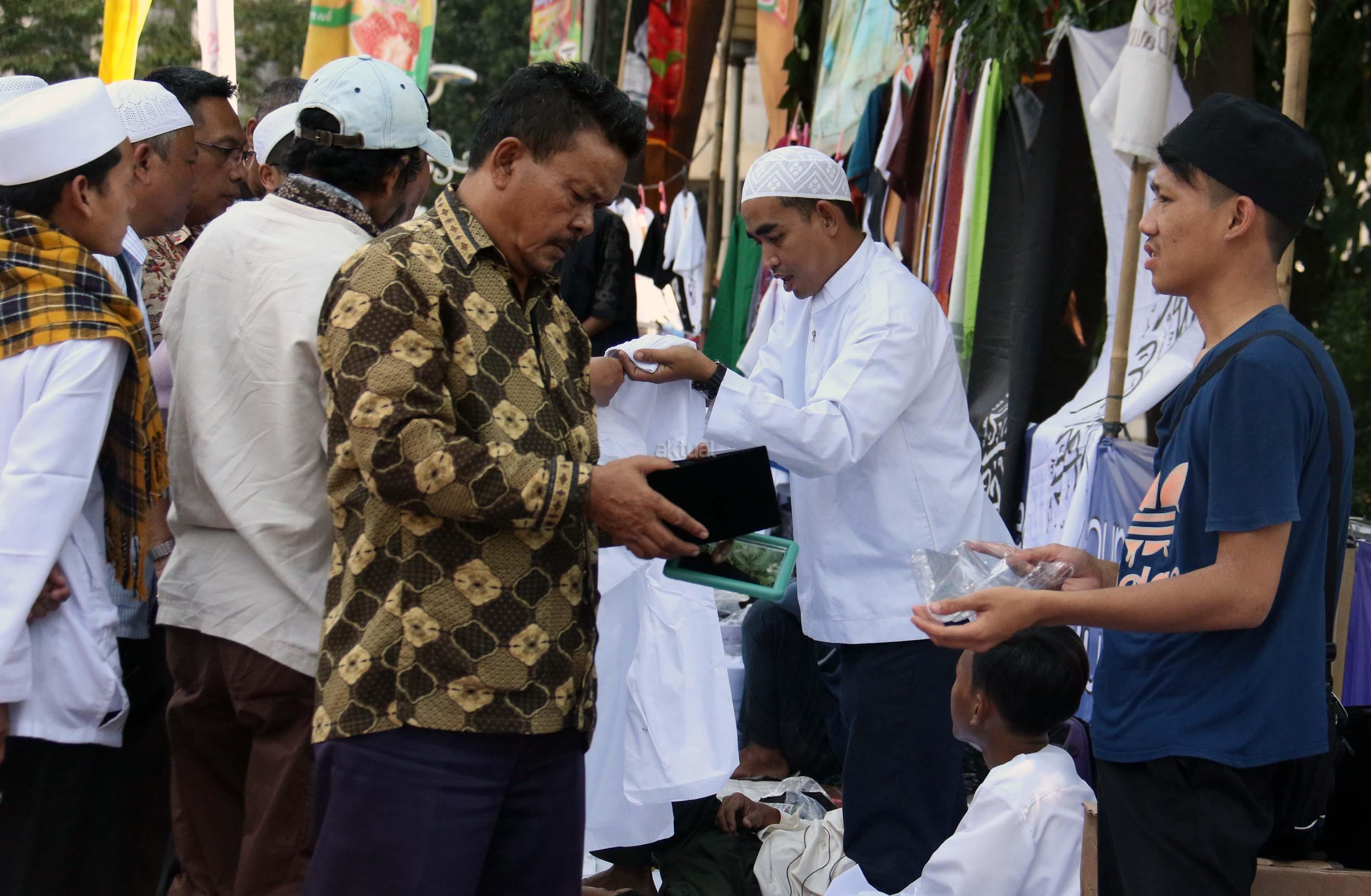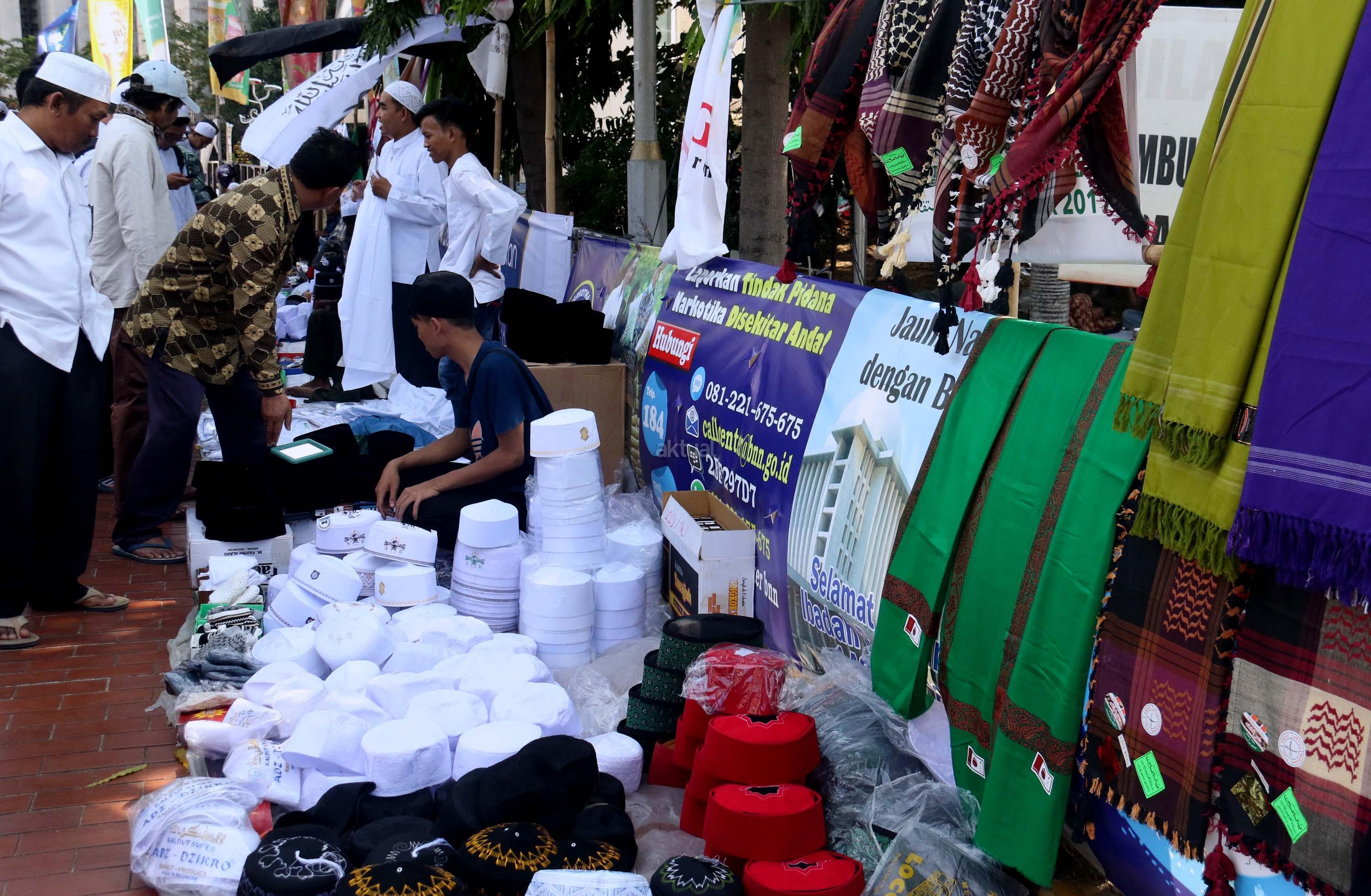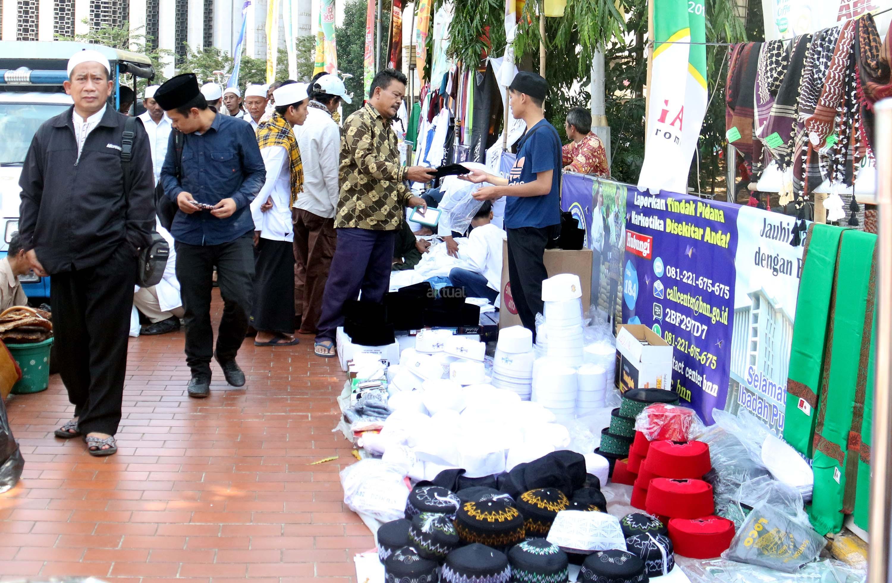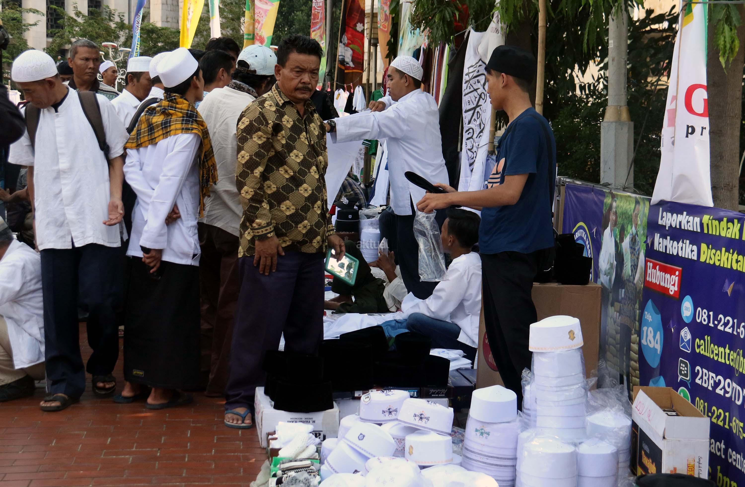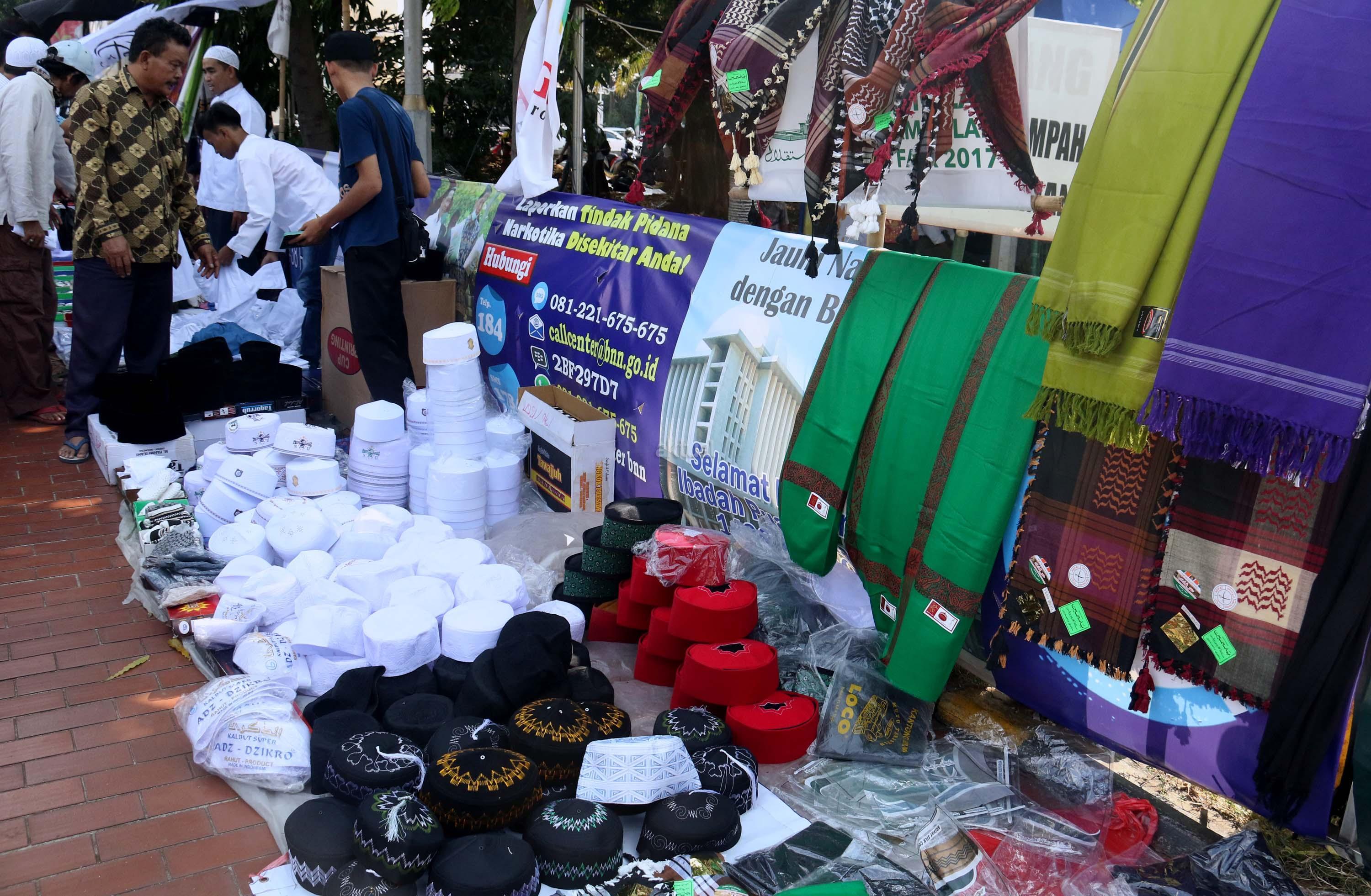 Calon pembeli mencoba peci usai sholat Jumat di pelataran halaman Masjid Istiqlal, Jakarta, Jumat (9/6/2017). Berkah ramadhan oleh sejumlah pedagang kaki lima (PKL) dikawasan pelataran Masjid Istiqlal. AKTUAL/Munzir