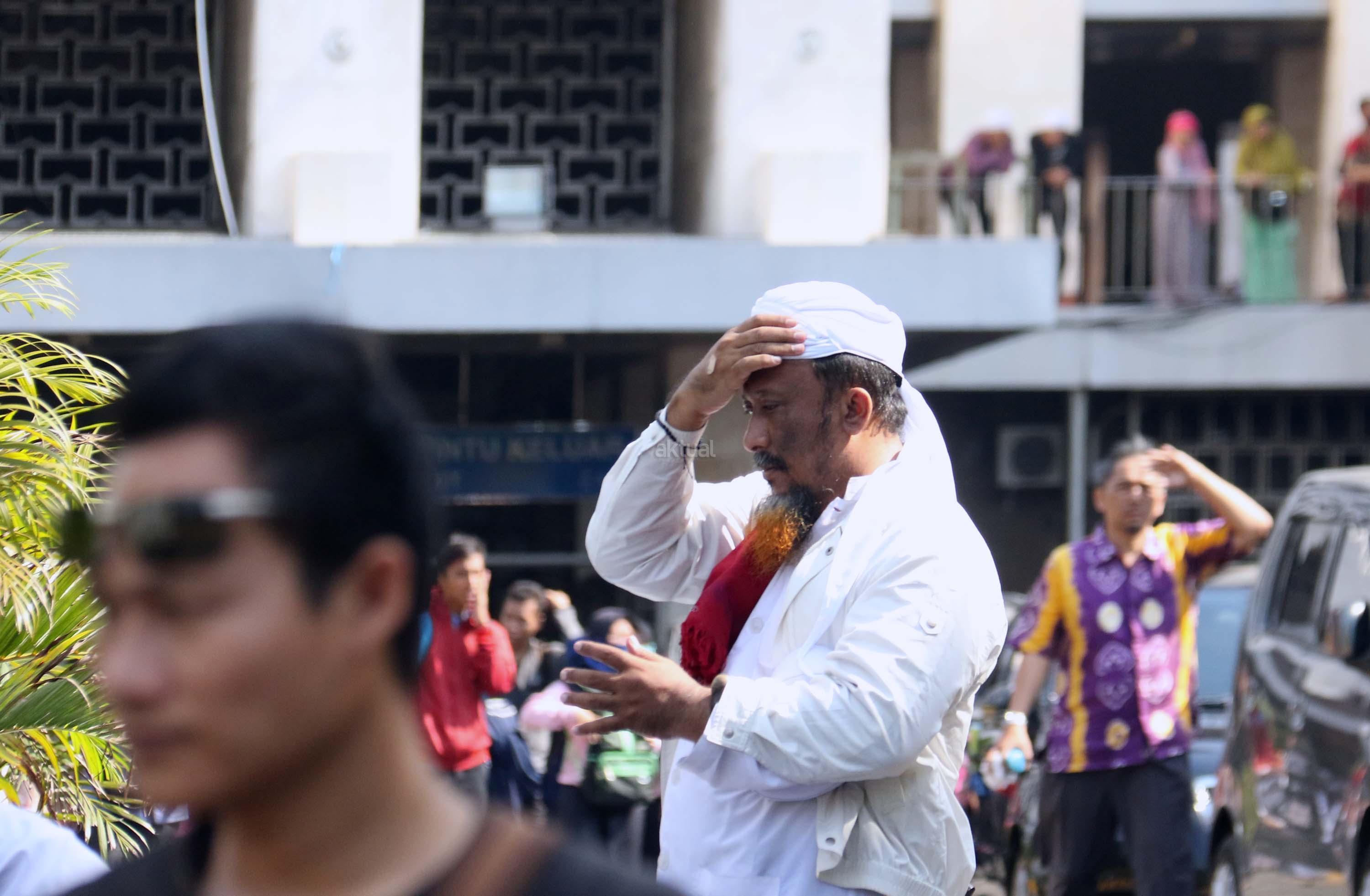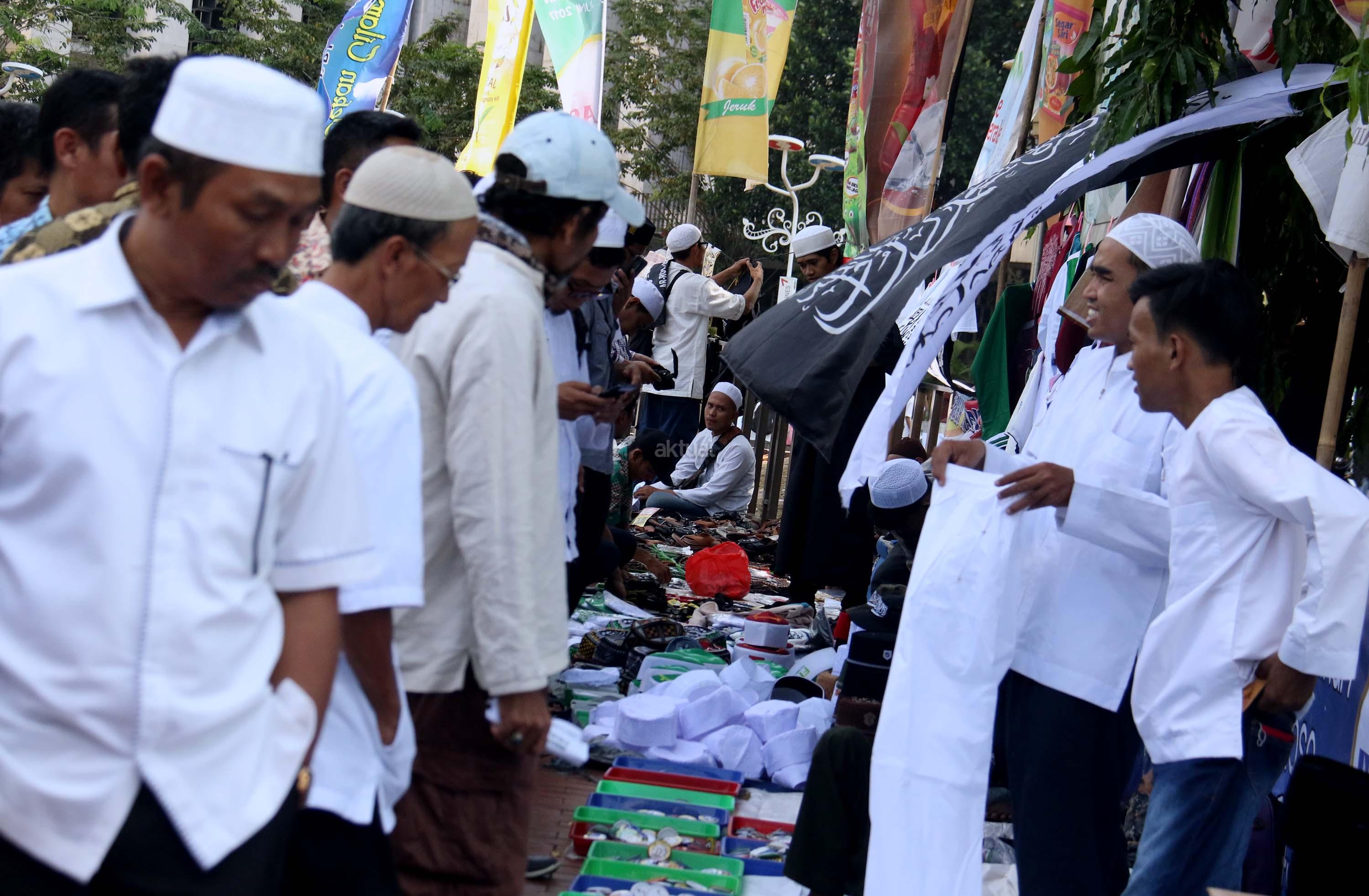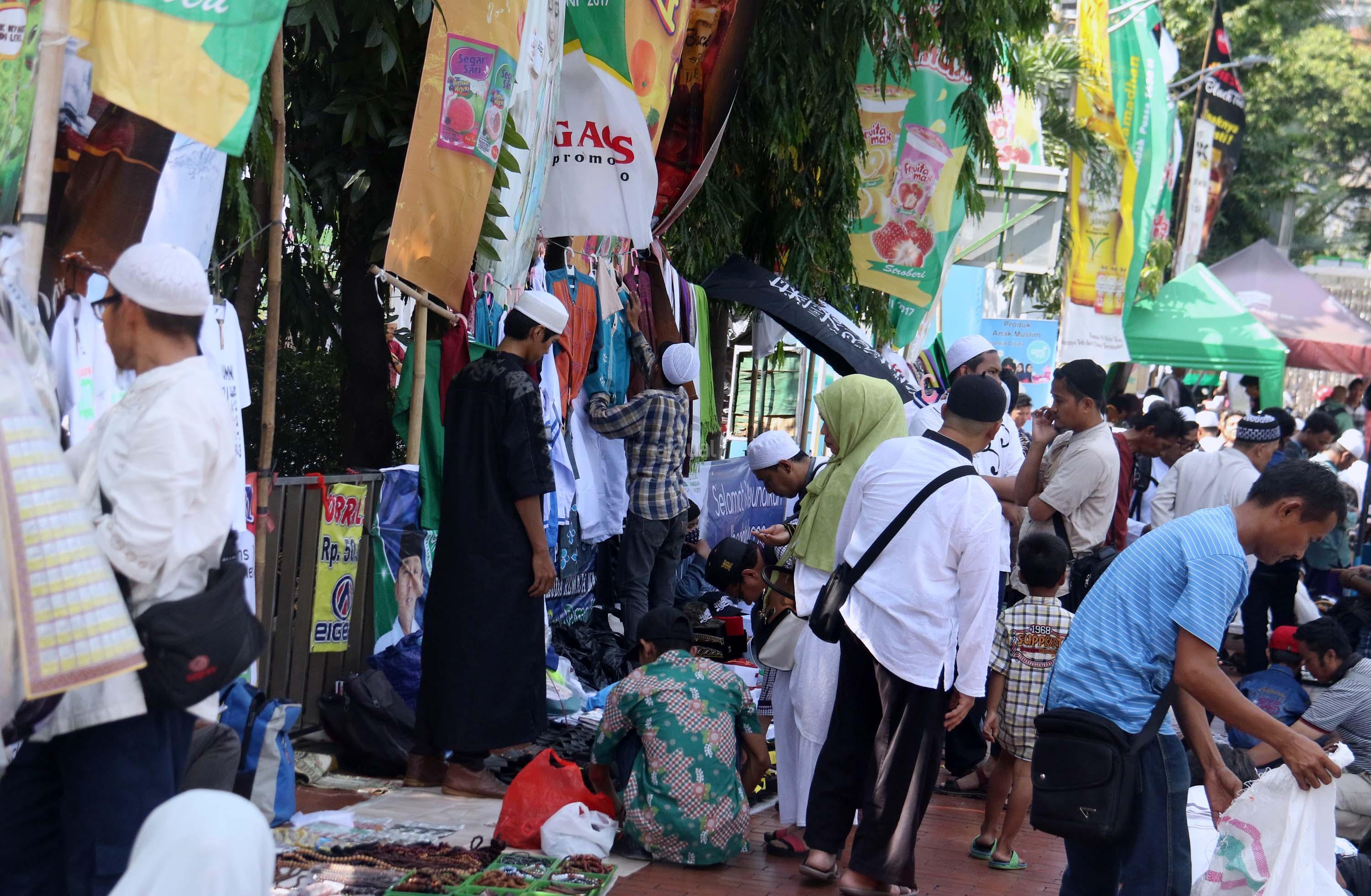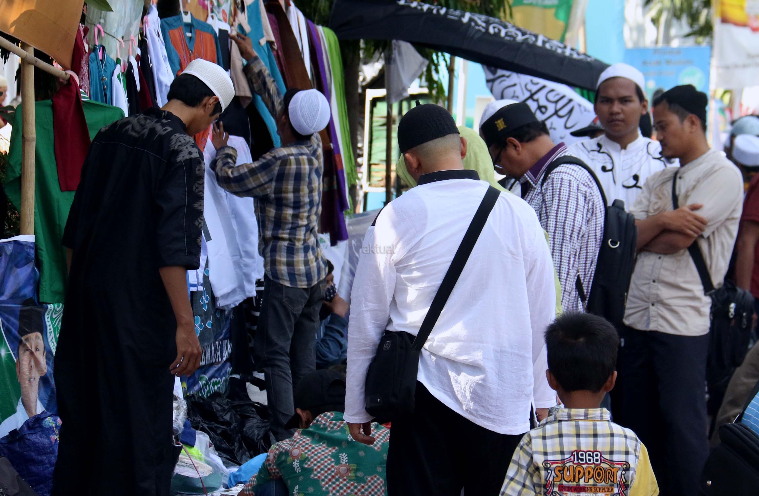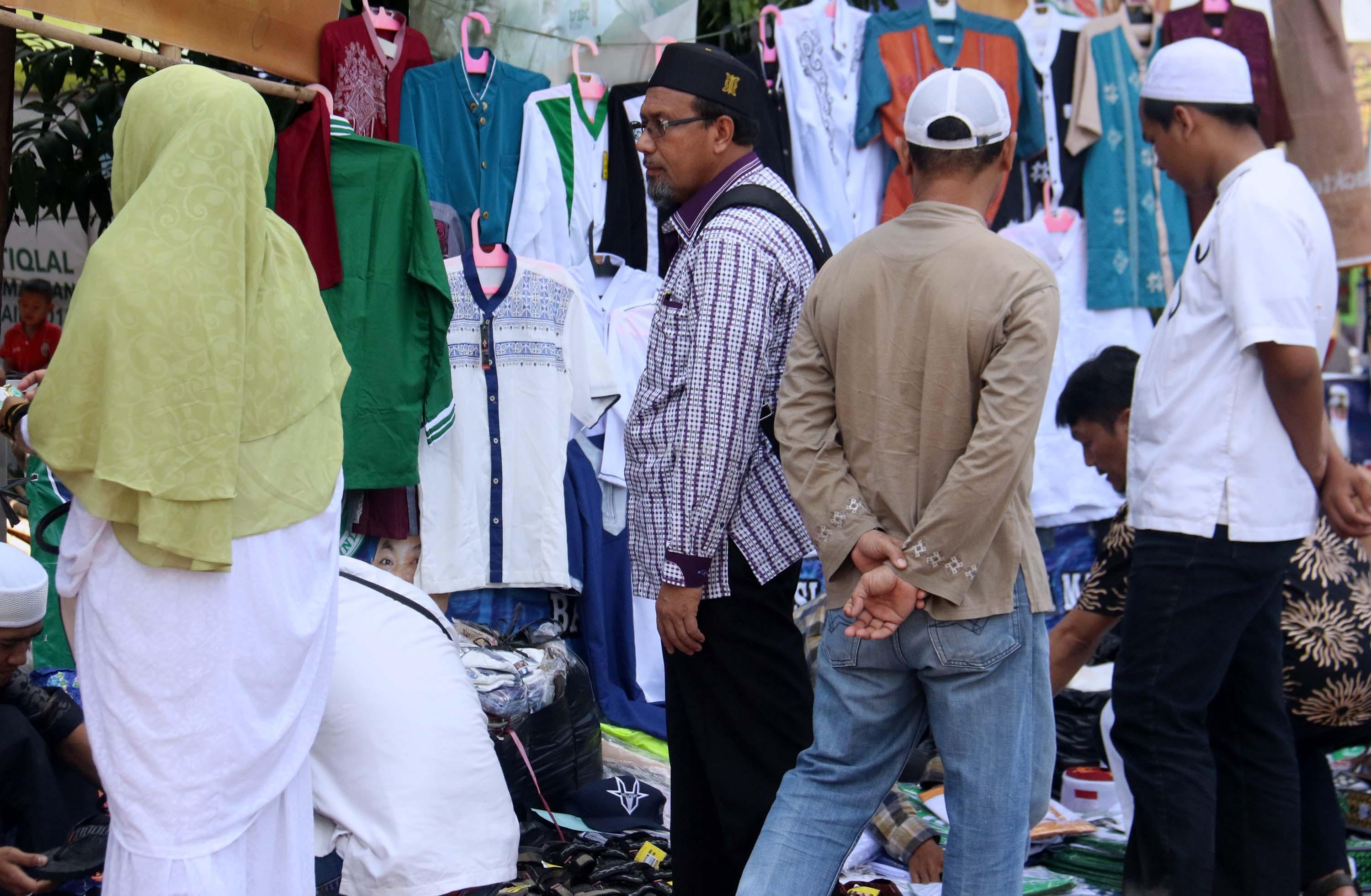 Calon pembeli mencoba peci usai sholat Jumat di pelataran halaman Masjid Istiqlal, Jakarta, Jumat (9/6/2017). Berkah ramadhan oleh sejumlah pedagang kaki lima (PKL) dikawasan pelataran Masjid Istiqlal. AKTUAL/Munzir