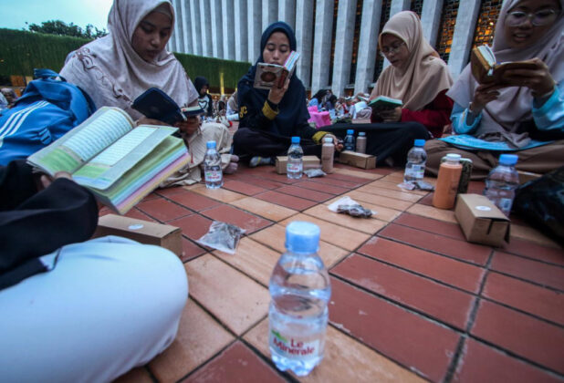 Suasana ngabuburit di Masjid Istiqlal, Minggu (2/3/2025). Umat muslim terlihat melakukan berbagai kegiatan seperti tadarus Al-Quran, mendengarkan tausiah, dan dzikir.