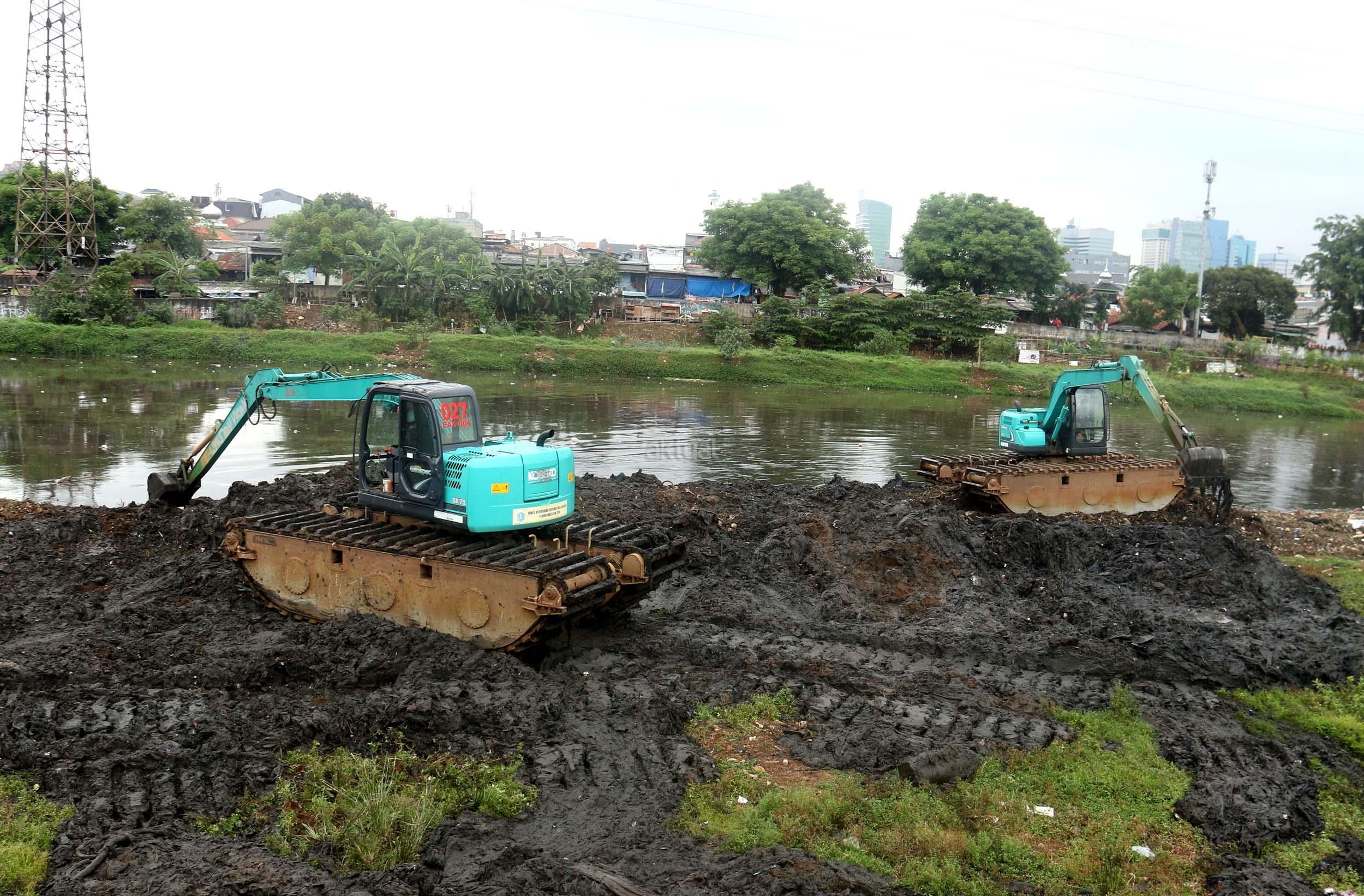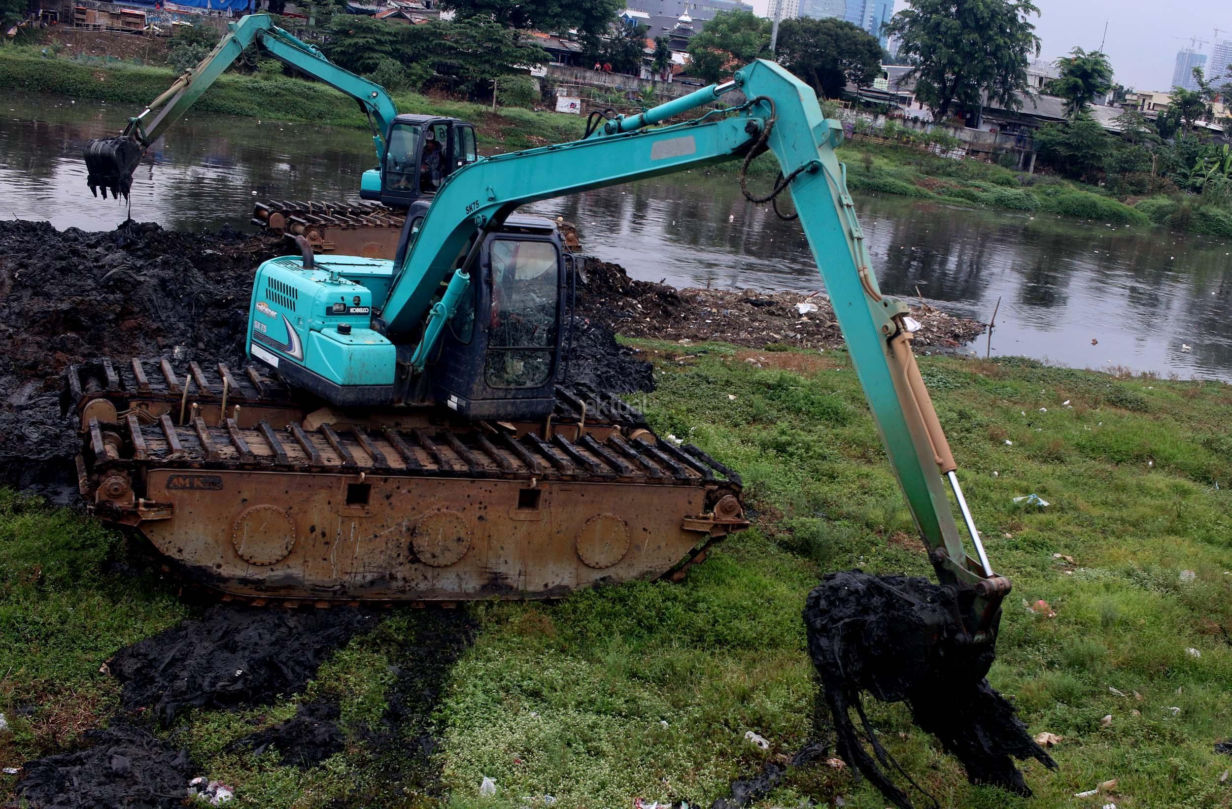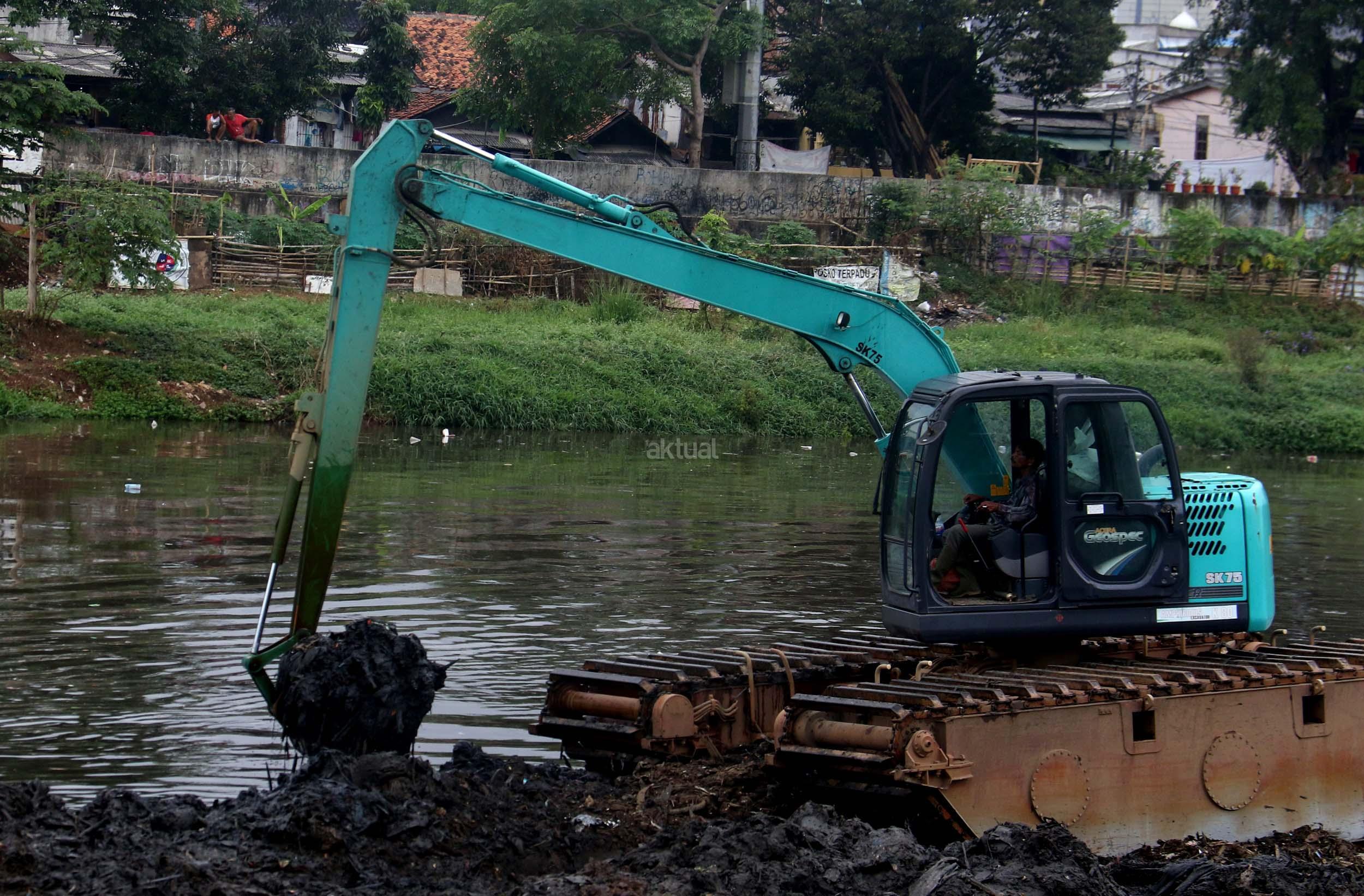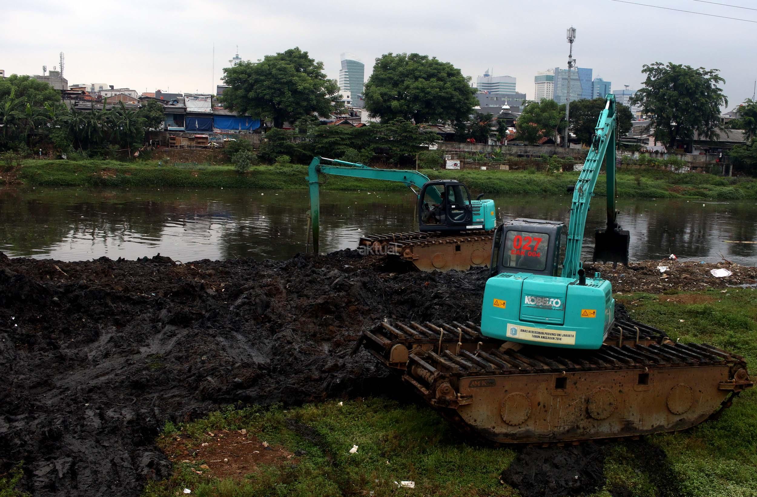 Petugas Dinas Bina Marga dan Pengairan mengoperasikan alat berat untuk mengangkut lumpur yang menumpuk di aliran sungai Ciliwung, di kawasan Tanah Abang, Jakarta, Jumat (6/1/2017). Normalisasi sungai tersebut sebagai langkah antisipasi banjir di musim hujan. AKTUAL/Munzir
