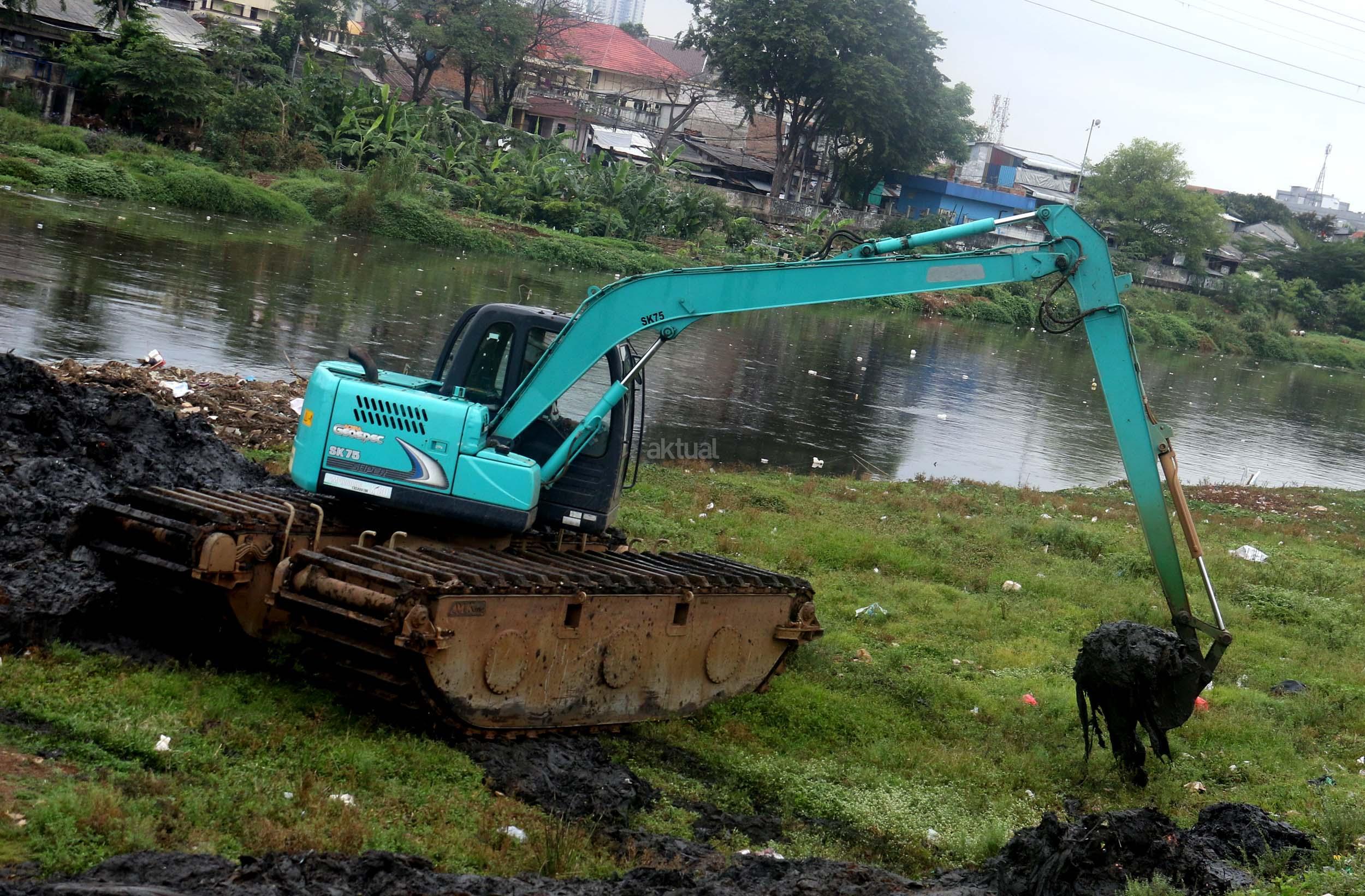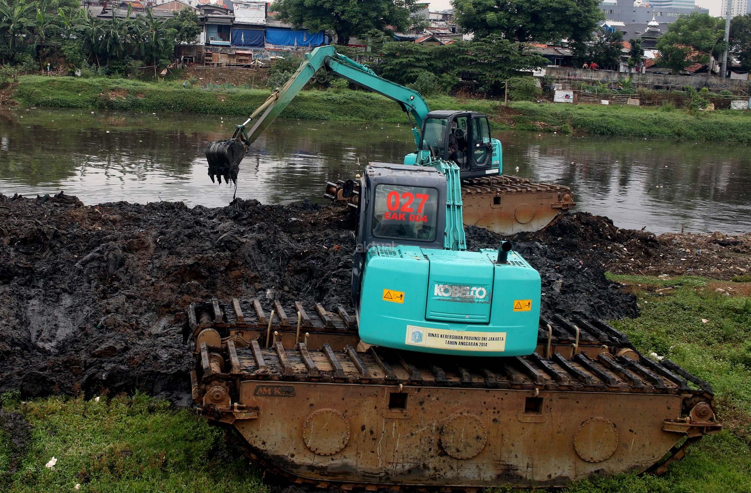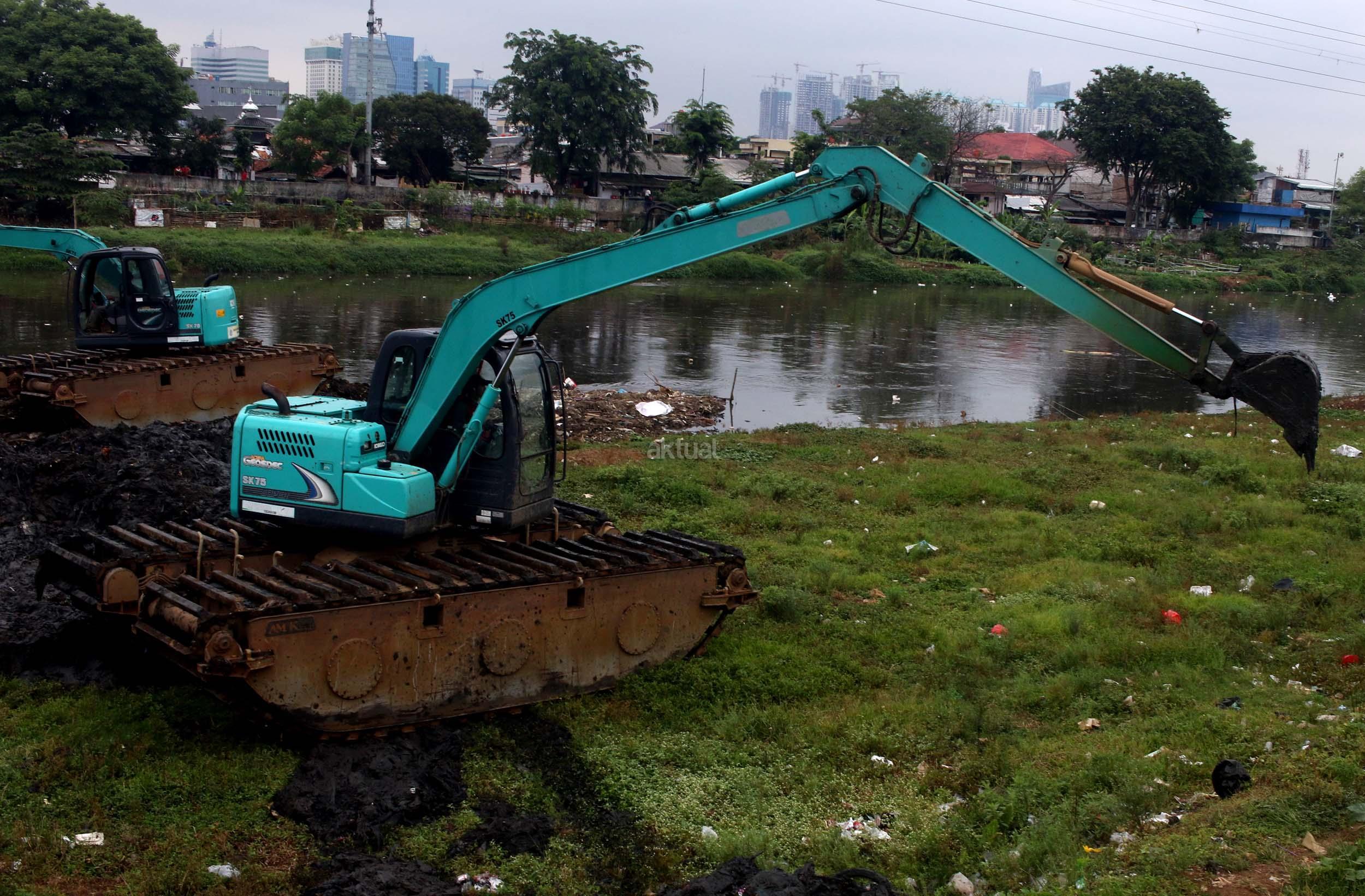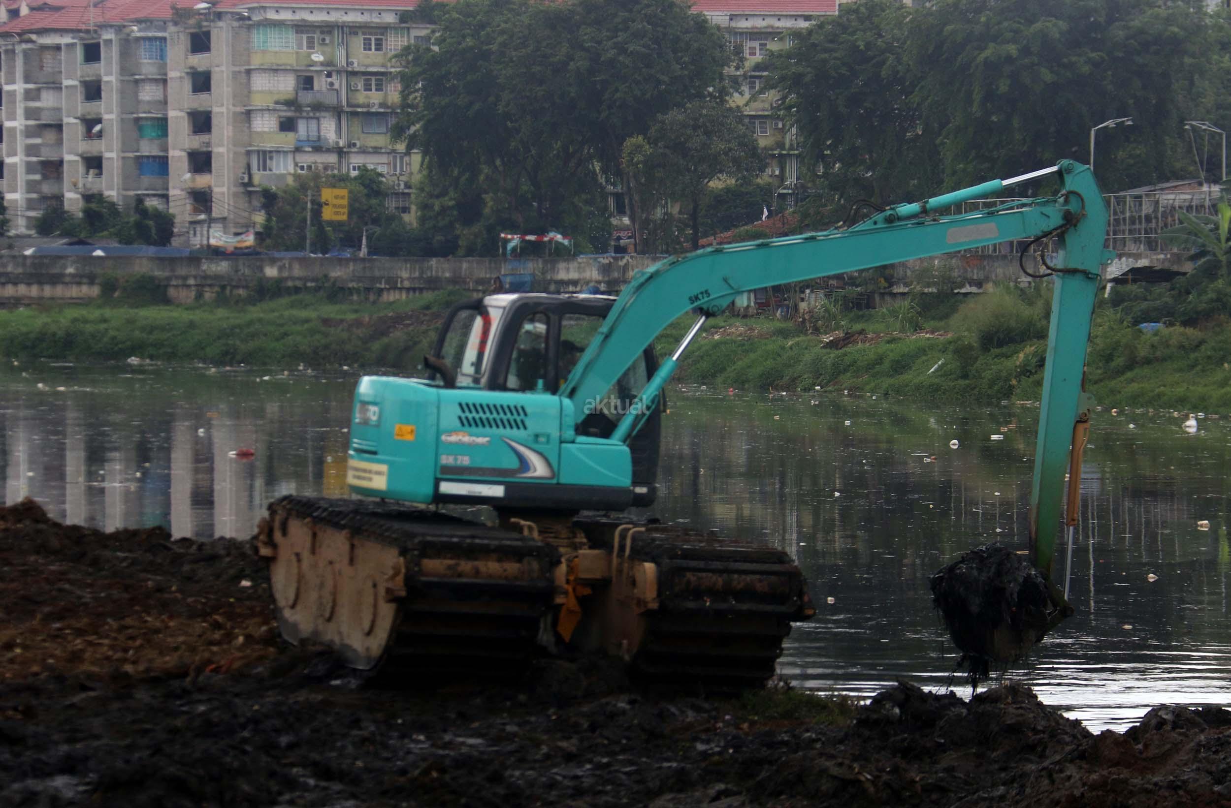 Petugas Dinas Bina Marga dan Pengairan mengoperasikan alat berat untuk mengangkut lumpur yang menumpuk di aliran sungai Ciliwung, di kawasan Tanah Abang, Jakarta, Jumat (6/1/2017). Normalisasi sungai tersebut sebagai langkah antisipasi banjir di musim hujan. AKTUAL/Munzir