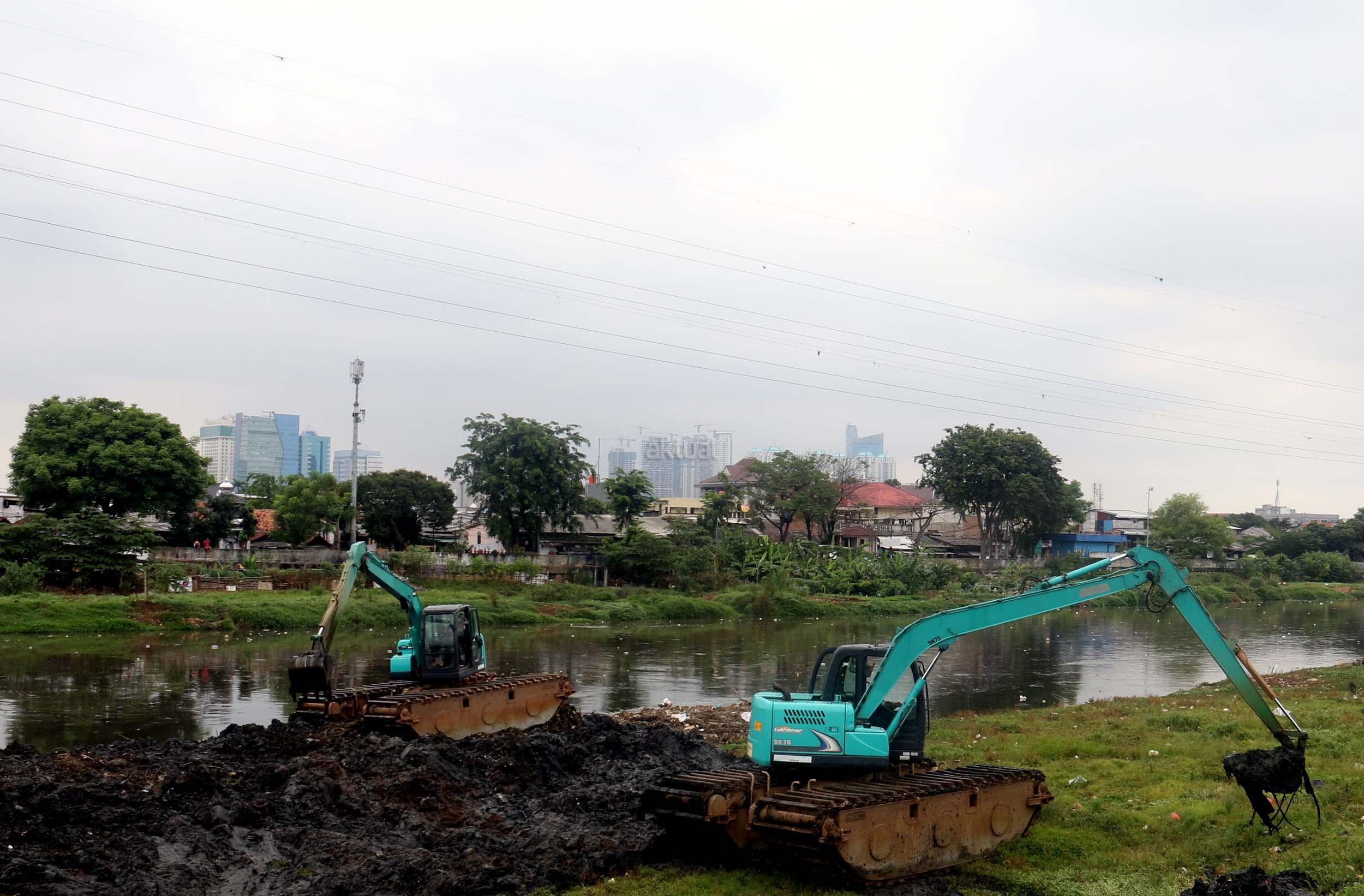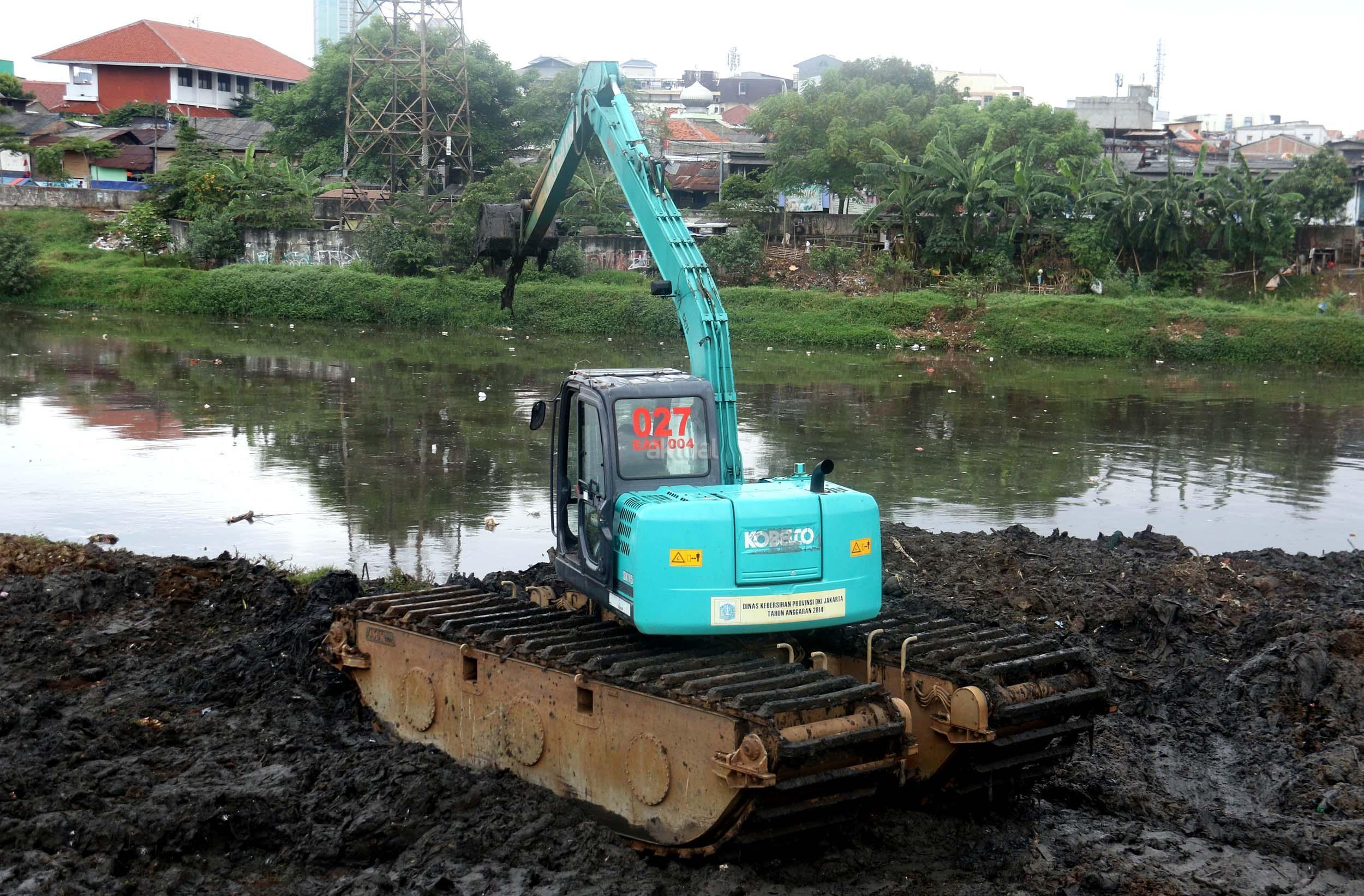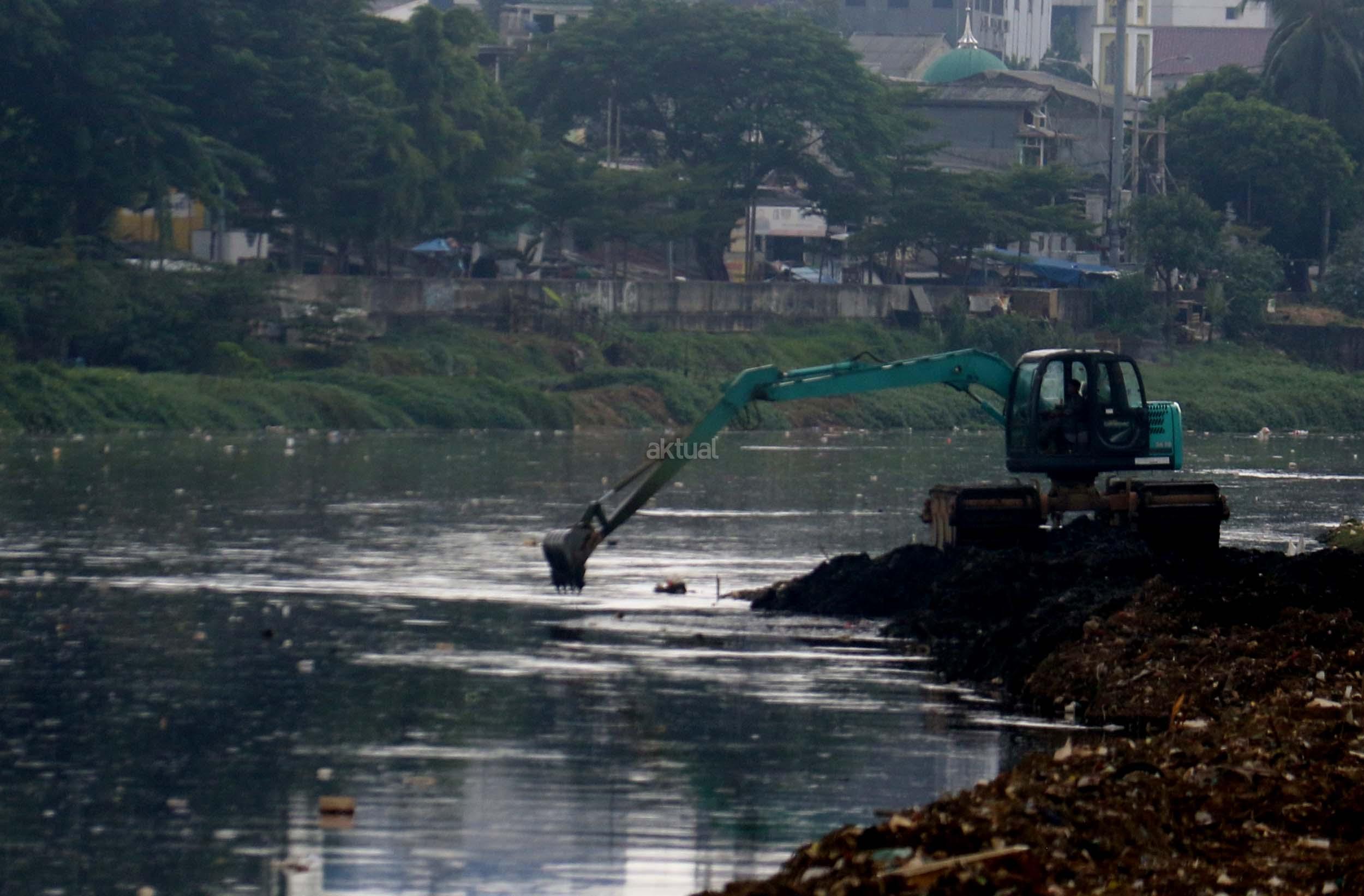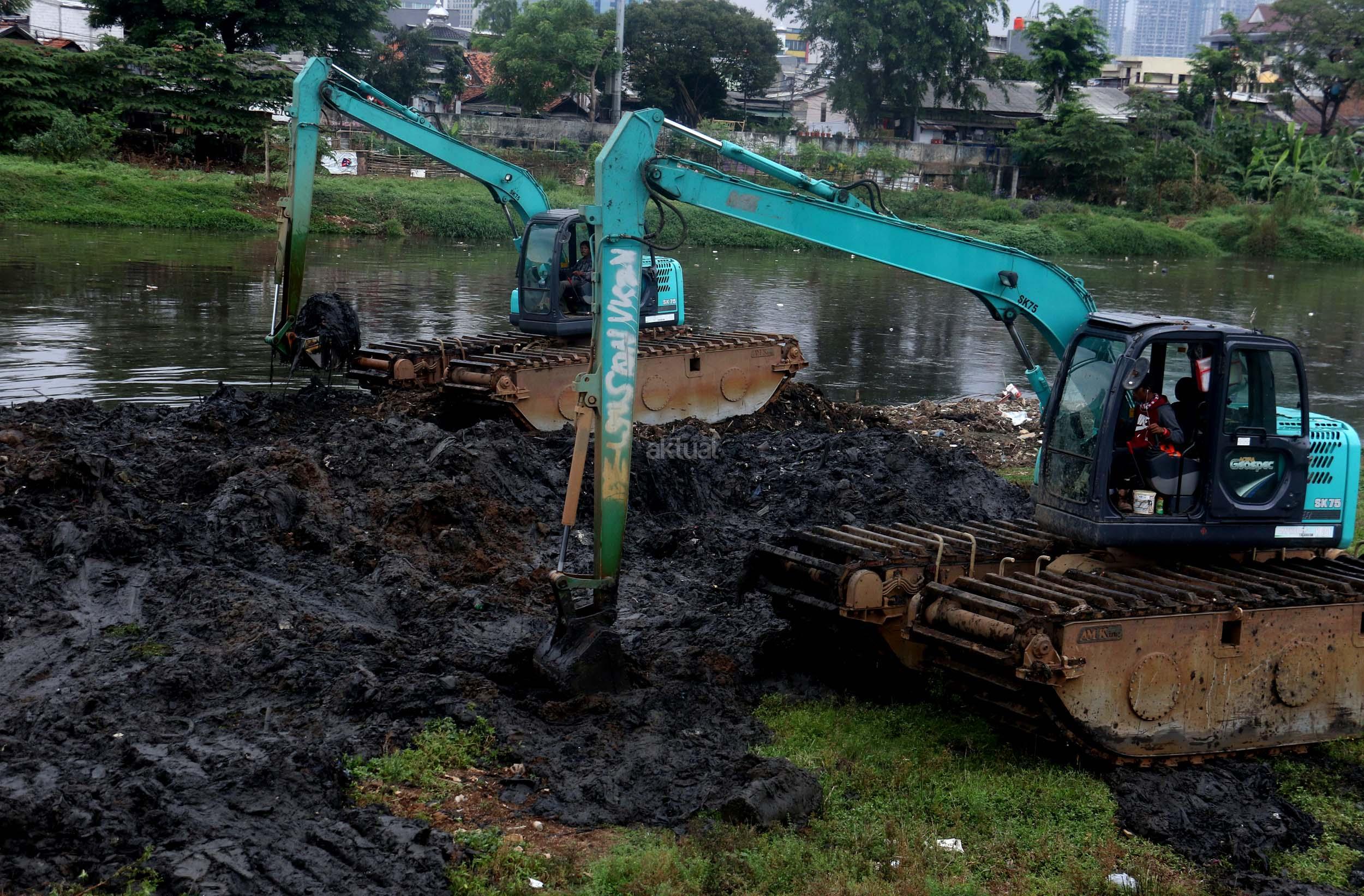 Petugas Dinas Bina Marga dan Pengairan mengoperasikan alat berat untuk mengangkut lumpur yang menumpuk di aliran sungai Ciliwung, di kawasan Tanah Abang, Jakarta, Jumat (6/1/2017). Normalisasi sungai tersebut sebagai langkah antisipasi banjir di musim hujan. AKTUAL/Munzir
